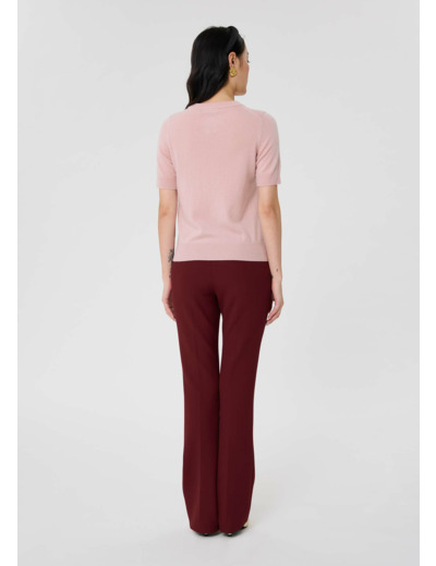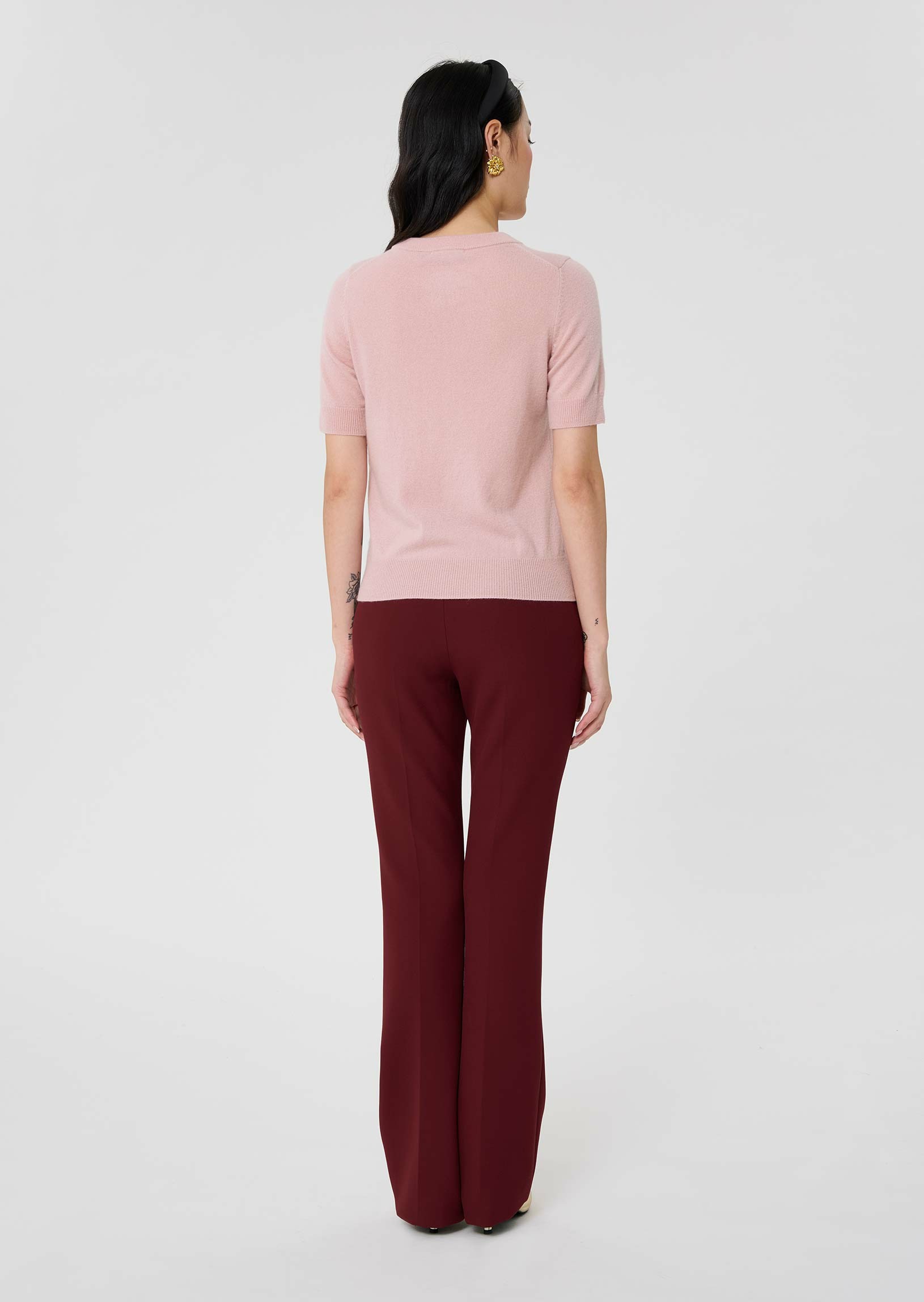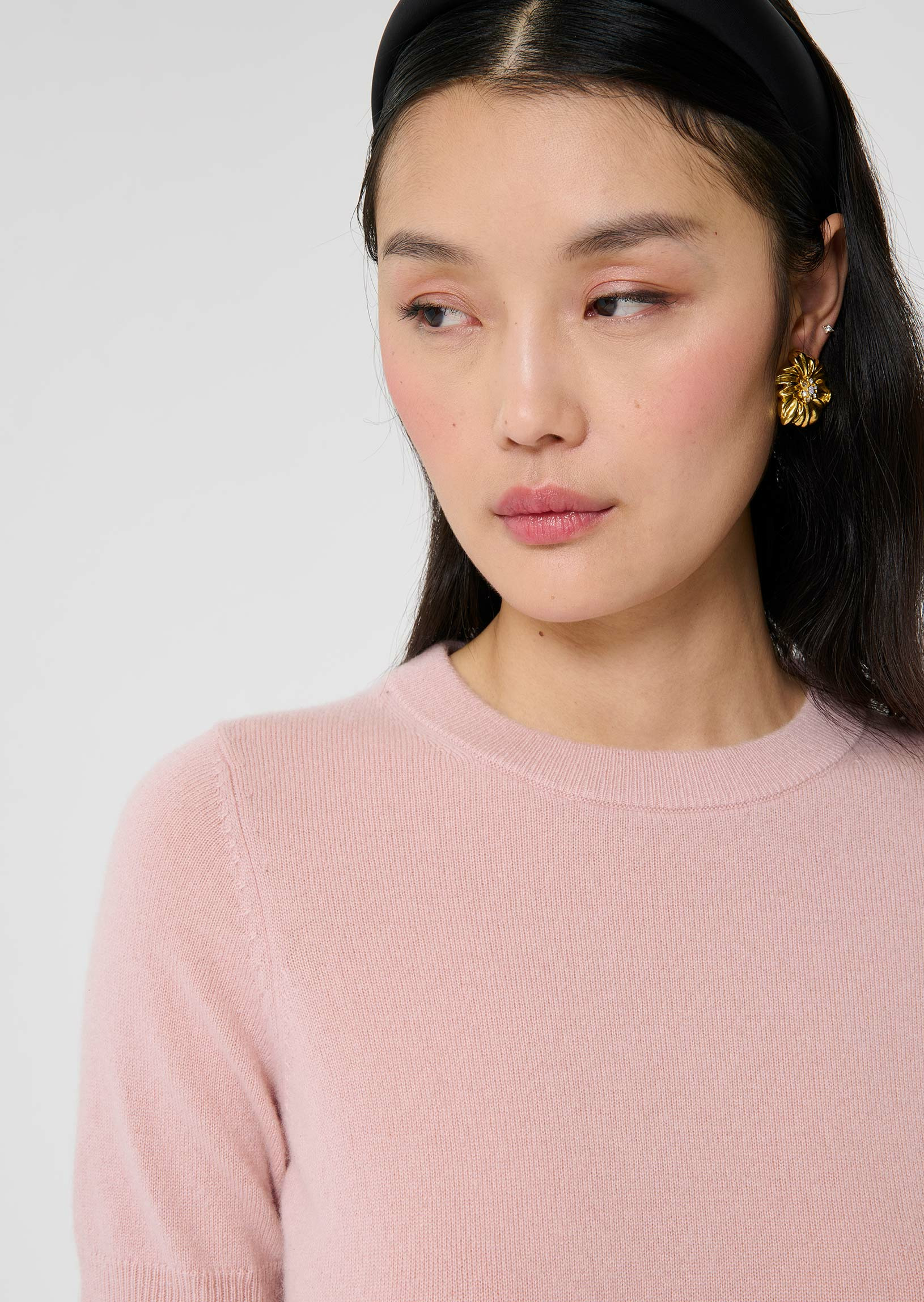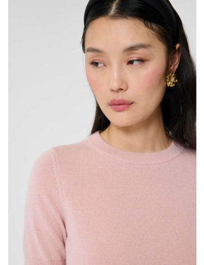 Ce pull vieux rose en cachemire possède des manches courtes et un col rond. Des bords-cotes ton sur ton décorent le bas, les extrémités des manches et l'encolure.