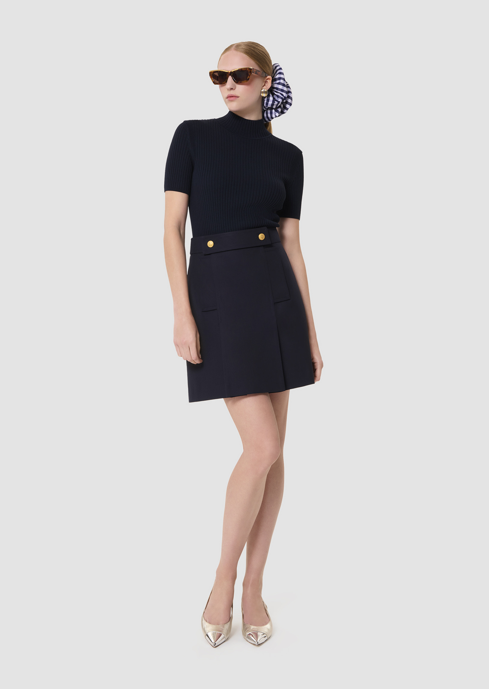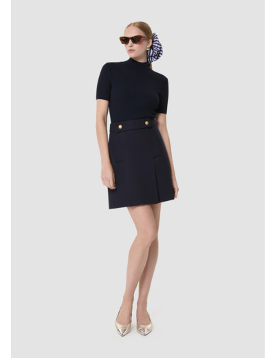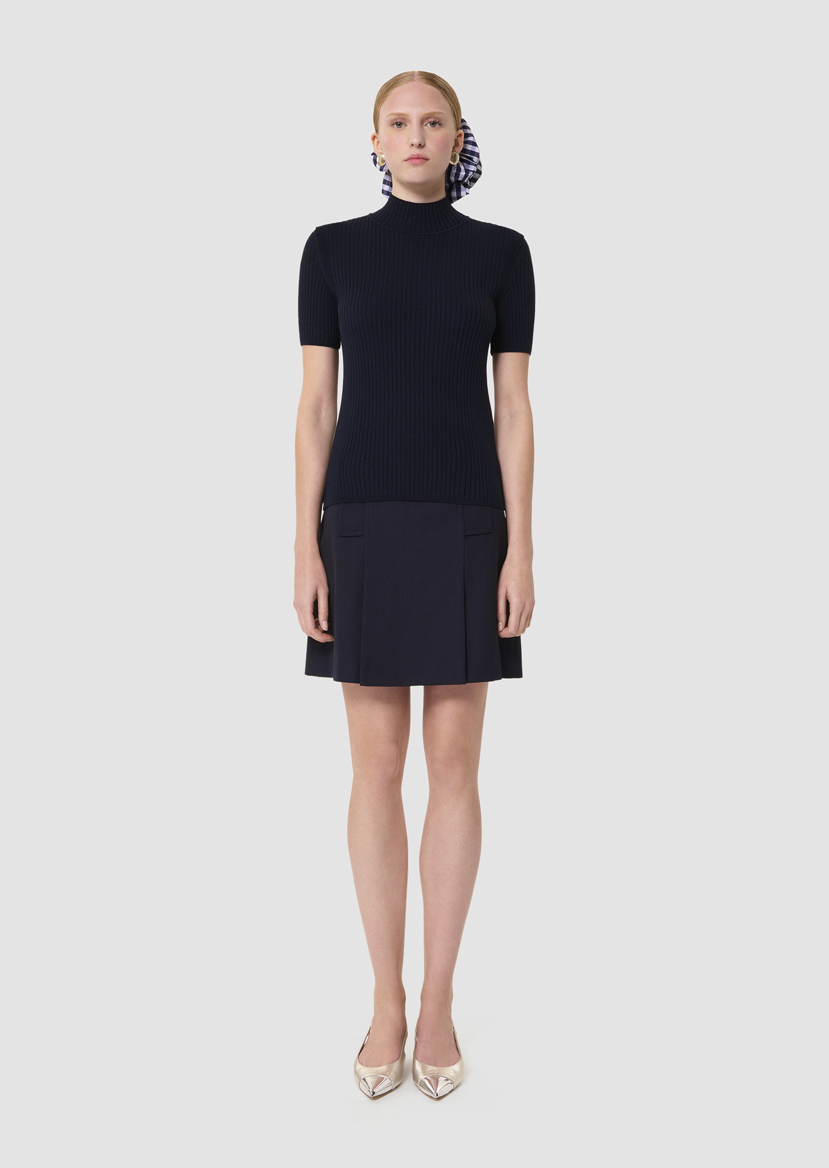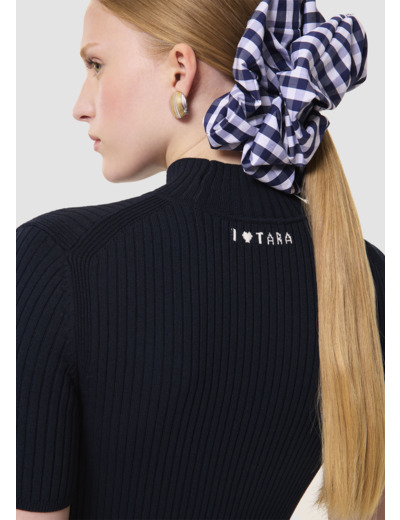Ce sous-pull bleu nuit en maille côtelée est presque seconde peau. Il possède un petit col montant et des manches courtes. Son twist se trouve dans l'inscription "I love Tara" brodée en jacquard au niveau de la nuque.