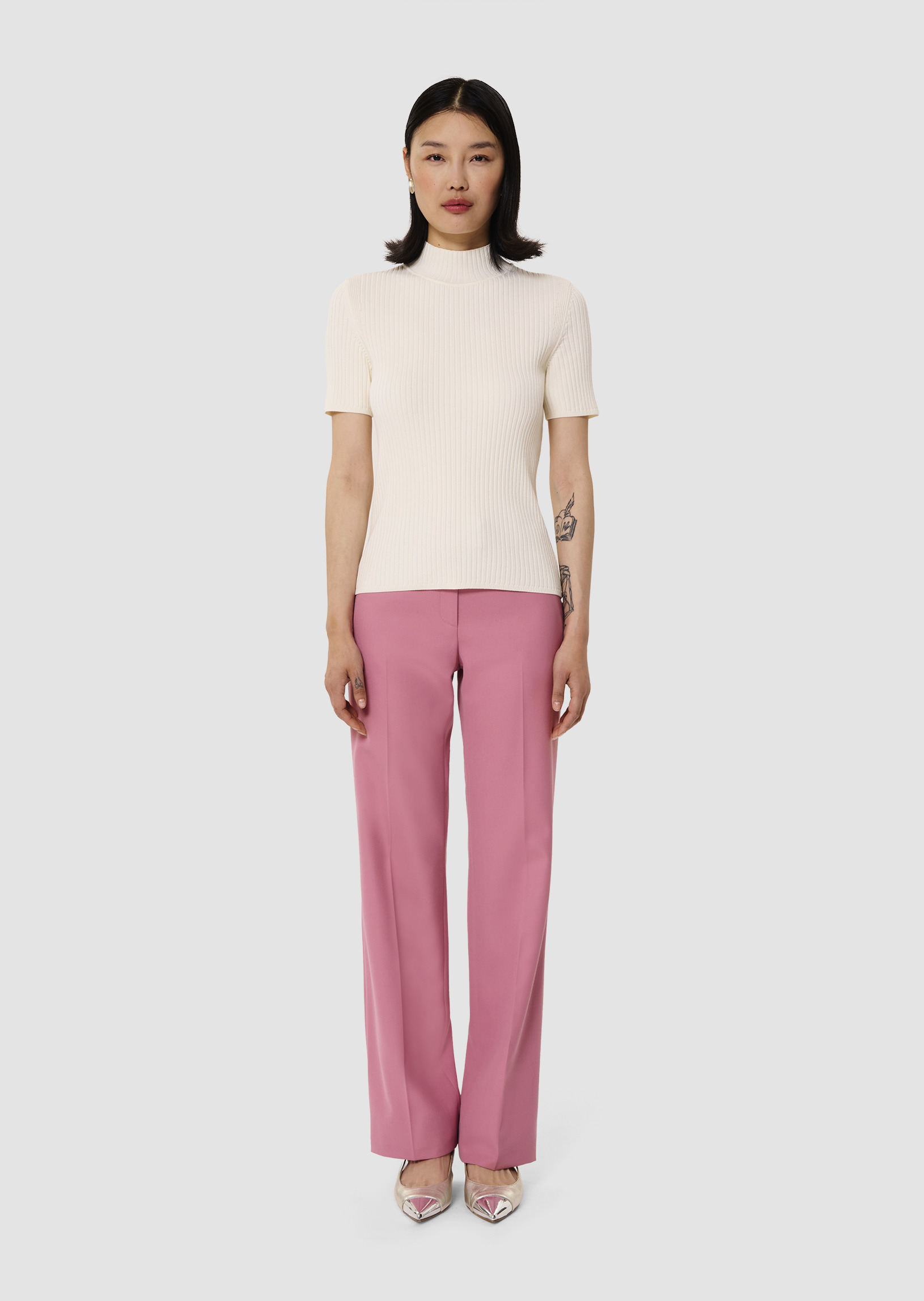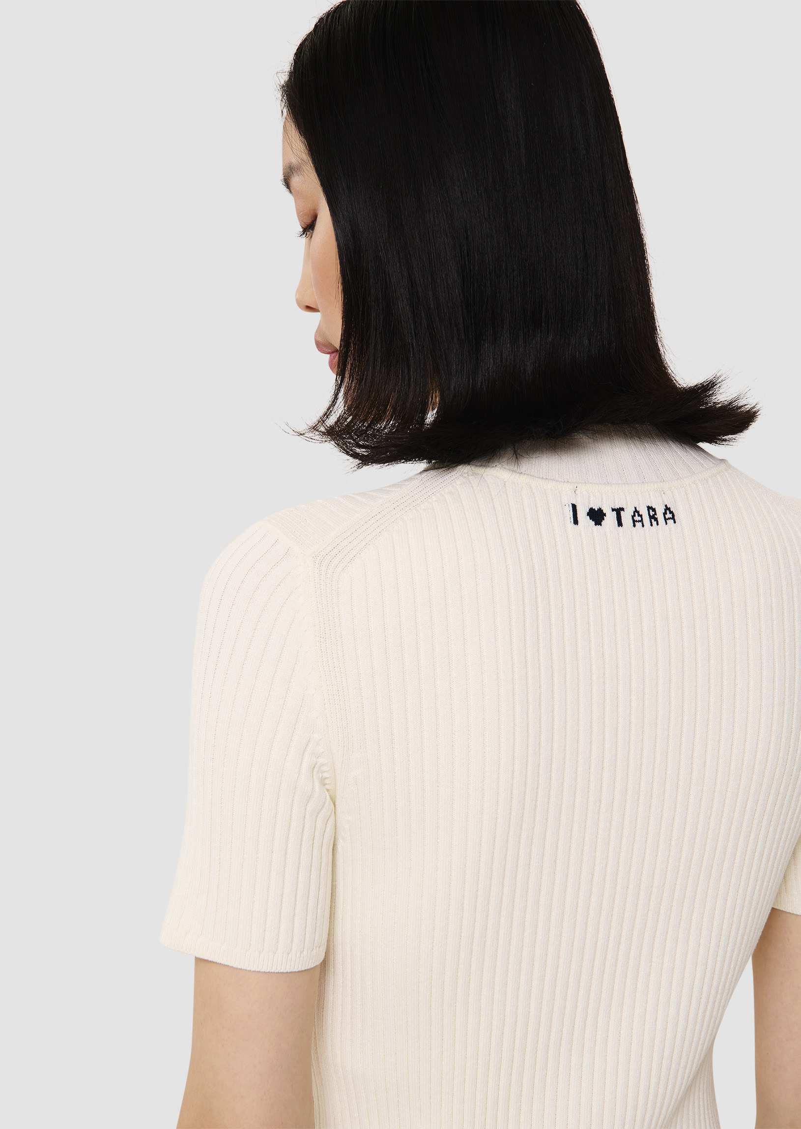 Ce sous-pull écru en maille côtelée est presque seconde peau. Il possède un petit col montant et des manches courtes. Son twist se trouve dans l'inscription "I love Tara" brodée en jacquard au niveau de la nuque.