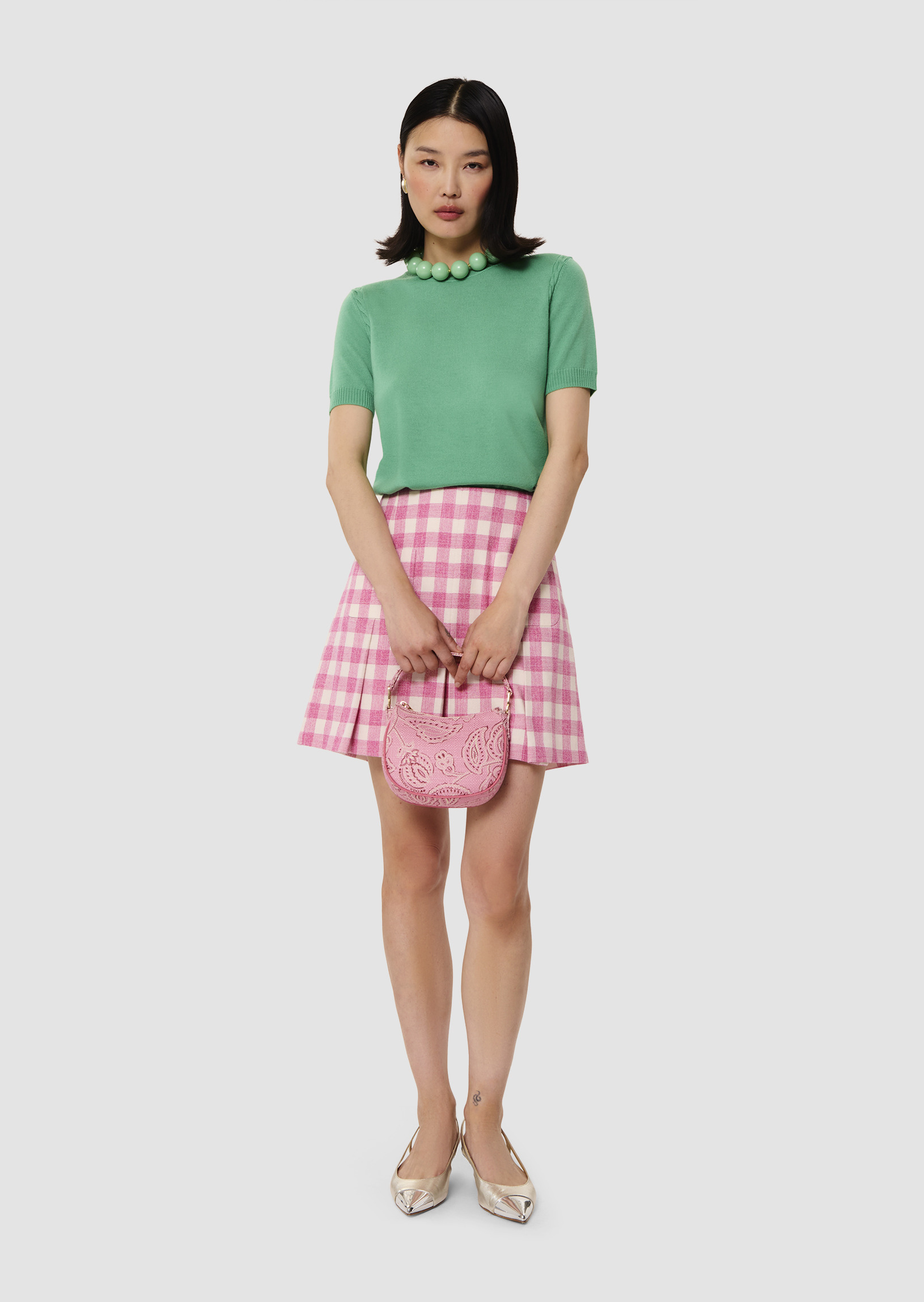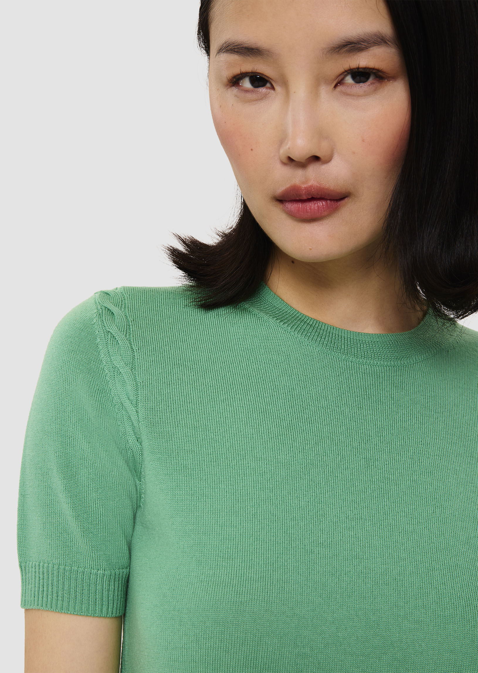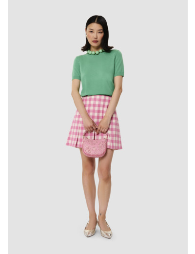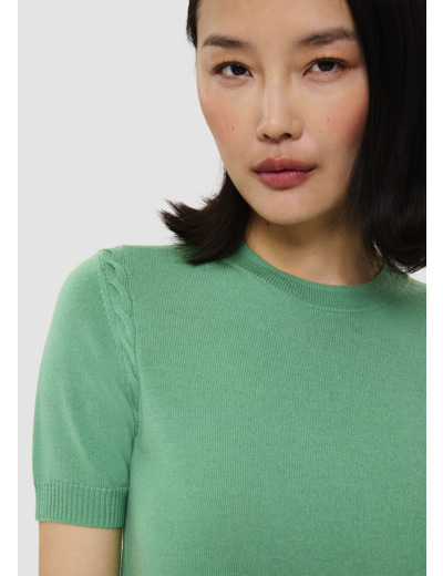 Ce pull fin couleur vert pistache en laine mérinos possède une encolure ronde et des manches courtes. De délicats détails de maille tressée ton sur ton décorent les emmanchures. On le porte en twinset avec le gilet Ginno assorti.