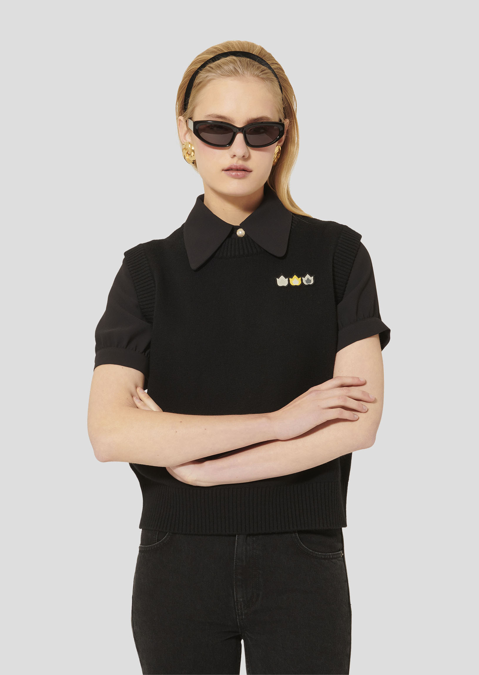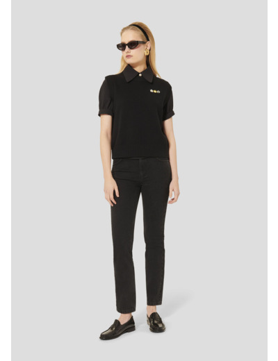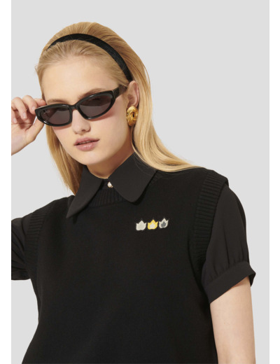 Ce pull noir en laine et en coton est sans manches. Son originalité réside dans les petites flammes brodées au niveau de la poitrine rappelant notre motif phare de la saison.