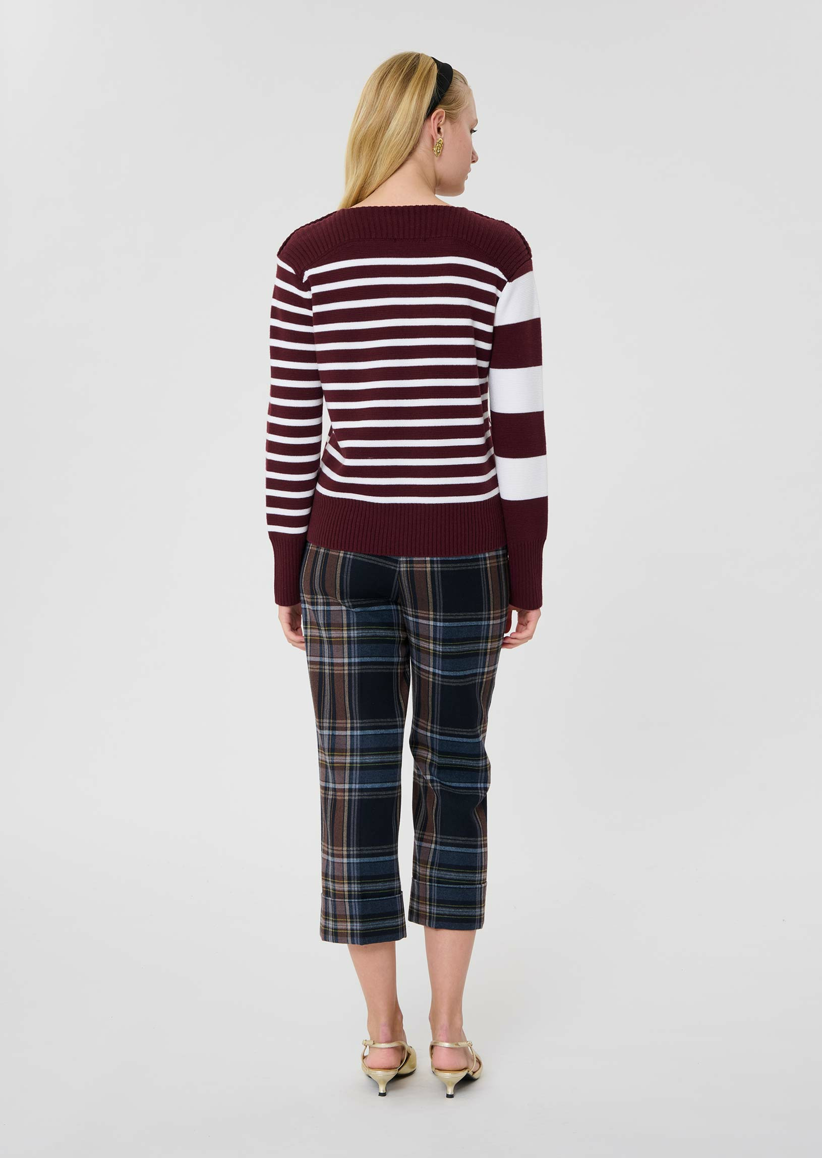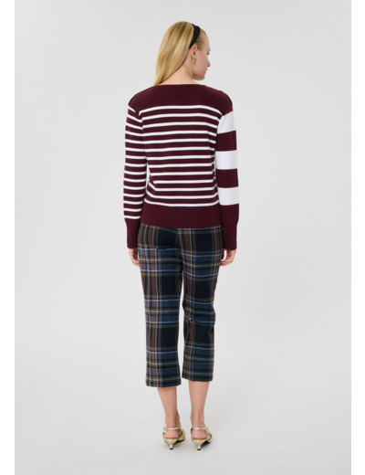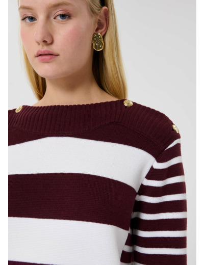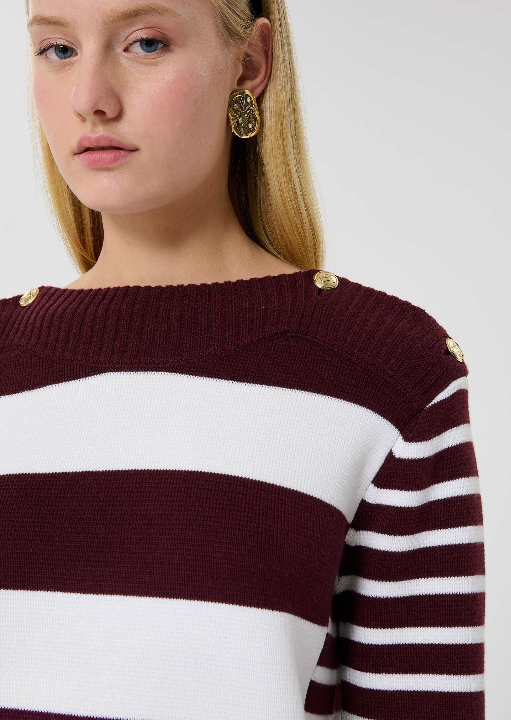 Ce pull marinière couleur écru à rayures bordeaux à grosse maille en laine possède des manches longues et une encolure ras du cou. Sa coupe est large et ses épaules sont décorées de gros boutons dorés.