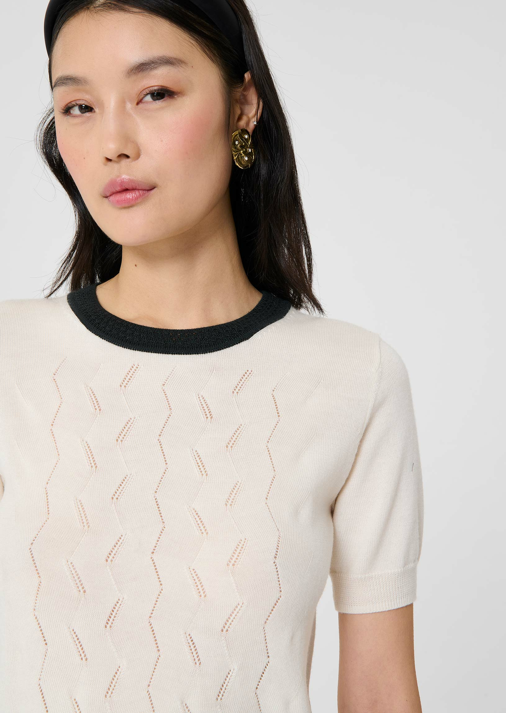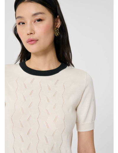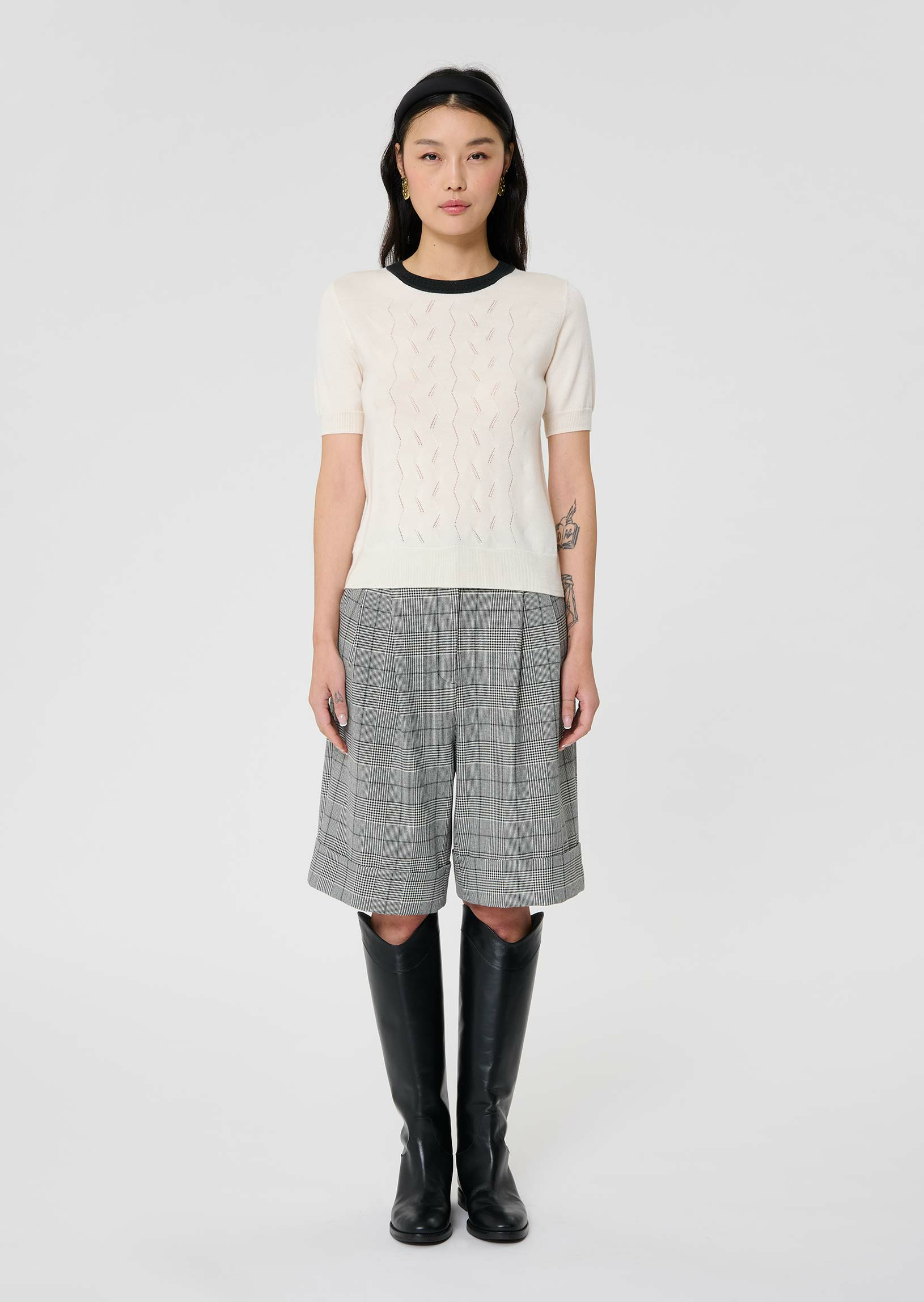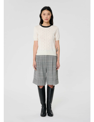 Ce pull court écru en laine possède des manches courtes et un col rond contrastant avec sa couleur noire. De larges bords cotés ton sur ton décorent le bas du pull et le bas des manches. Entièrement confectionné en laine mérinos, il est votre allié cette saison pour vous apporter confort et douceur.