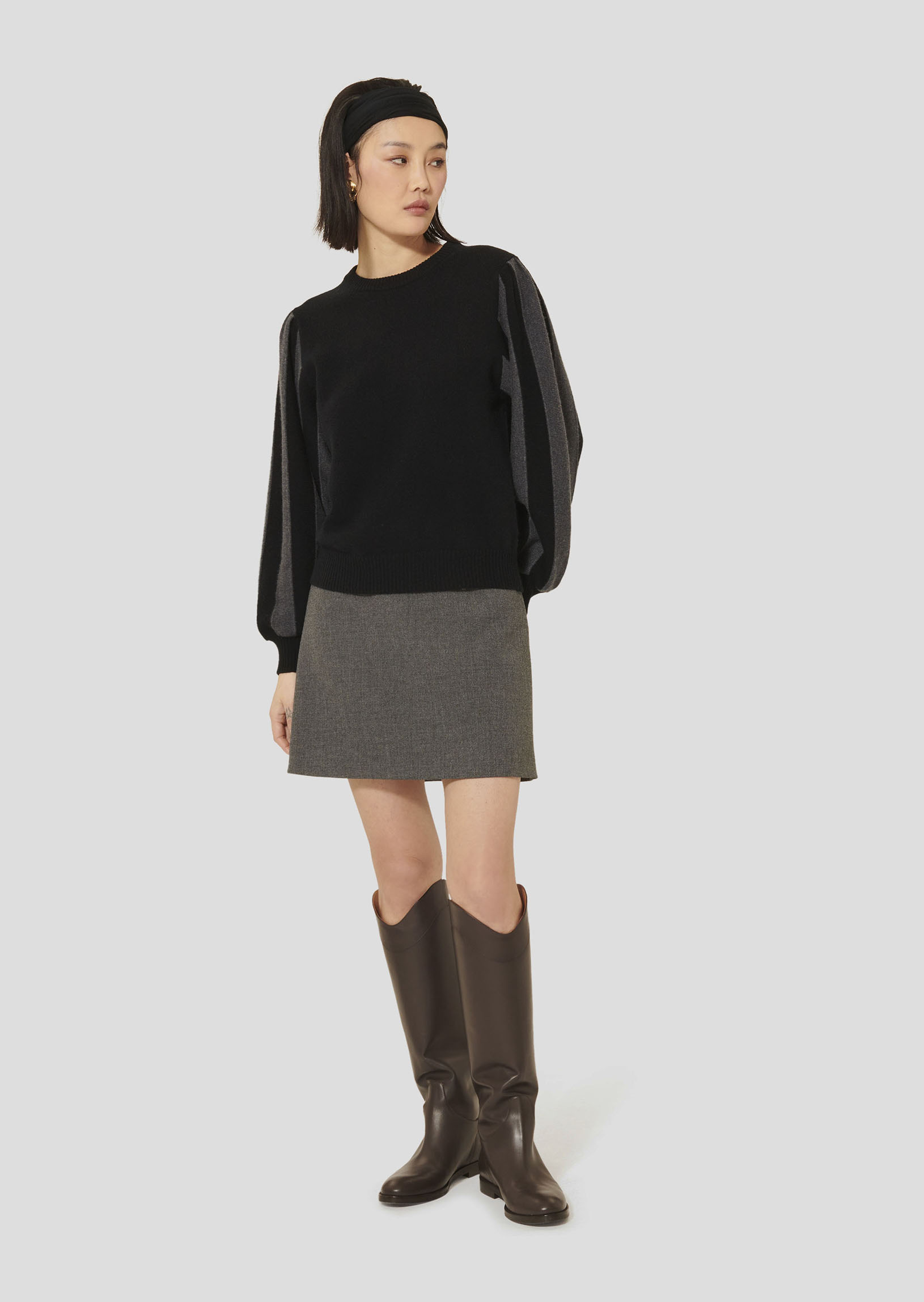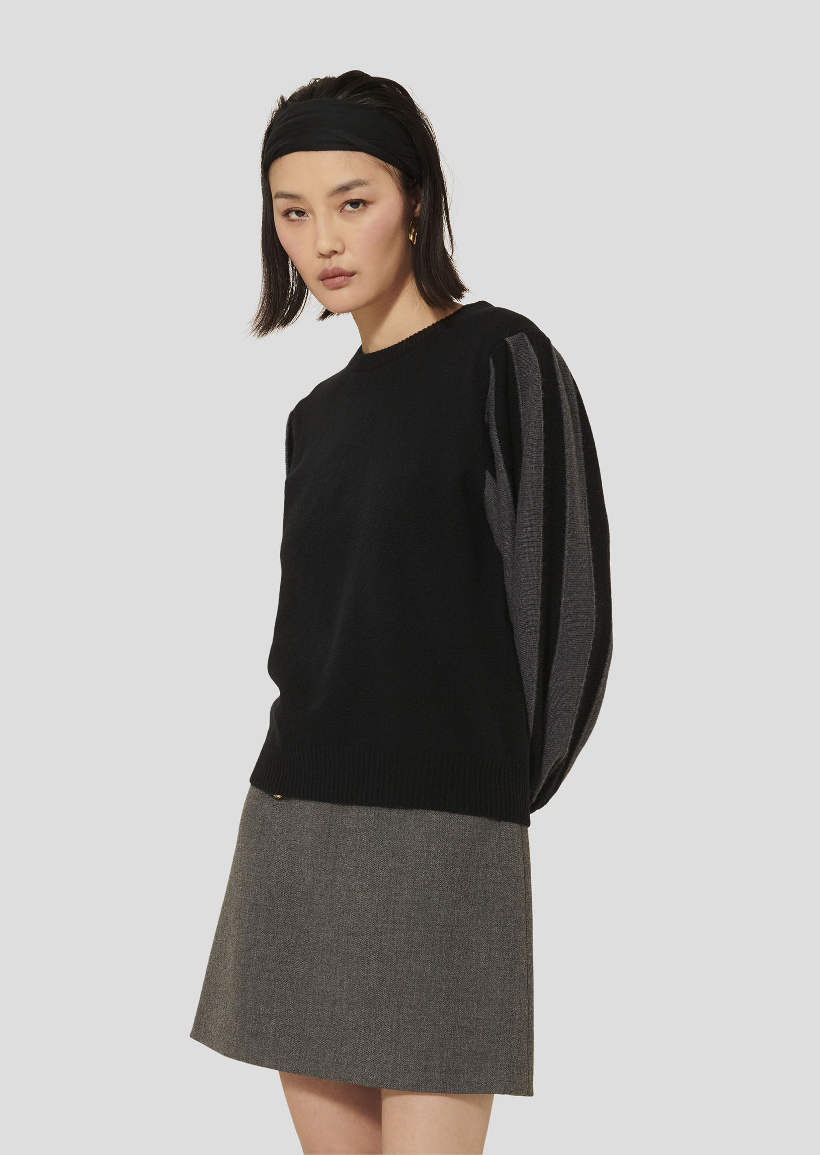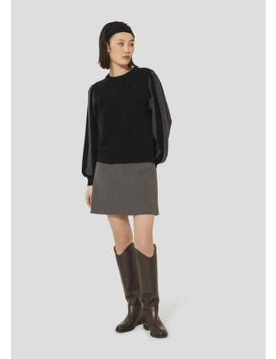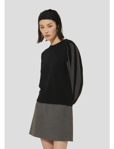 Ce pull noir en laine et coton possède une coupe droite, ainsi qu'un petit col montant et des manches longues ballons à rayures grises.