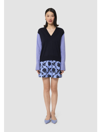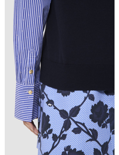 Ce pull fin en laine merinos bleu nuit possède un col V et une coupe légèrement cintrée. Son twist réside dans ses manches longues contrastantes en coton rayé bleu ciel à strass.