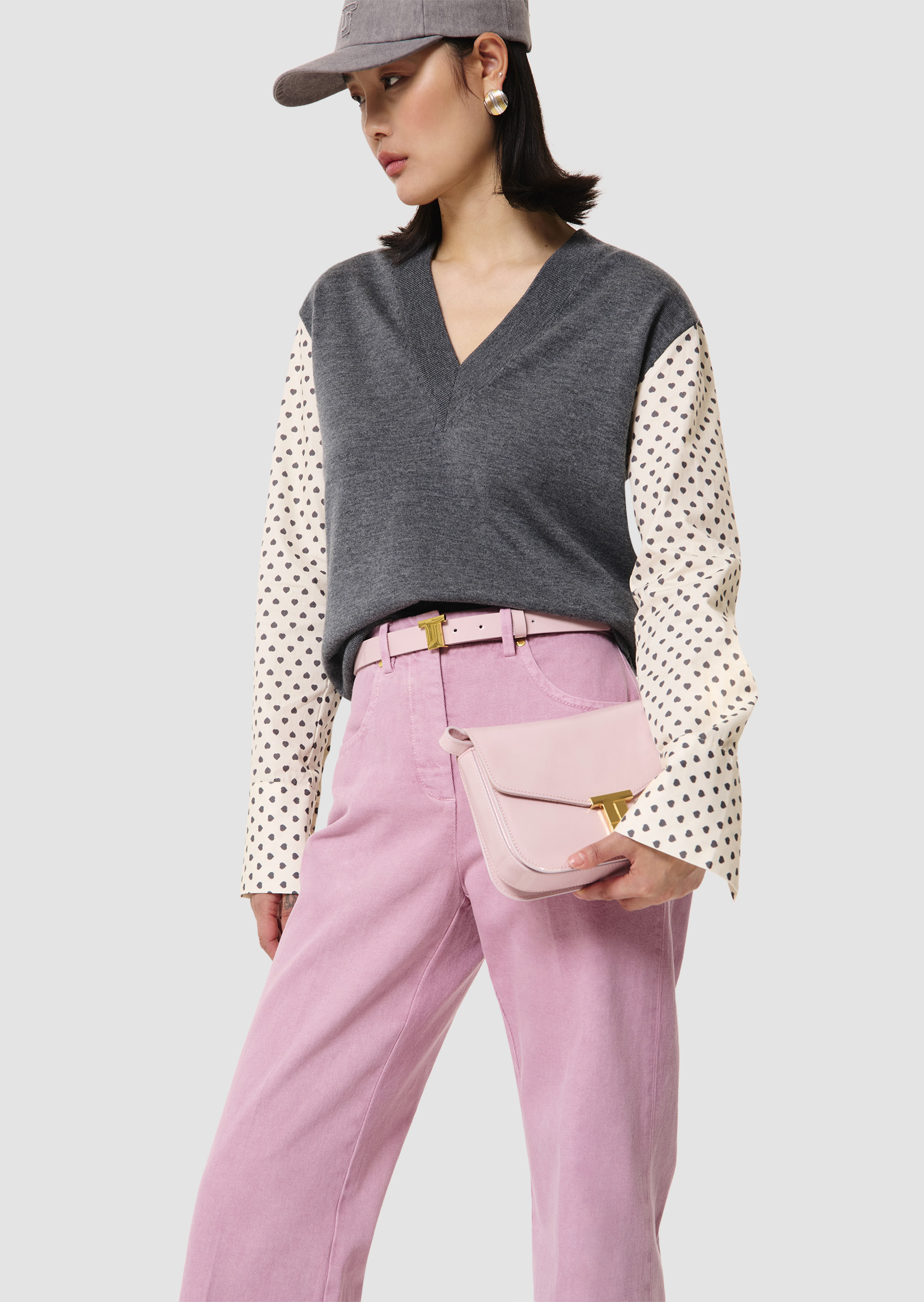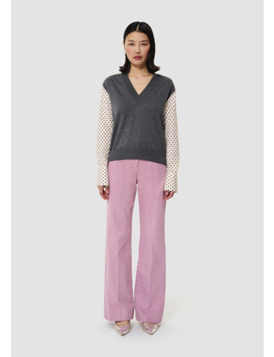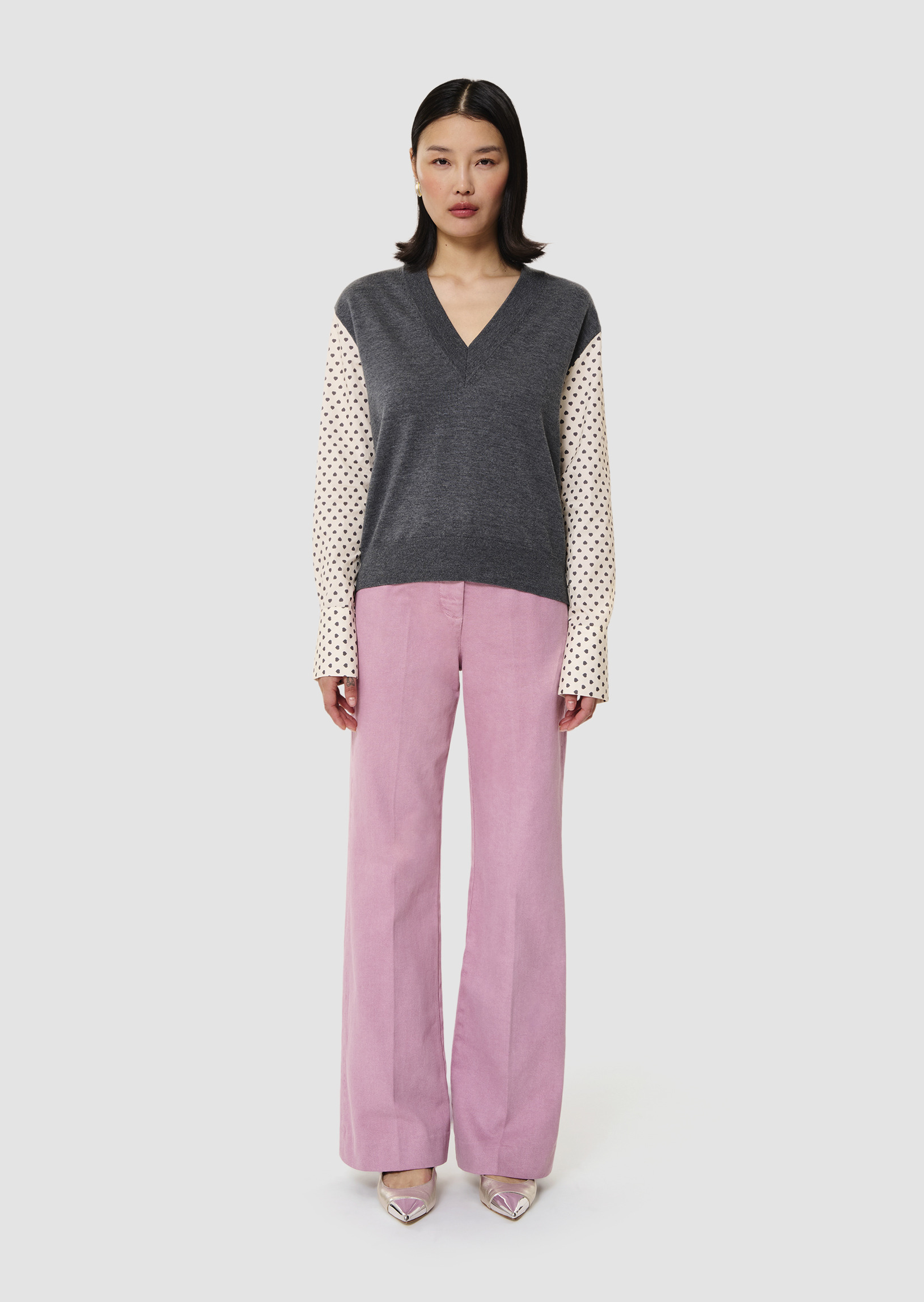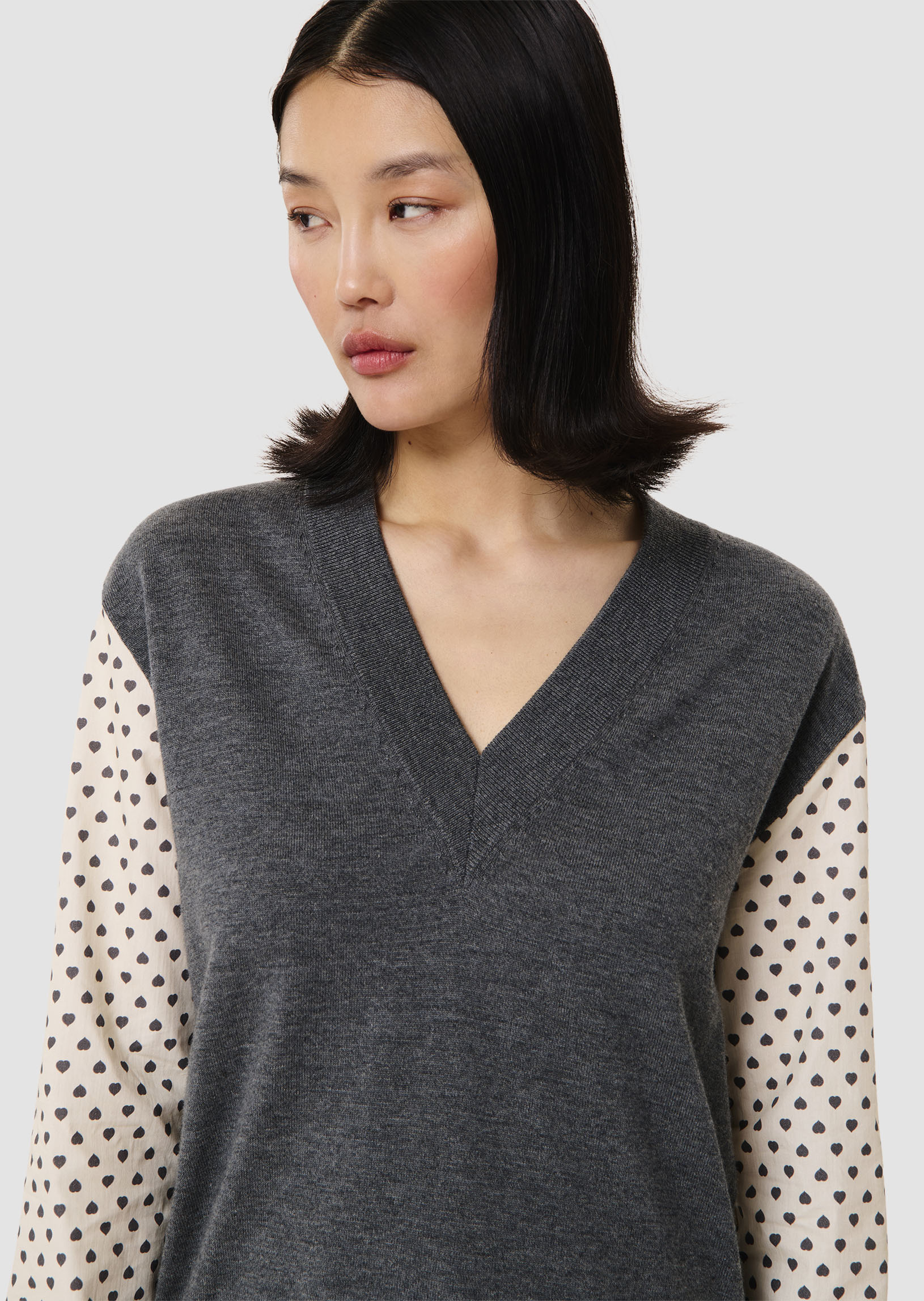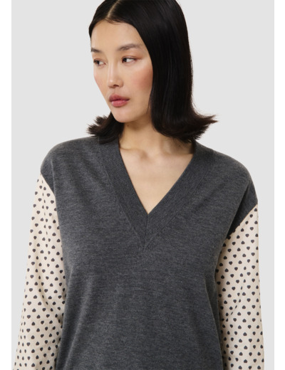 Ce pull fin en laine merinos gris chiné possède un col V et une coupe légèrement cintrée. Son twist réside dans ses manches longues contrastantes en coton imprimé mini coeurs gris.