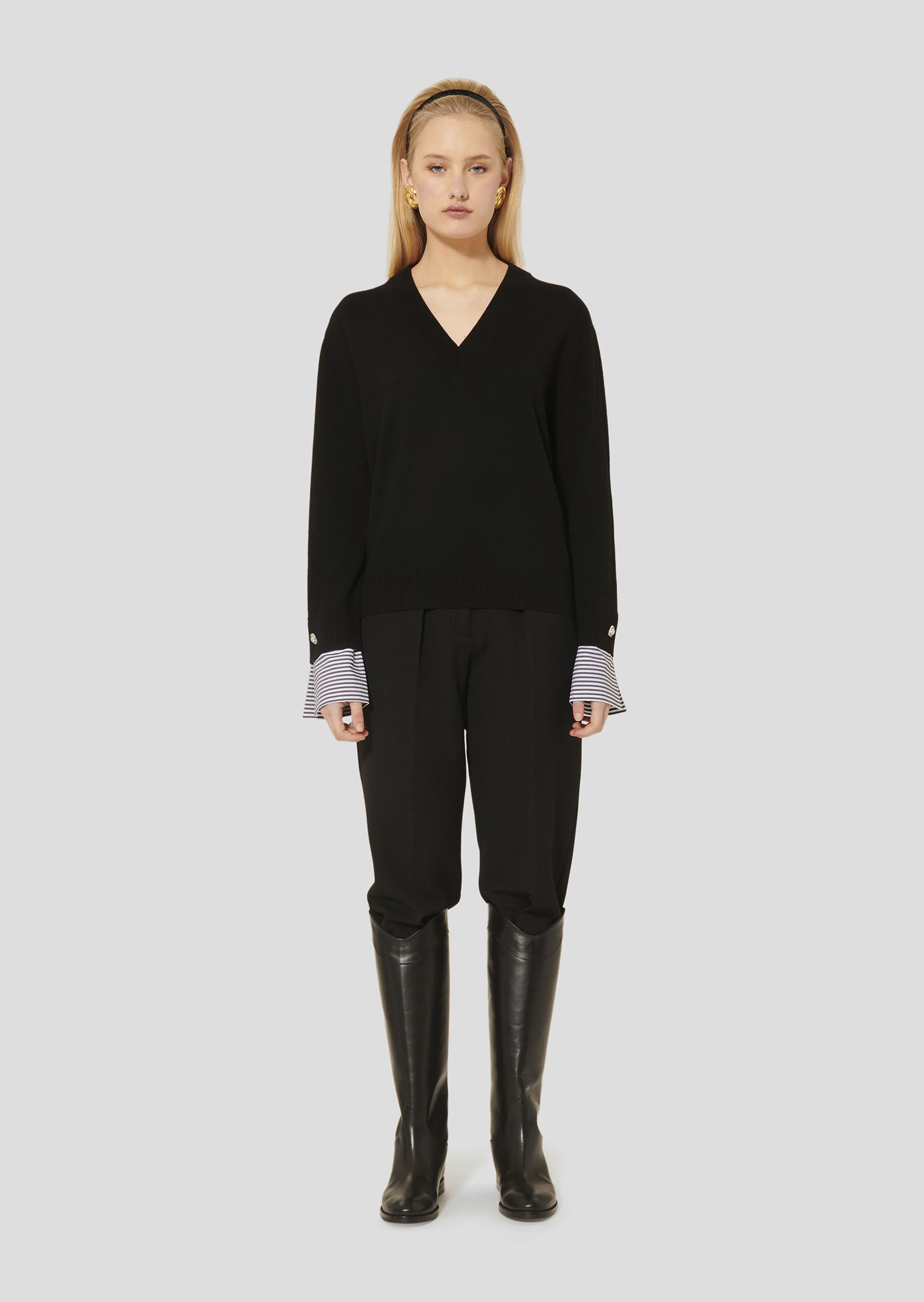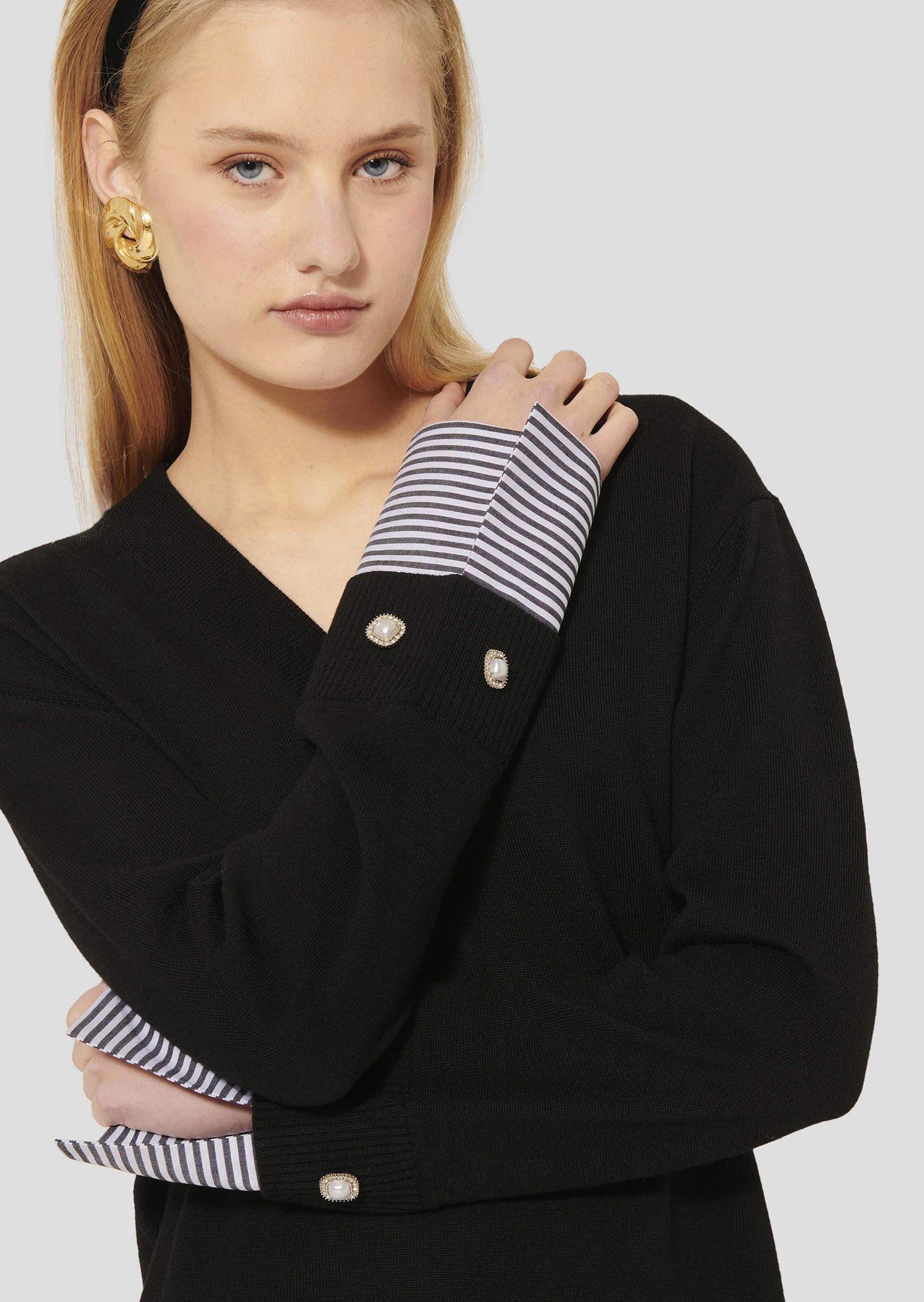 Ce pull noir possède un col V et des manches longues. La touche so Tara réside dans ses poignets trompe l'œil en popeline à rayures bleues décorés d'un bouton bijoux. Confectionné en laine mérinos, il est doux avec un toucher cachemire ultra confortable.