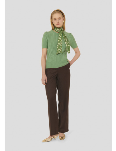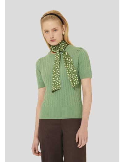 Ce cardigan couleur amande en laine tressée possède une encolure ronde et des manches courtes. De larges bords-côtes marquent le bas, l'encolure et le bas des manches. Son twist so Tara réside dans son foulard cactus à pois que l'on peut nouer en lavallière ou en cravate.