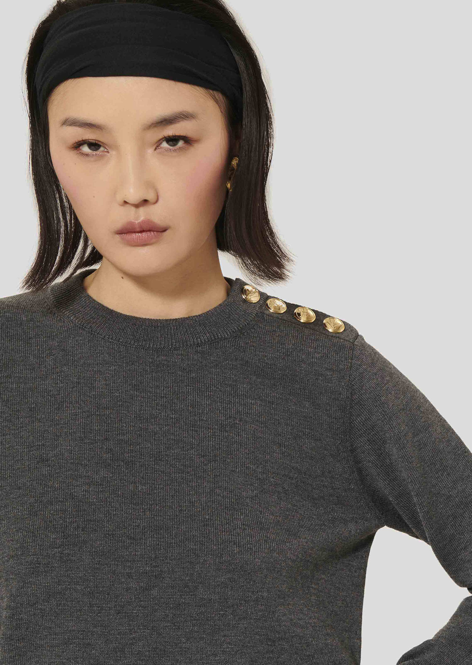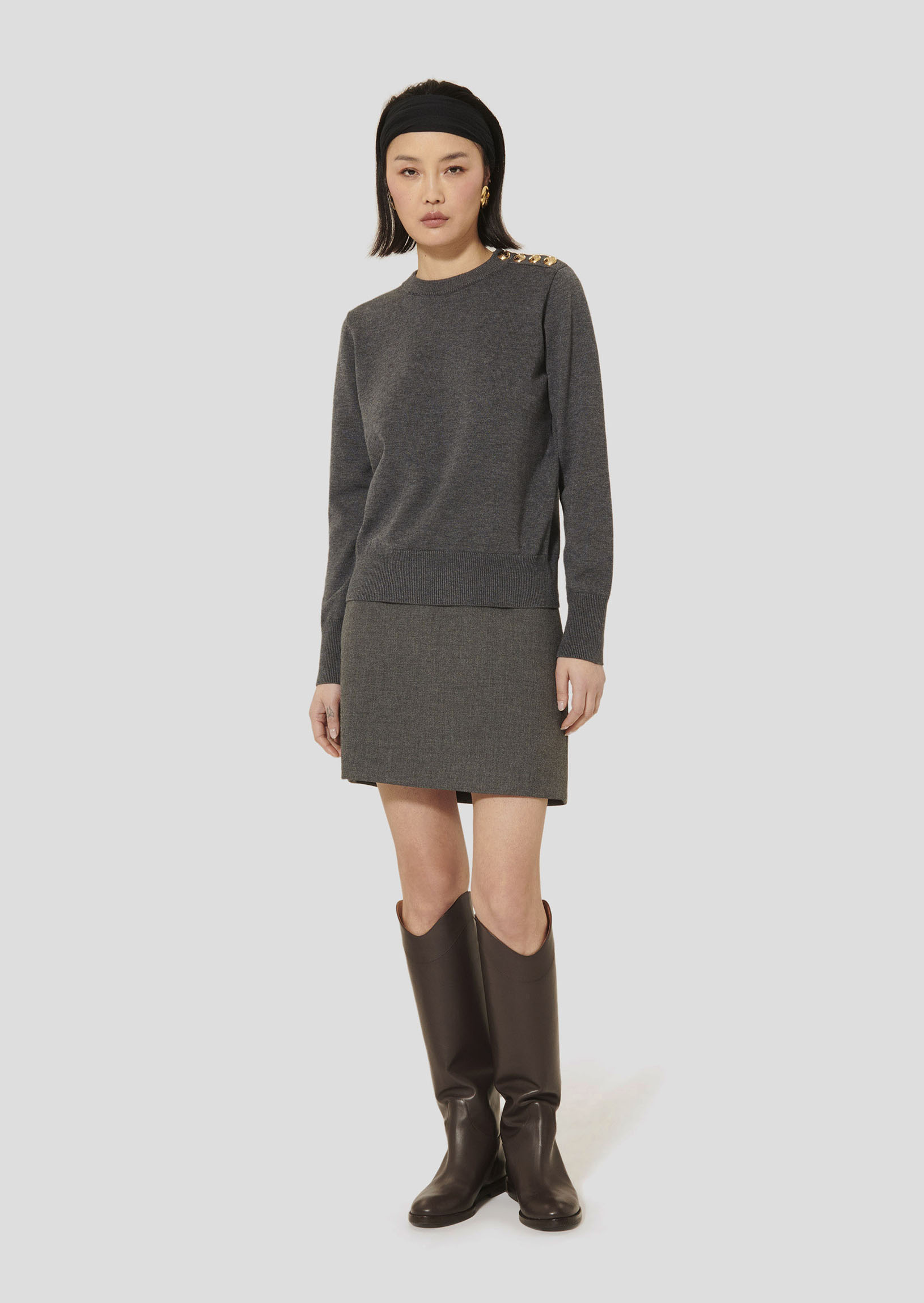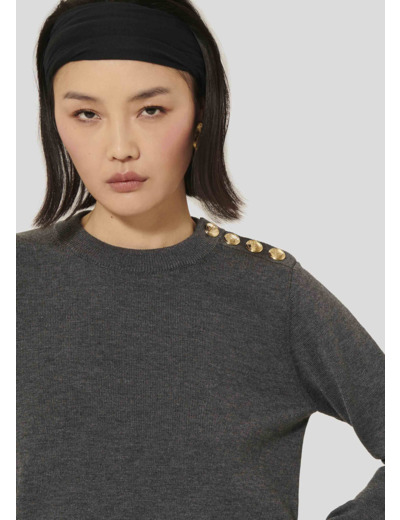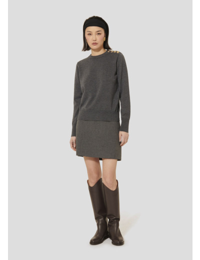 Ce pull gris chiné possède des manches longues et un col rond. La touche so Tara est apportée par les boutons dorés ornés du monogramme de la maison qui décorent son épaule gauche. Il est confectionné en laine douce qui lui confère un toucher cachemire ultra confortable. Idéal pour la saison, sa couleur classique vous accompagnera au quotidien.