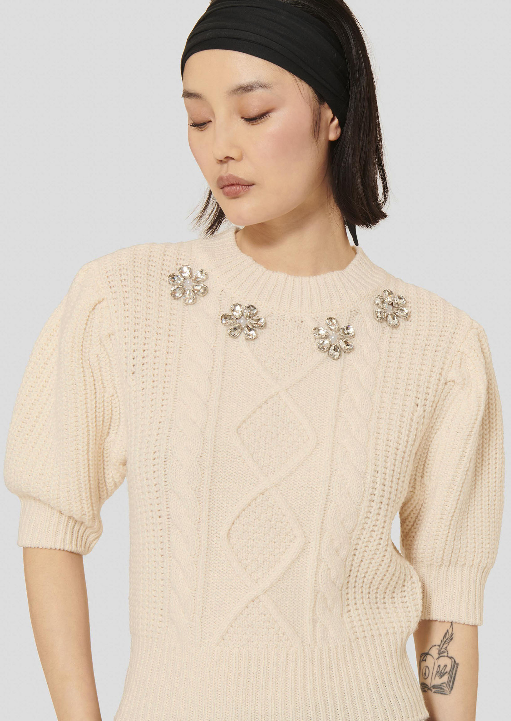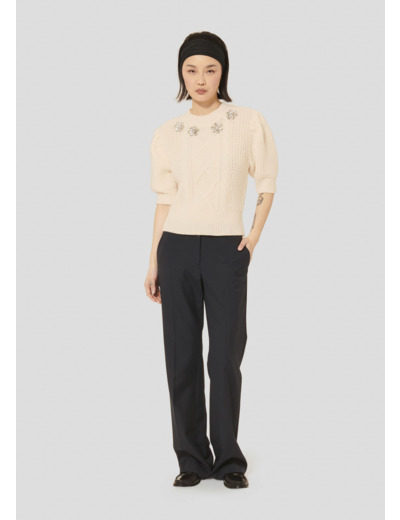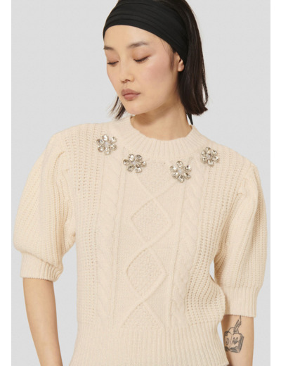 Ce pull écru à grosse maille possède une encolure ronde et des manches 3/4 légèrement bouffantes. De larges bords côtes décorent le bas du pull, l'encolure et le bas des manches. L'avant est décoré de torsades ton sur ton et de strass formant des fleurs. Entièrement confectionné en laine mérinos, il est votre allié cette saison pour vous apporter confort et douceur.