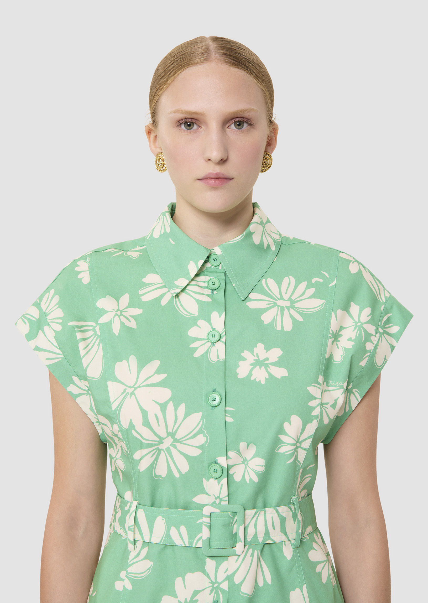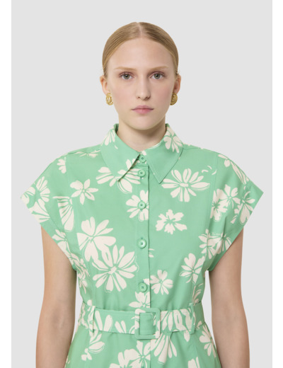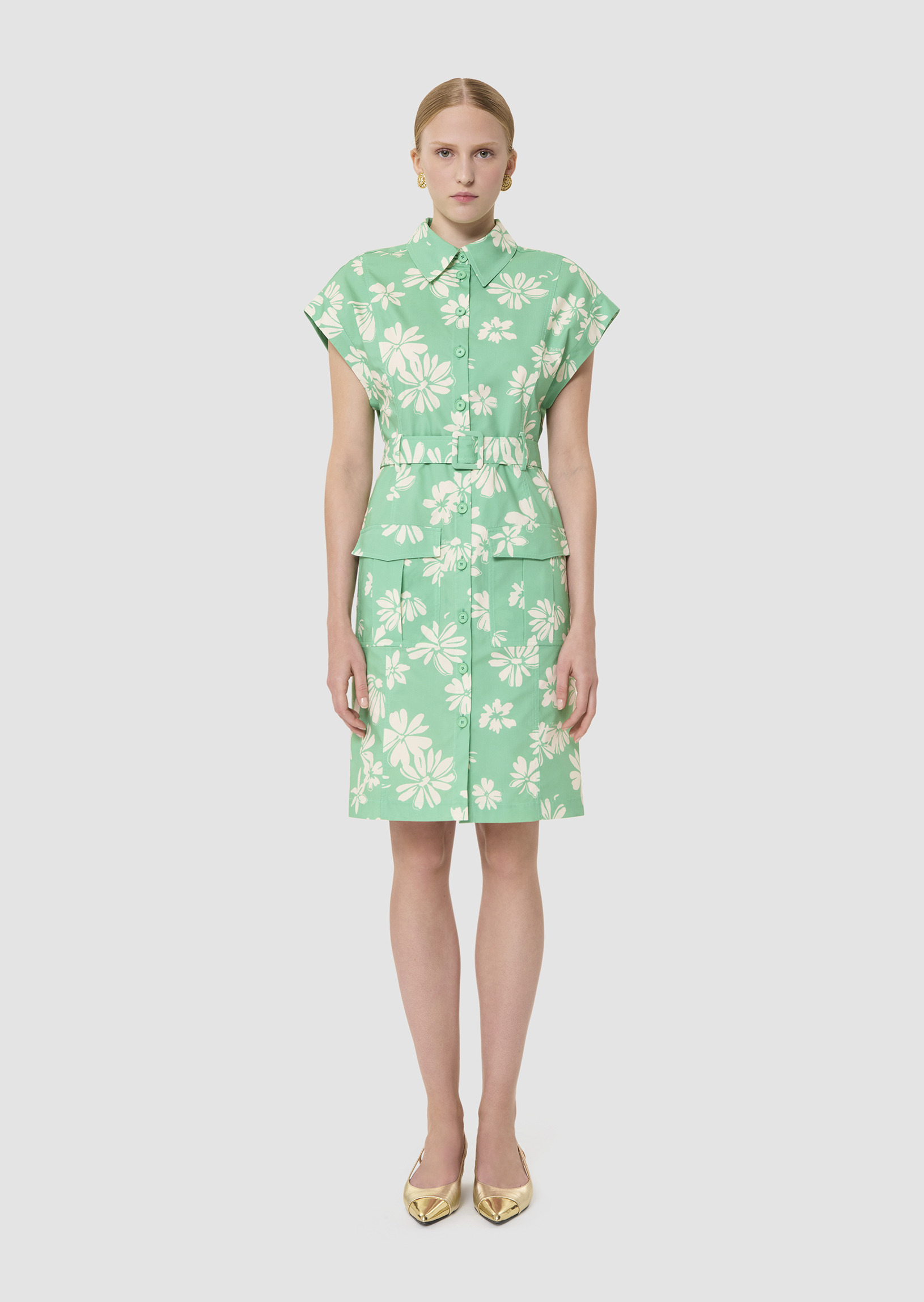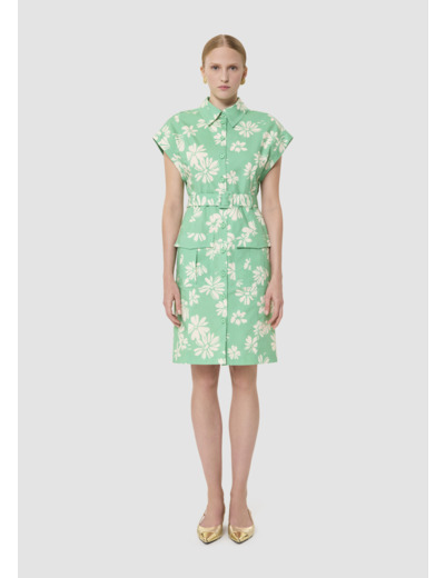 Cette robe mi-longue en coton imprimée de notre motif fleuri sur fond vert possède des manches courtes et un col chemise. Elle se boutonne entièrement au devant par des boutons ton sur ton et sa taille est marquée par une ceinture ton sur ton amovible à boucle carrée. Elle a des grandes poches à rabat aux côtés pour un esprit 70's.