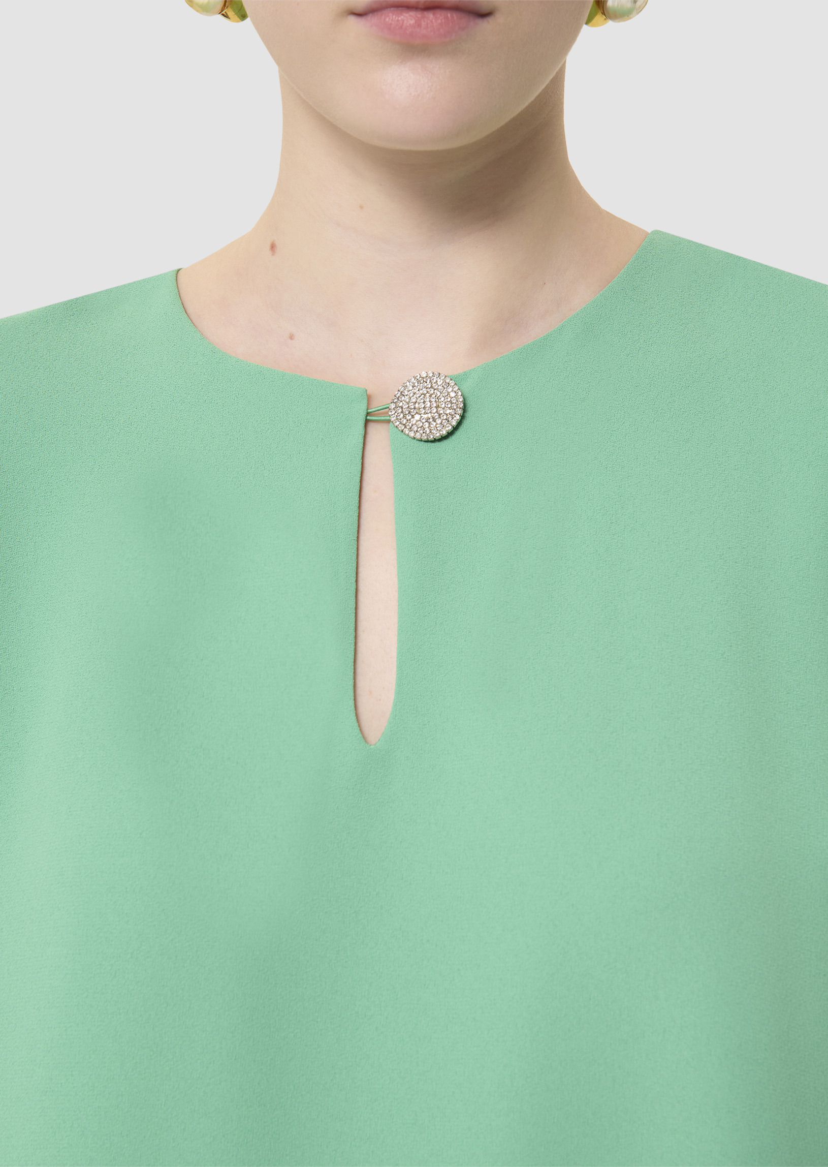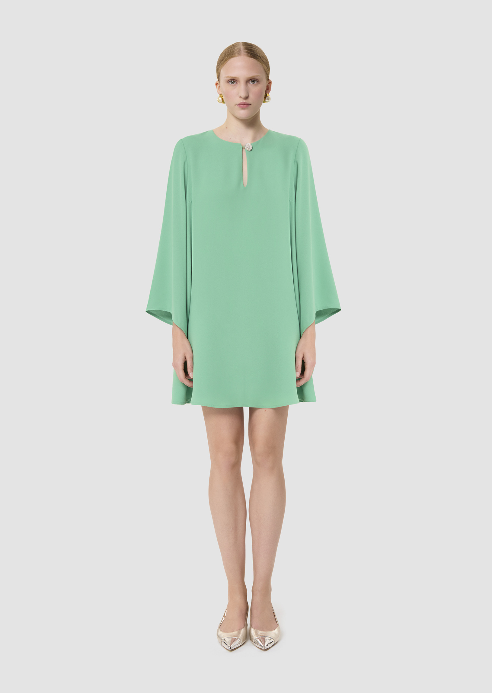 Cette robe courte rouge en crêpe possède des manches chauve-souris biseautées et une coupe fluide droite légèrement évasée. Son col rond est twisté d'une ouverture en goutte d'eau boutonnée par un joli bouton bijou.