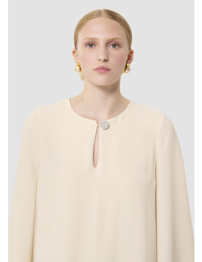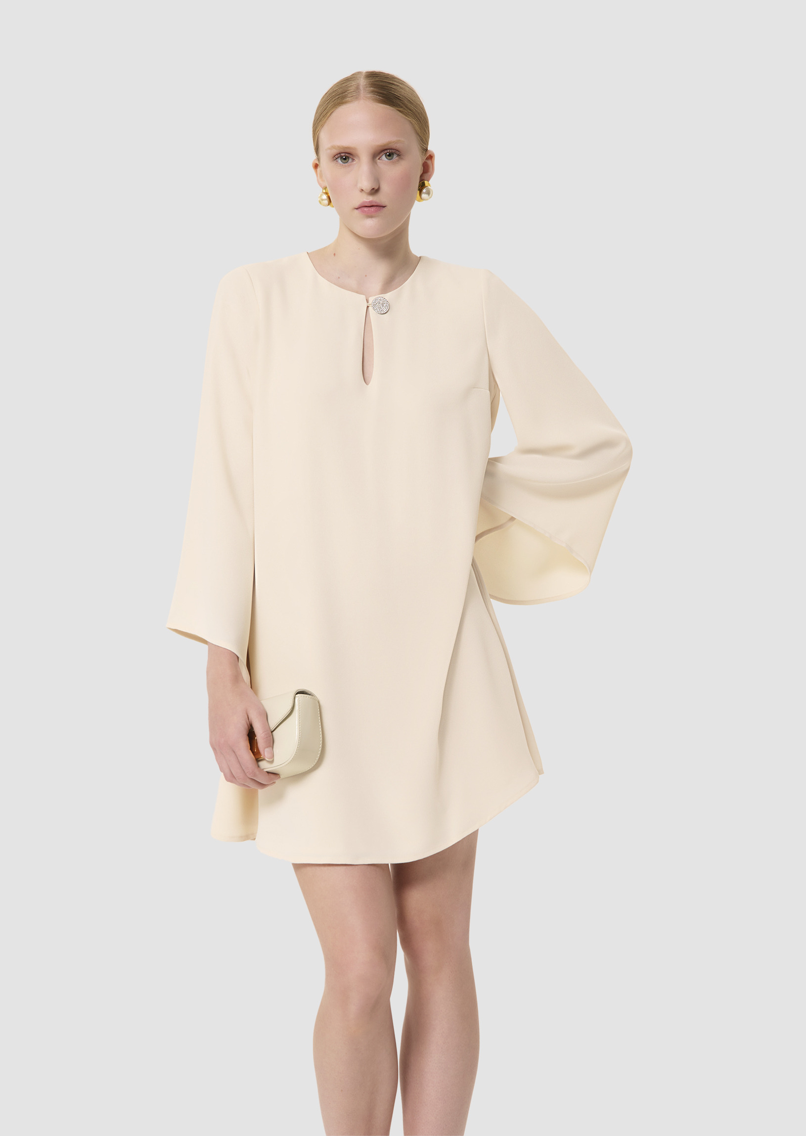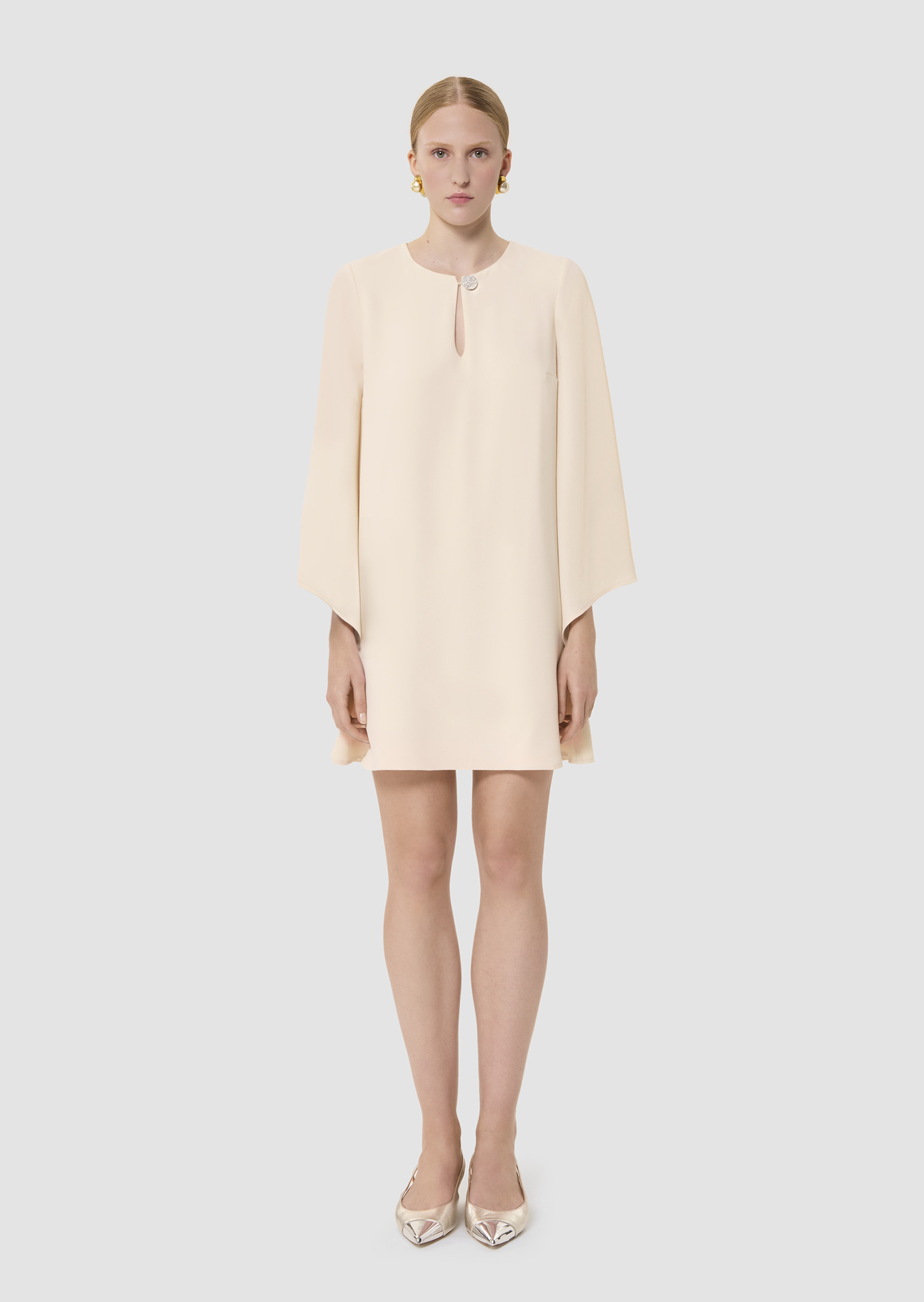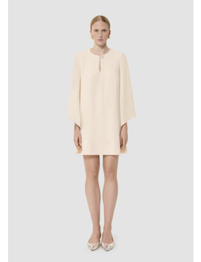 Cette robe courte écrue en crêpe possède des manches chauve-souris biseautées et une coupe fluide droite légèrement évasée. Son col rond est twisté d'une ouverture en goutte d'eau boutonnée par un joli bouton bijou.