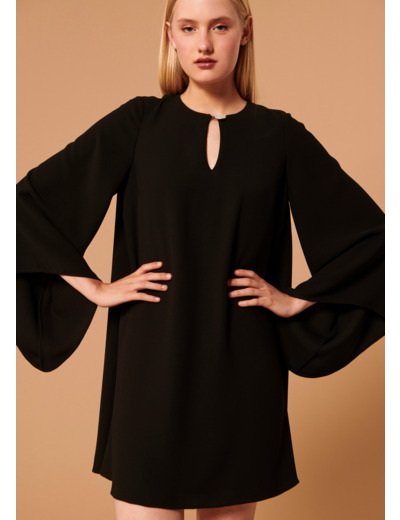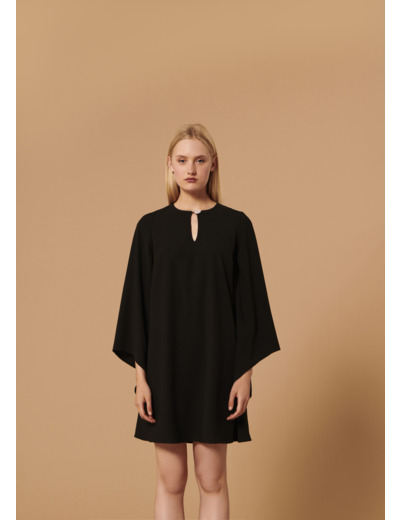 Cette robe courte noire en crêpe possède des manches chauve-souris et une coupe évasée et fluide. Son col rond est twisté d',une ouverutre en goutte d',eau boutonnée par un joli bouton bijou.