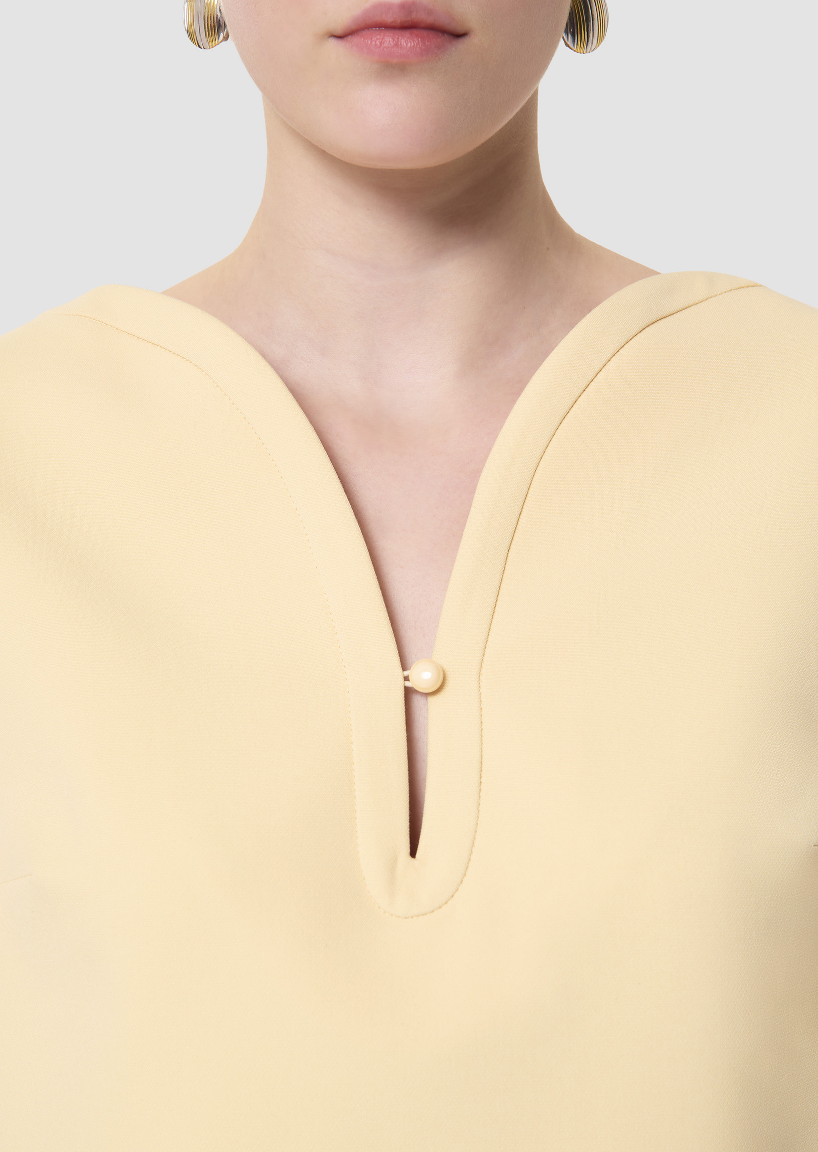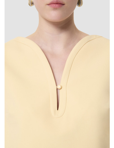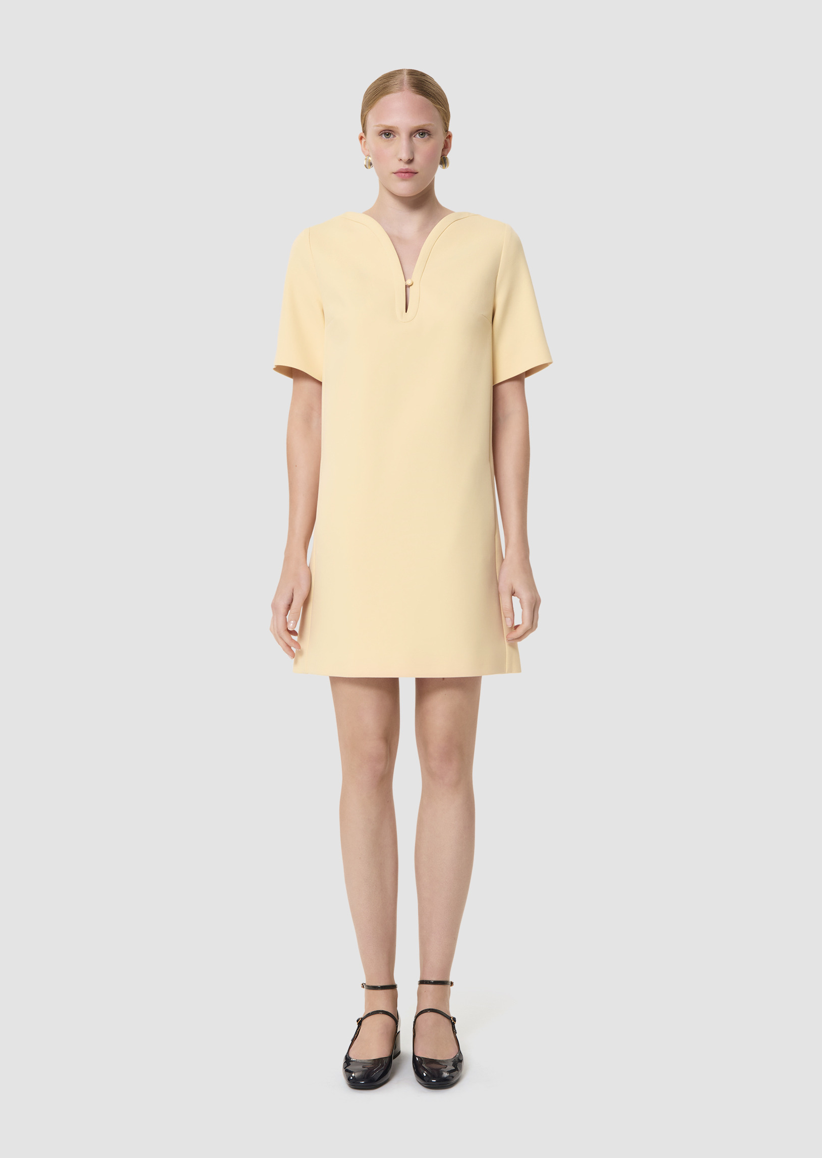 Cette robe courte en toile double couleur vanille possède des manches courtes, un col en V arqué fermé grâce un petit bouton ton sur ton. Elle a une coupe droite, des poches invisibles aux côtés et se ferme au dos par un zip invisible.
