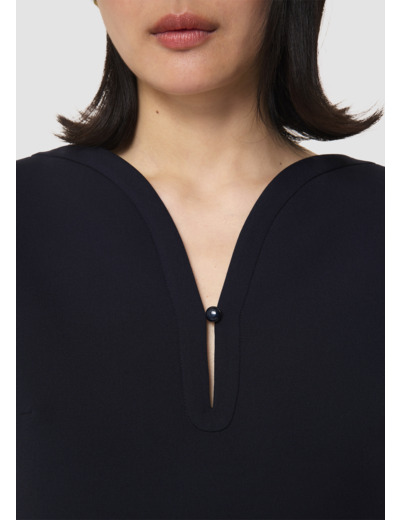 Cette robe courte en toile double couleur bleu nuit possède des manches courtes, un col en V arqué fermé grâce un petit bouton ton sur ton. Elle a une coupe droite, des poches invisibles aux côtés et se ferme au dos par un zip invisible.