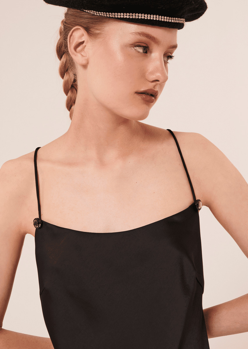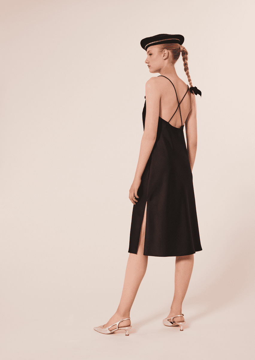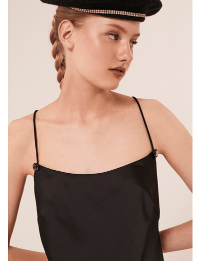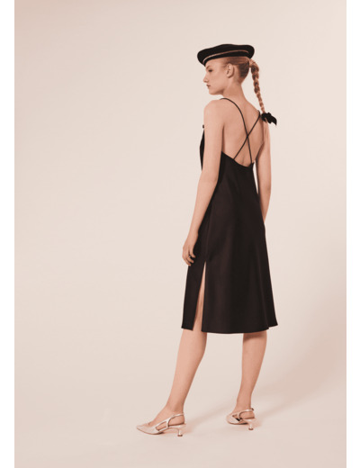 Cette robe mi-longue noire en satin possède de fines bretelles qui se croisent et laissent découvrir son dos nu. Sa coupe droite et fluide souligne la silhouette. Ultra féminine, elle a une fente au côté. Des boutons bijoux décorent l'encolure.