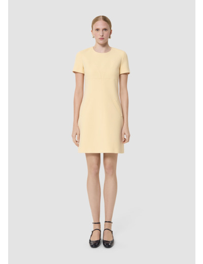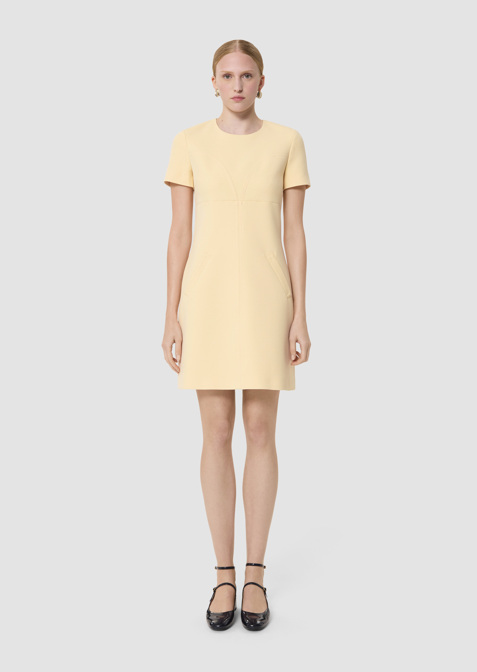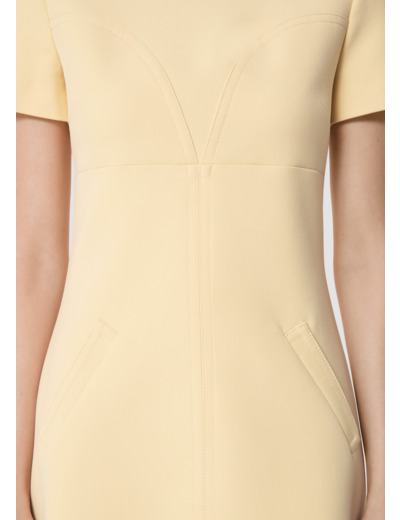 Cette robe courte en toile double couleur vanille possède des manches courtes, un col rond et des poches passepoilées aux côtés. Elle a une coupe droite marquée sous la poitrine et des surpiqûres ton sur ton soulignent la silhouette au devant. Fermture au dos par un zip invisible.