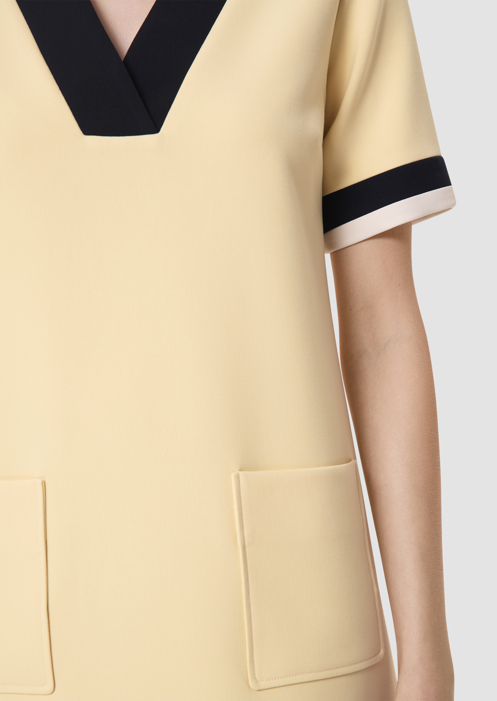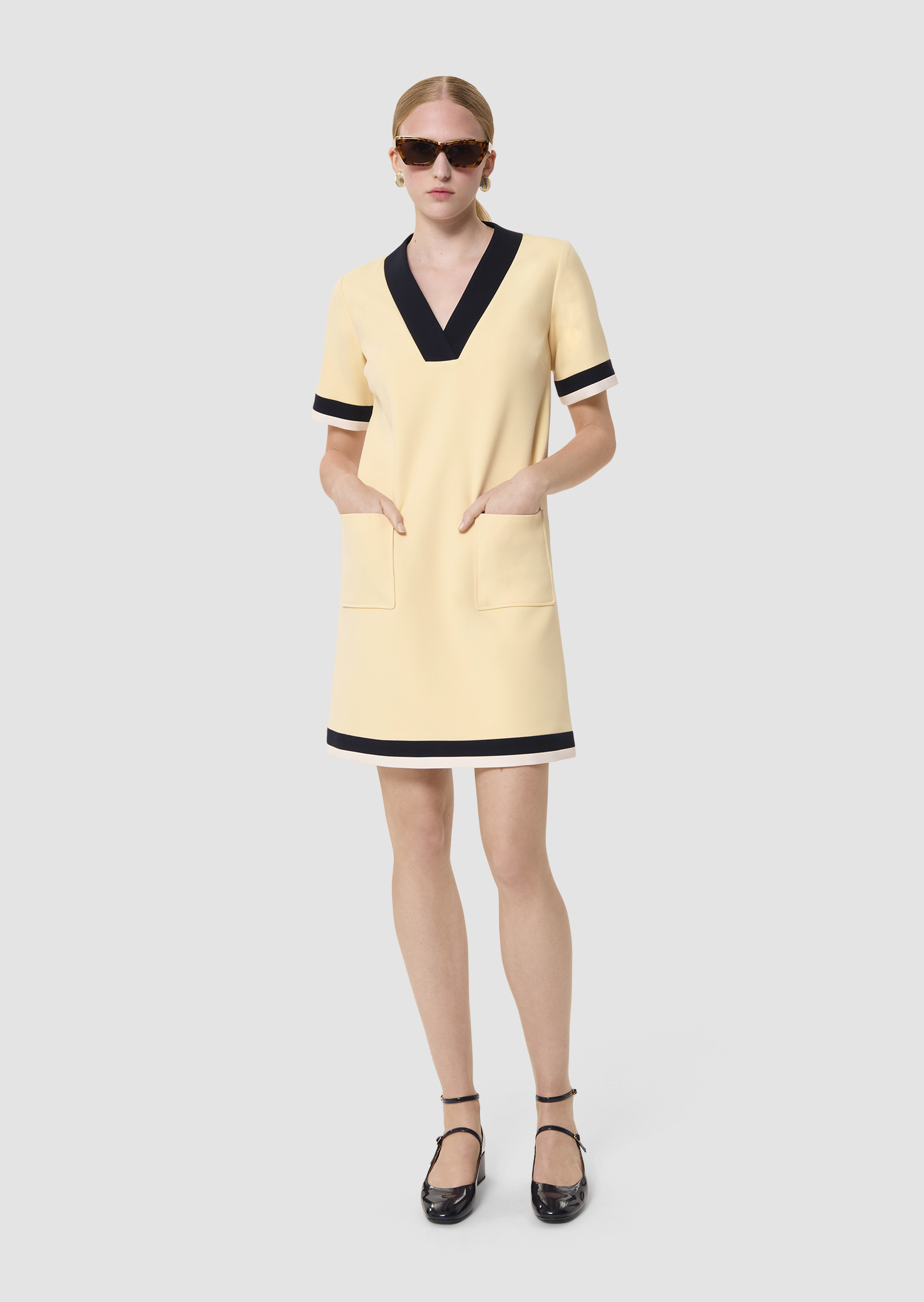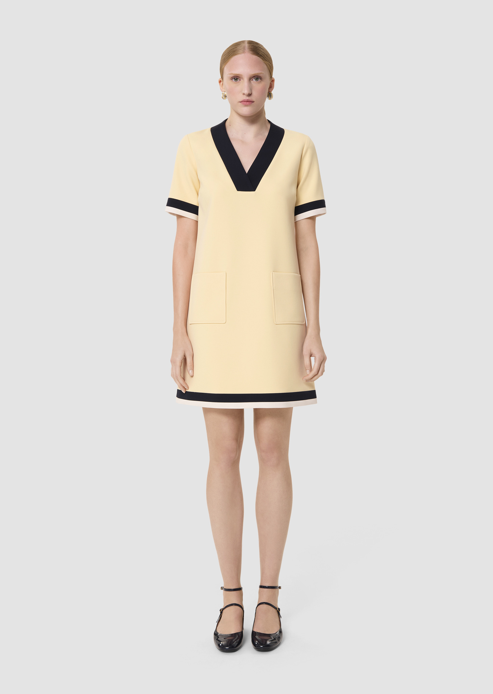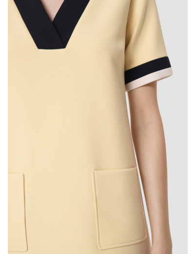 Cette robe courte en toile double couleur vanille possède un col V souligné par un empiècement bleu nuit et des poches plaquées au devant. Elle a une coupe légèrement trapèze et un empiècement bleu nuit et écru marque le bas des manches et le bas de la robe lui apportant son esprit 70's.