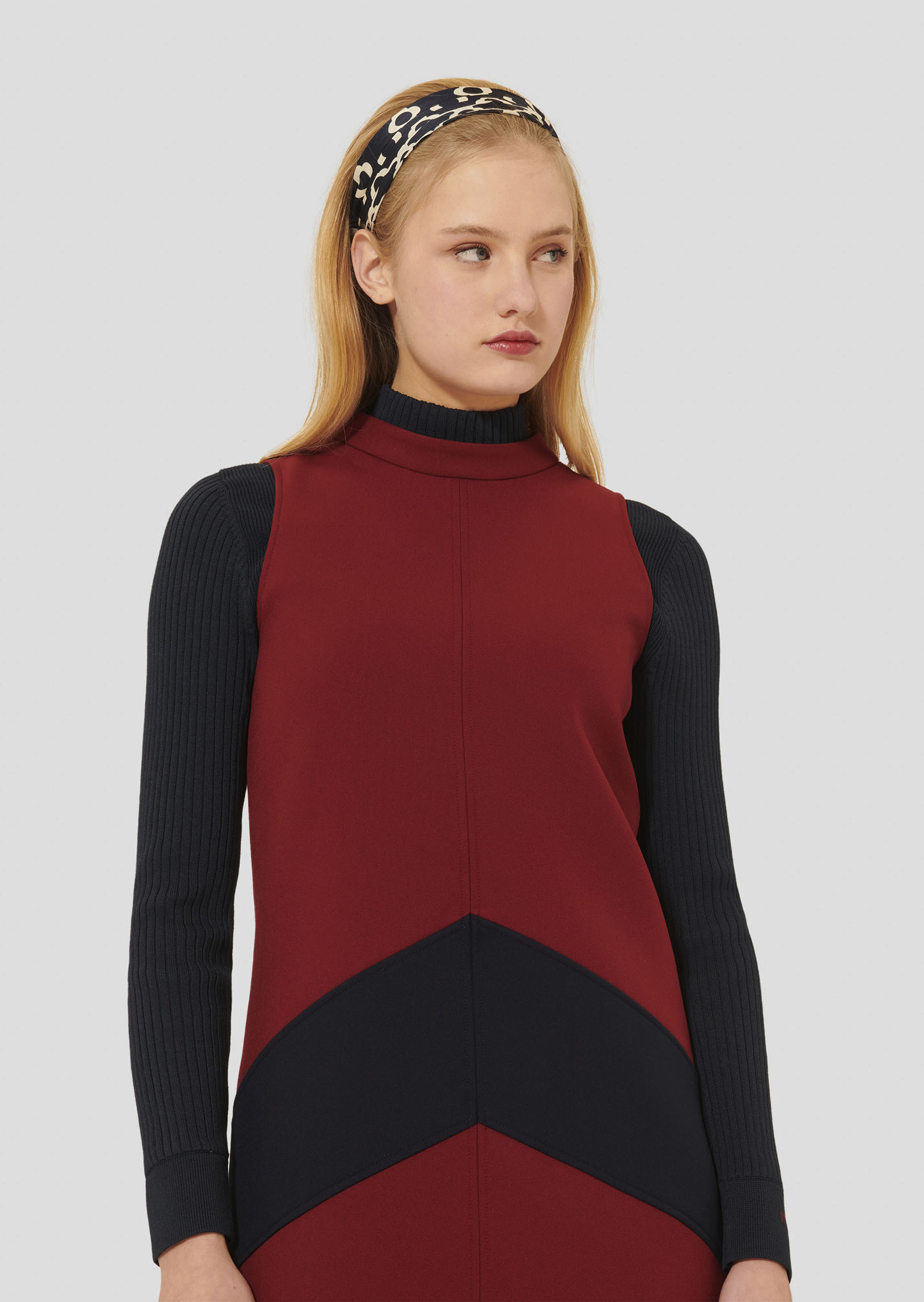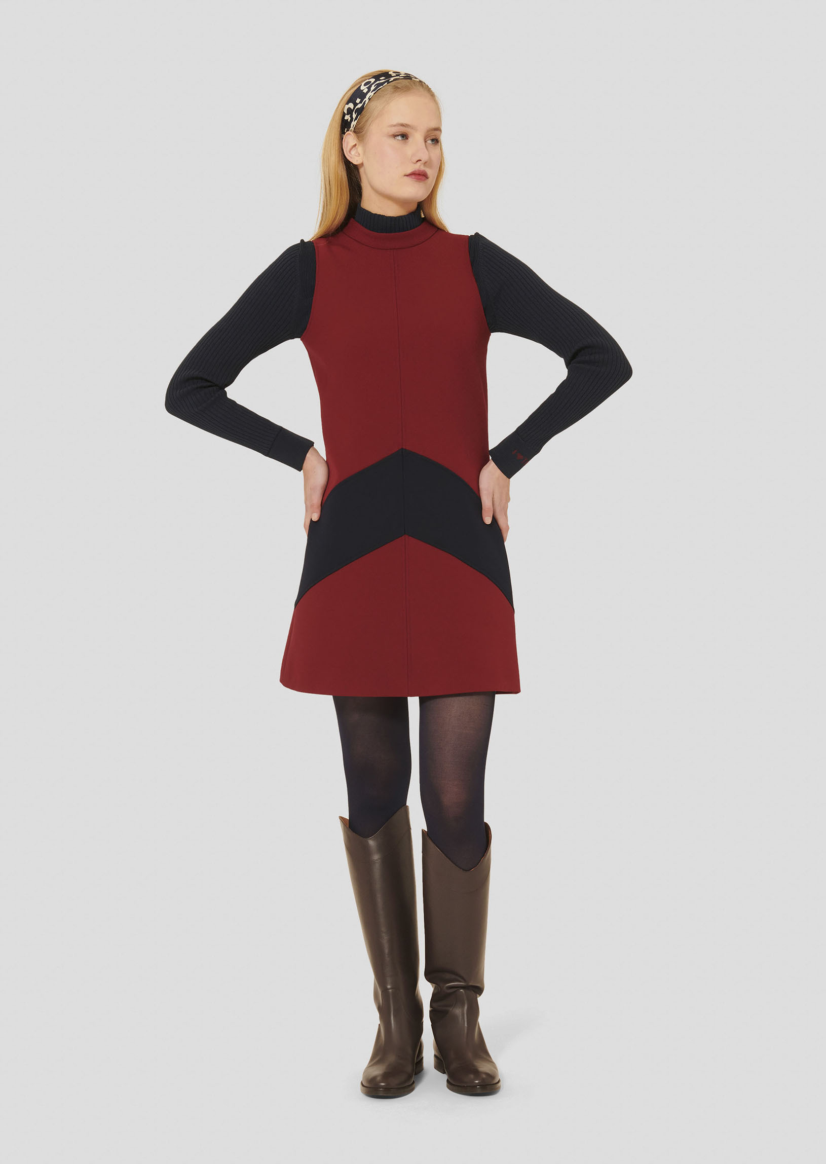 Cette courte robe bordeaux en toile double est sans manches et possède une encolure ronde. Sa coupe trapèze lui donne un esprit résolument preppy. Sa touche so Tara réside dans l'empiècement bleu nuit qui la décore et contraste avec le reste de la robe. Fermeture par zip invisible au dos.