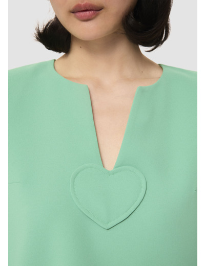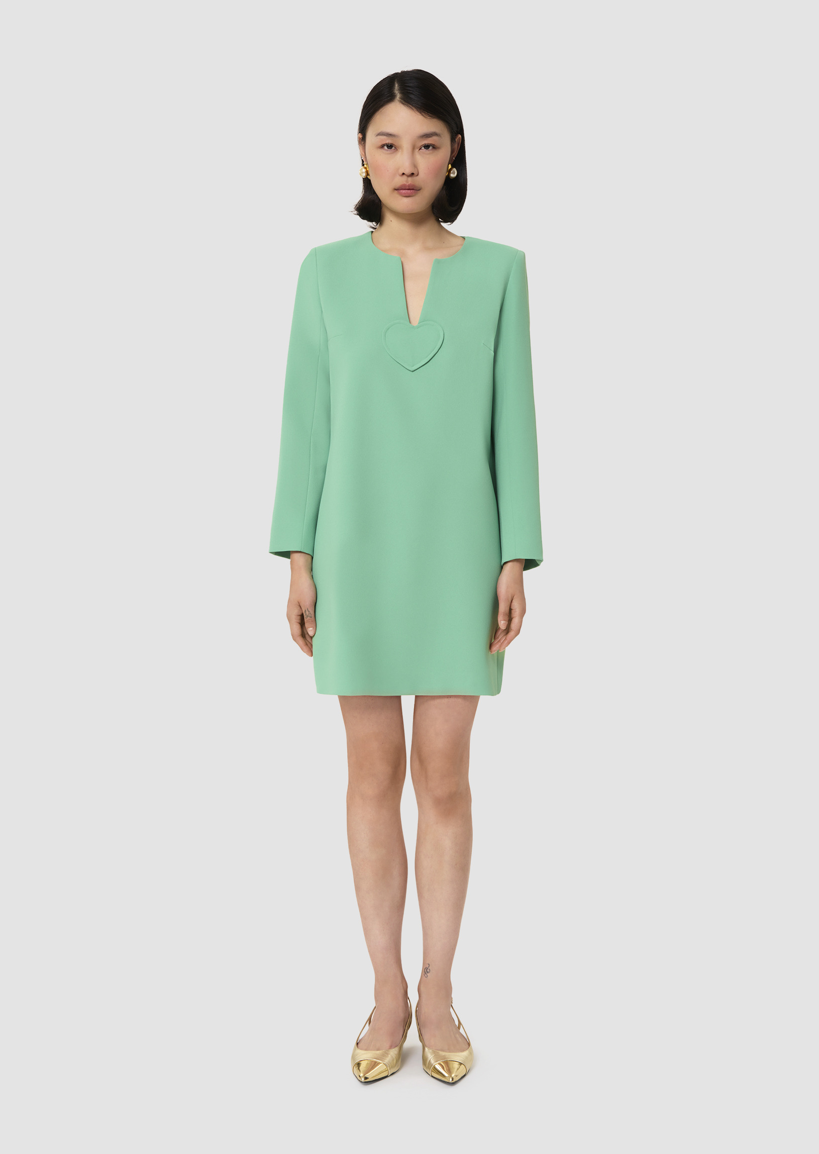 Cette robe courte verte en crêpe possède un col fendu, des manches longues et une coupe droite. Son côté preppy réside dans le petit empiècement ton sur ton en forme de cœur qui orne le décolleté.