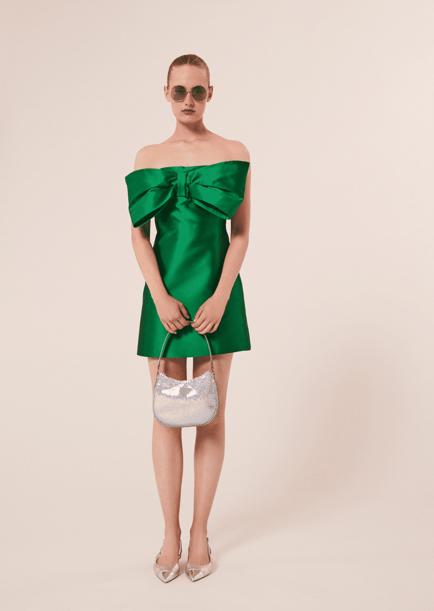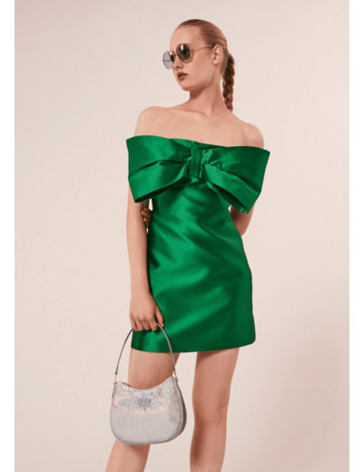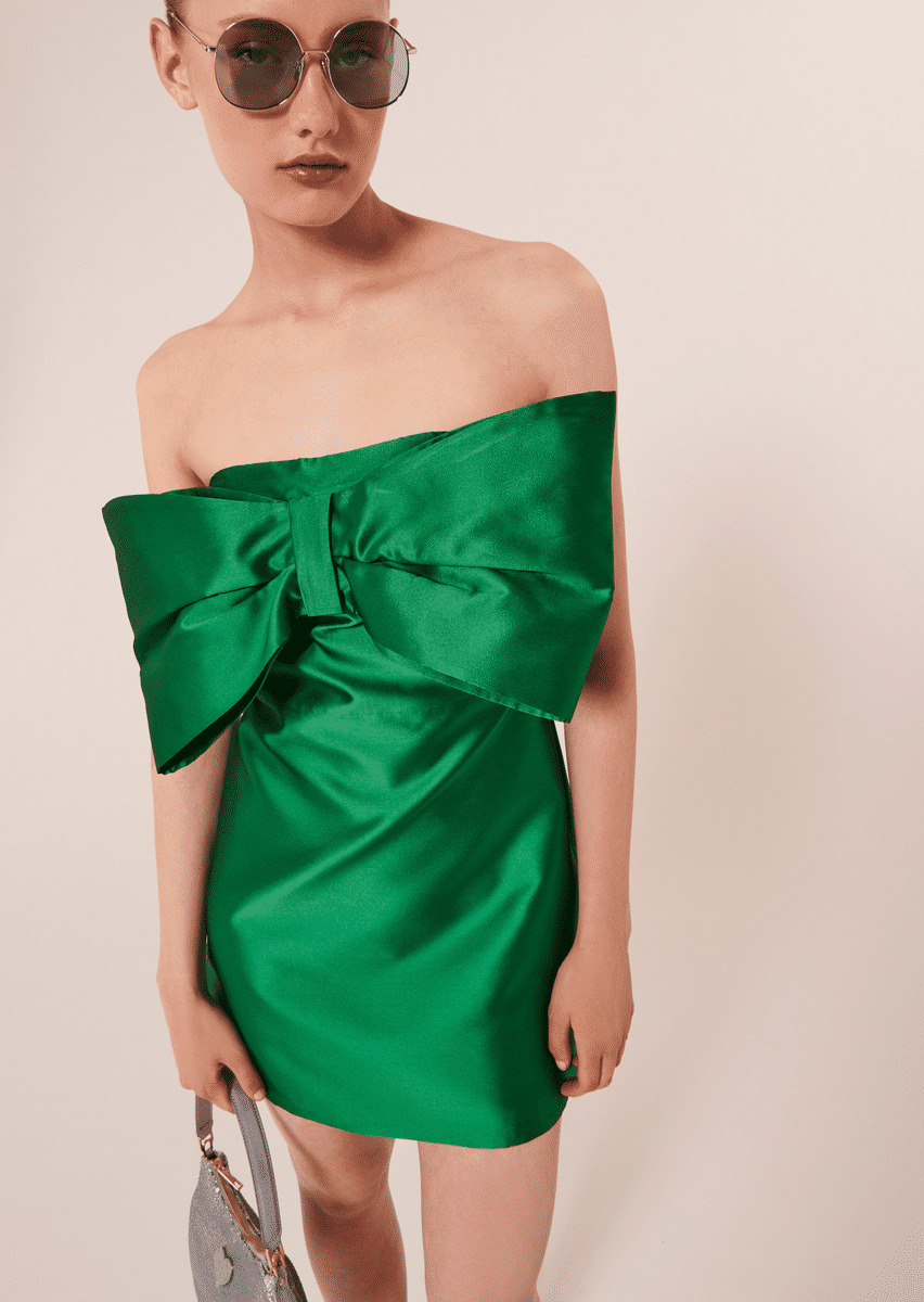 Cette robe bustier couleur vert émeraude en satin duchesse est décorée d'un gros nœud à la poitrine. Sa coupe est patineuse et cintrée sous la poitrine. Fermeture par un zip invisible au côté.