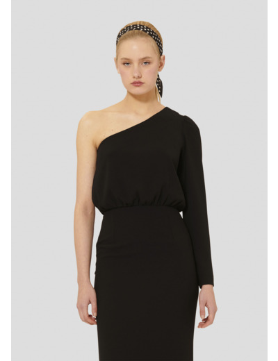Cette longue robe noire en crêpe possède une forme asymétrique avec une manche longue et une coupe fluide cintrée à la taille. Elle possède une fente au côté pour une allure ultra féminine.