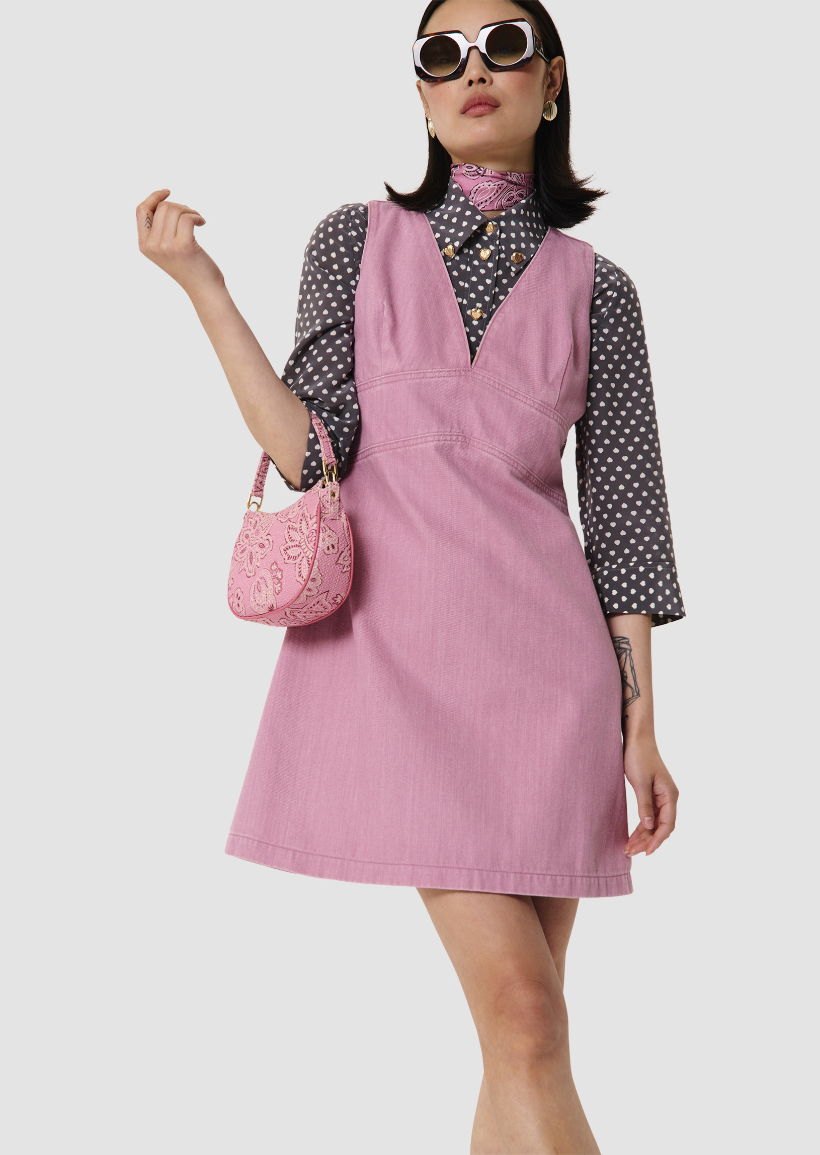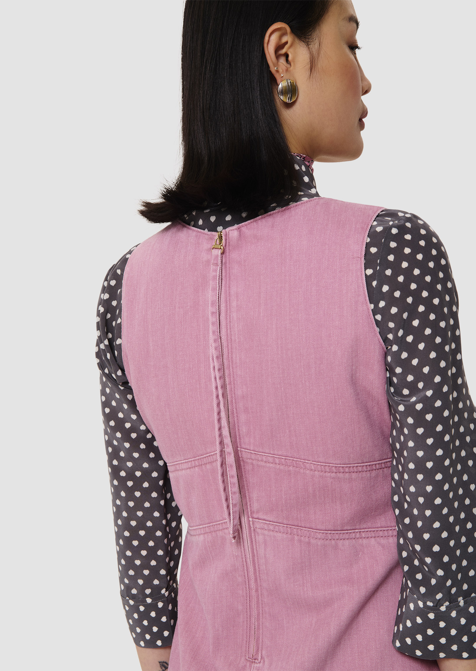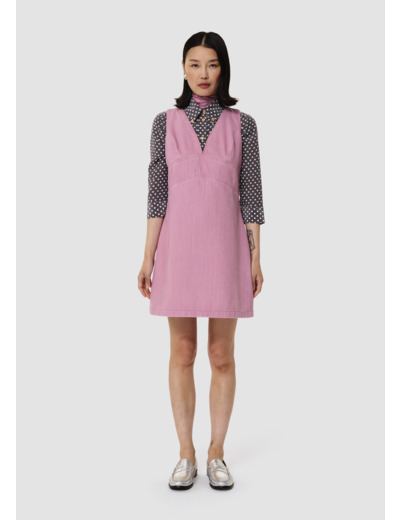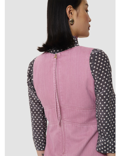 Cette robe courte sans manches vieux rose en coton effet denim possède un col V et une coupe évasée. Elle est surpiquée sous la poitrine pour marquer la taille. Elle se ferme au dos par une fermeture éclair dorée agrémentée d’un long lien ton sur ton.