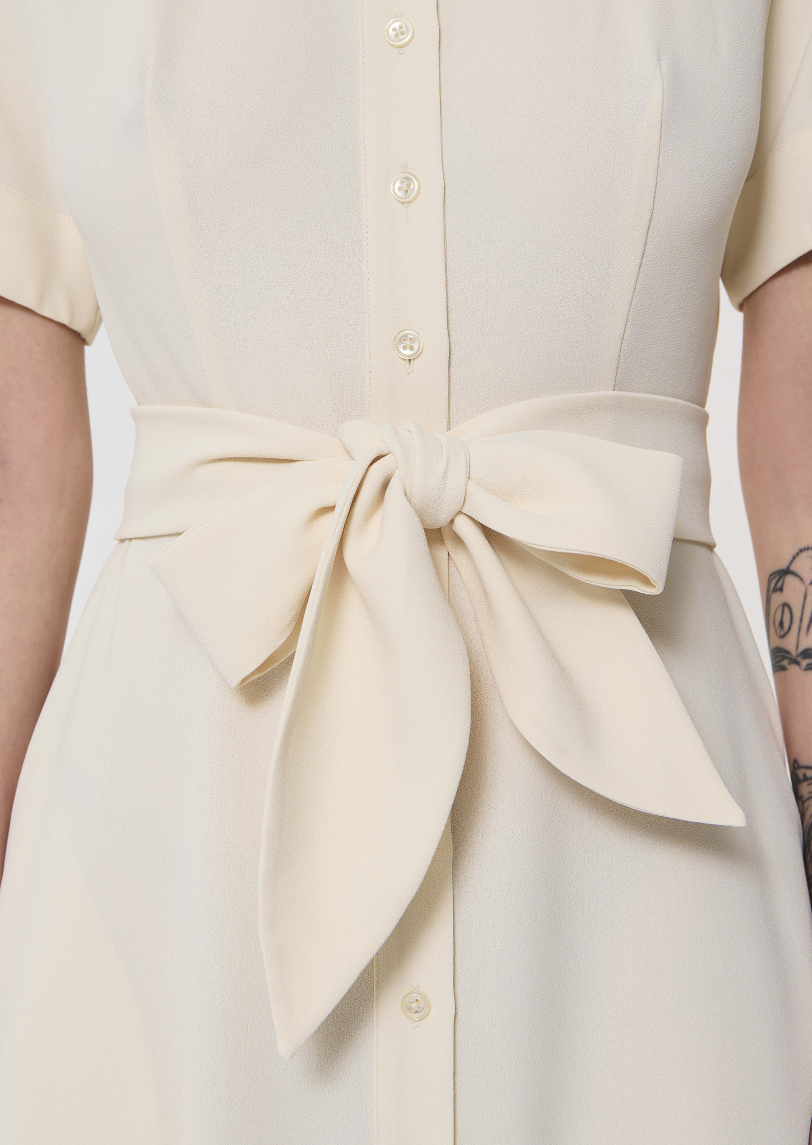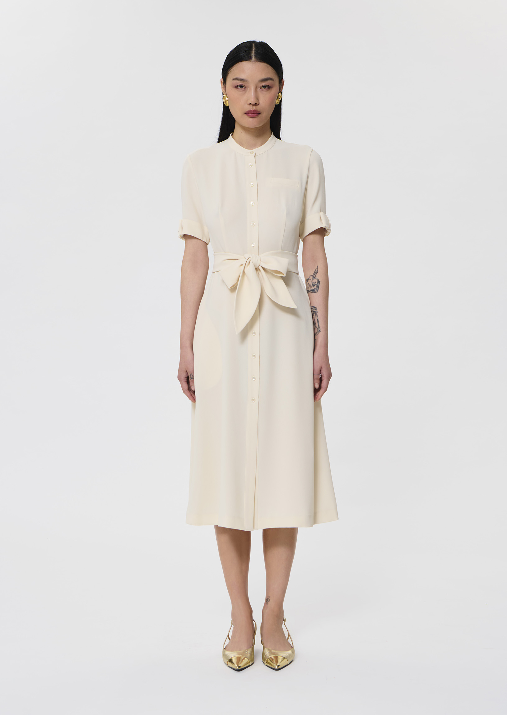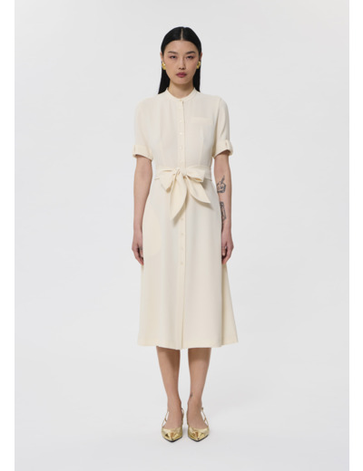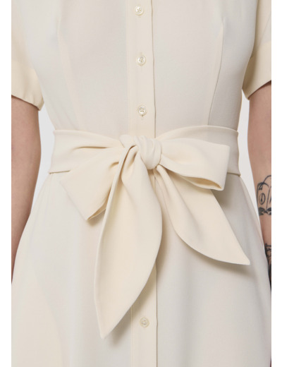 Cette robe mi-longue couleur écru en crêpe fluide possède un col ras du cou et des manches courtes à revers. Elle est ceinturée à la taille par une ceinture à nouer ton sur ton et se ferme au devant par de petits boutons ton sur ton. Elle a deux poches invisibles aux côtés. Sa touche so Tara, le petit nœud plat au revers de manche et sa jupe légèrement évasée qui lui confèrent un look romantique.