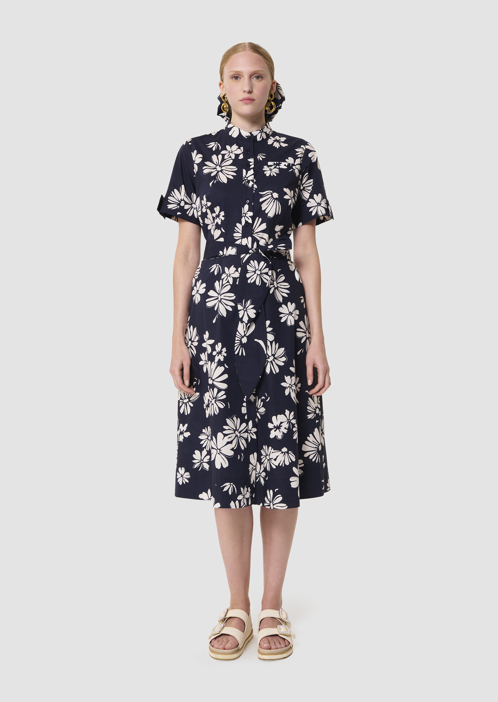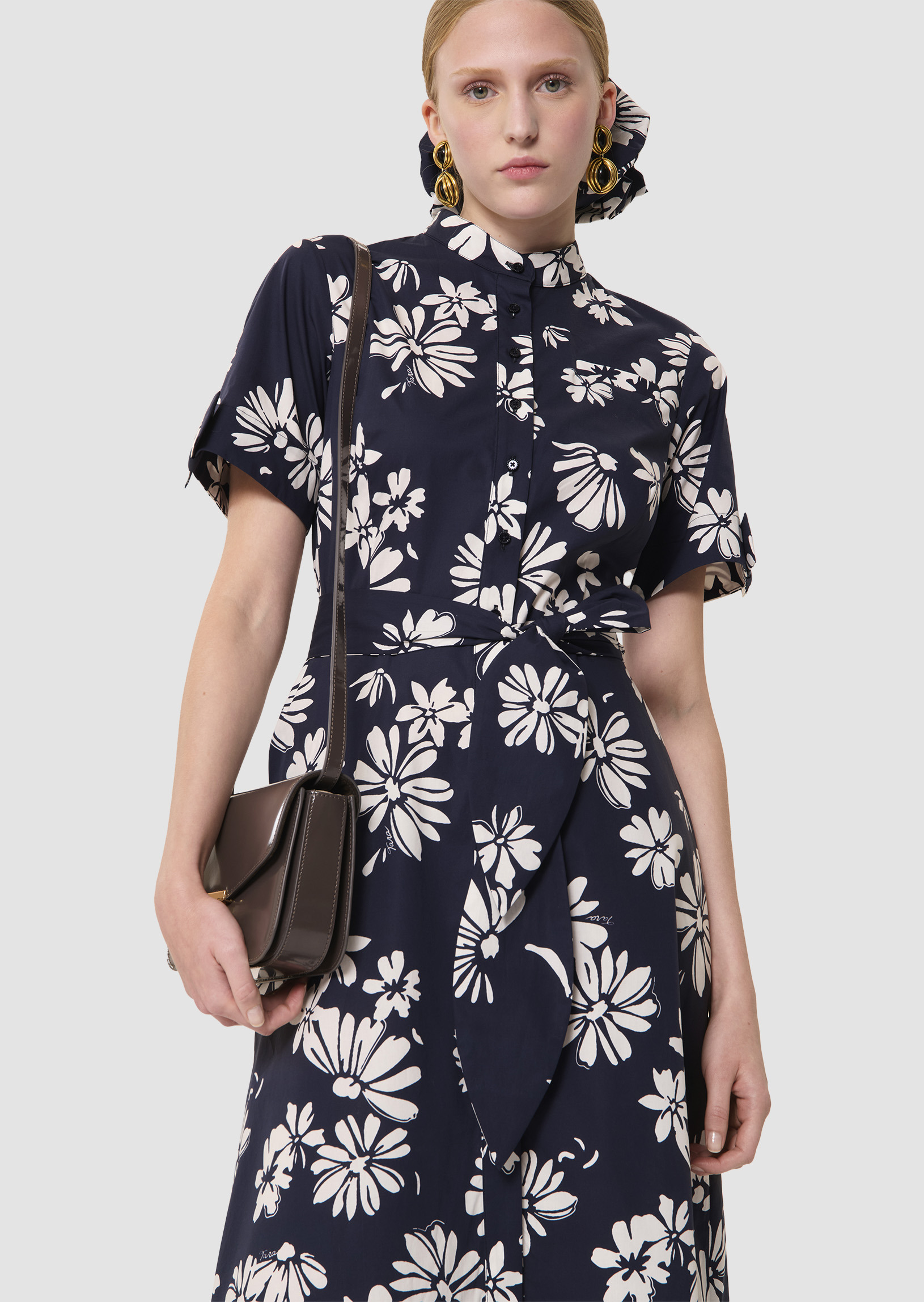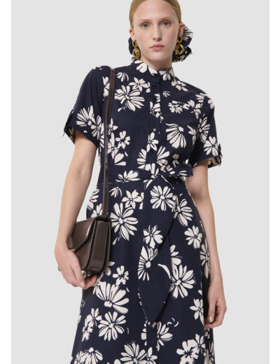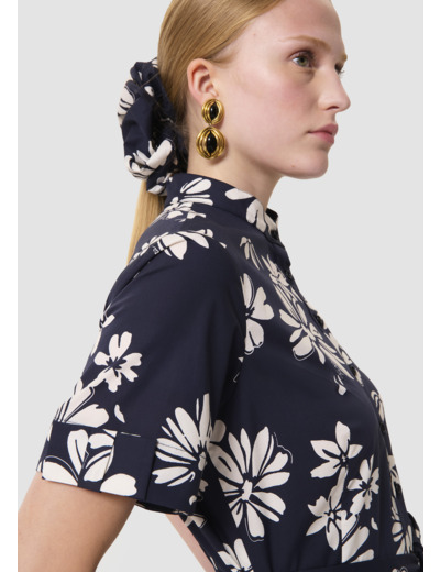 Cette robe mi-longue en popeline imprimée de notre motif fleuri sur fond bleu nuit possède un col rond ras du cou et des manches courtes à revers. Elle est ceinturée à la taille par une ceinture à nouer ton sur ton et se ferme au devant par de petits boutons ton sur ton. Elle a deux poches invisibles aux côtés. Sa touche so Tara, le petit nœud plat au revers de manche et sa jupe légèrement évasée qui lui confèrent un look romantique.
