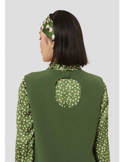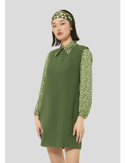 Cette robe courte couleur cactus sans manche en crêpe possède une coupe cintrée et une encolure ronde. Une large ouverture laisse découvrir le dos. Fermeture par zip invisible et un bouton pression ton sur ton au dos.