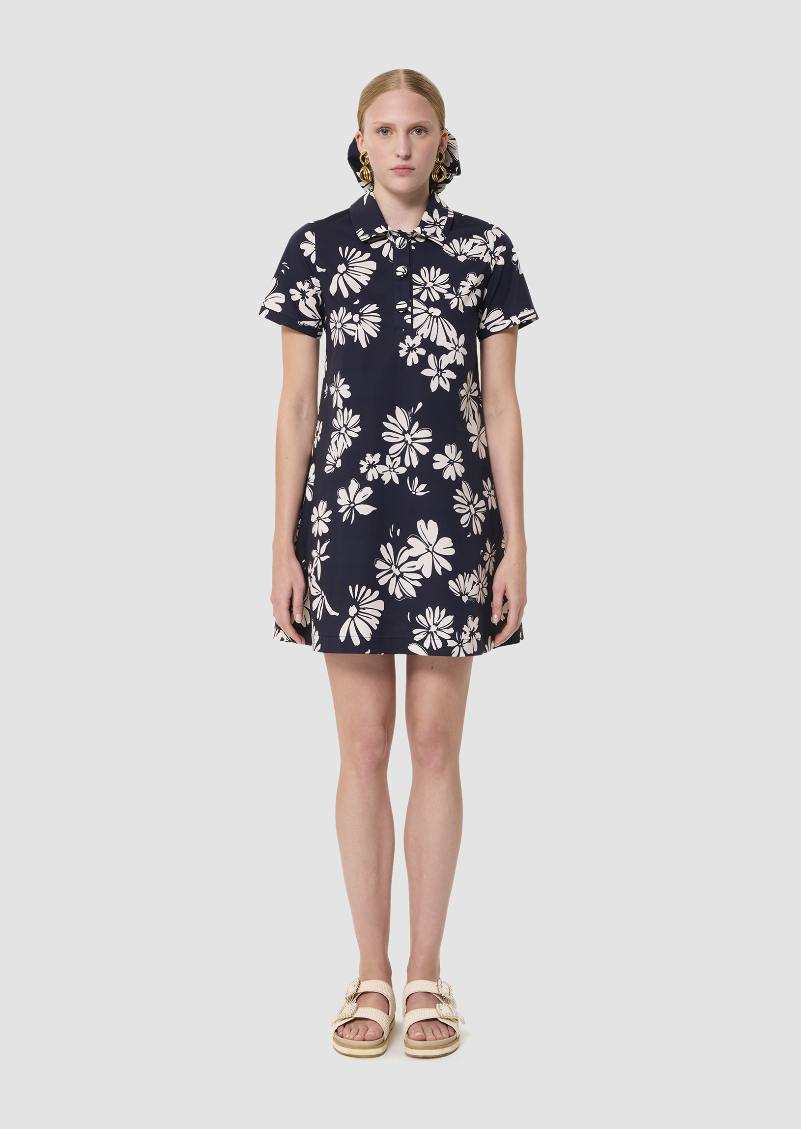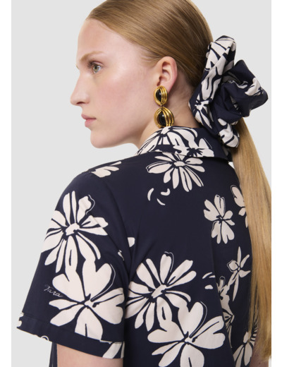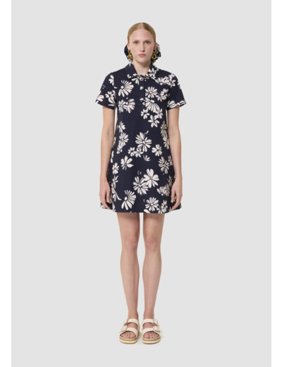 Cette robe courte possède des manches courtes et un col chemise boutonné par de gros boutons recouverts. Elle est entièrement imprimée de notre motif fleuri sur fond bleu nuit. Sa coupe trapèze lui apporte un esprit preppy.