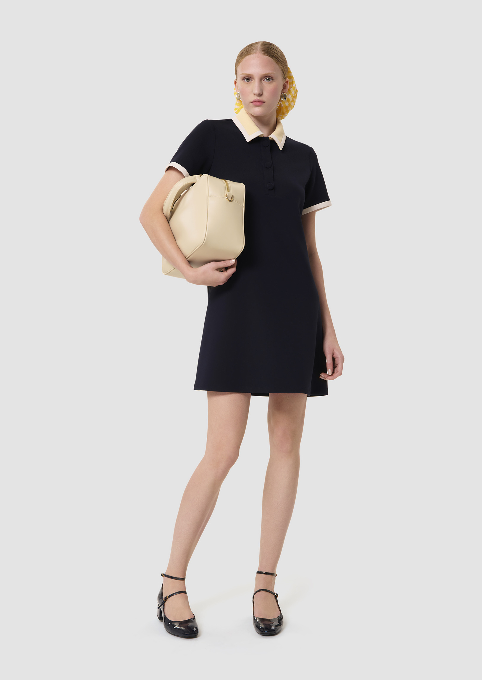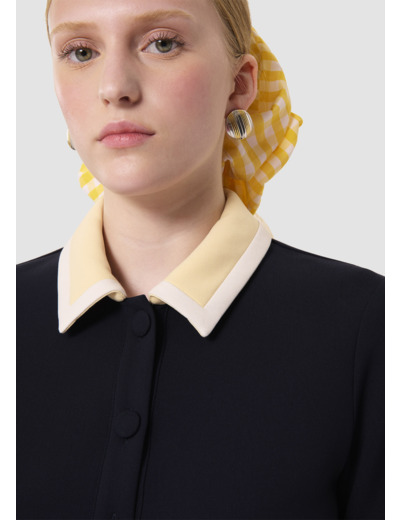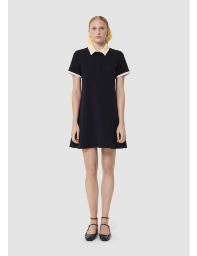Cette robe courte bleu nuit en toile double possède des manches courtes et un col chemise boutonné par des boutons recouverts ton sur ton. Ses manches et son col couleur vanille et écru, contrastent avec l'ensemble et apportent une touche de lumière. Sa coupe trapèze lui confère un esprit preppy. C'est la petite robe parfaite pour la mi-saison.