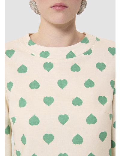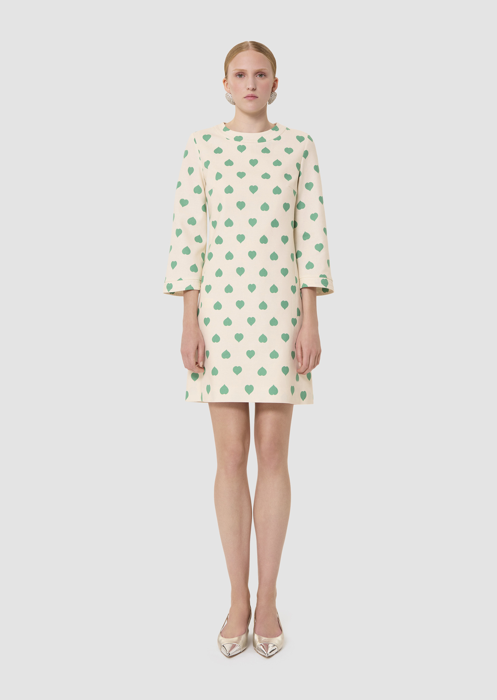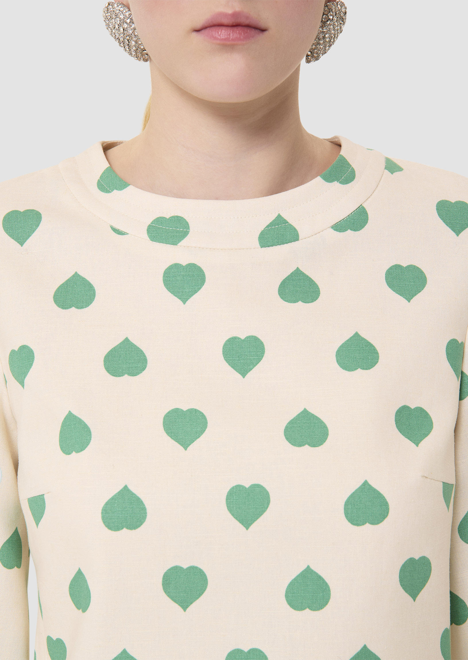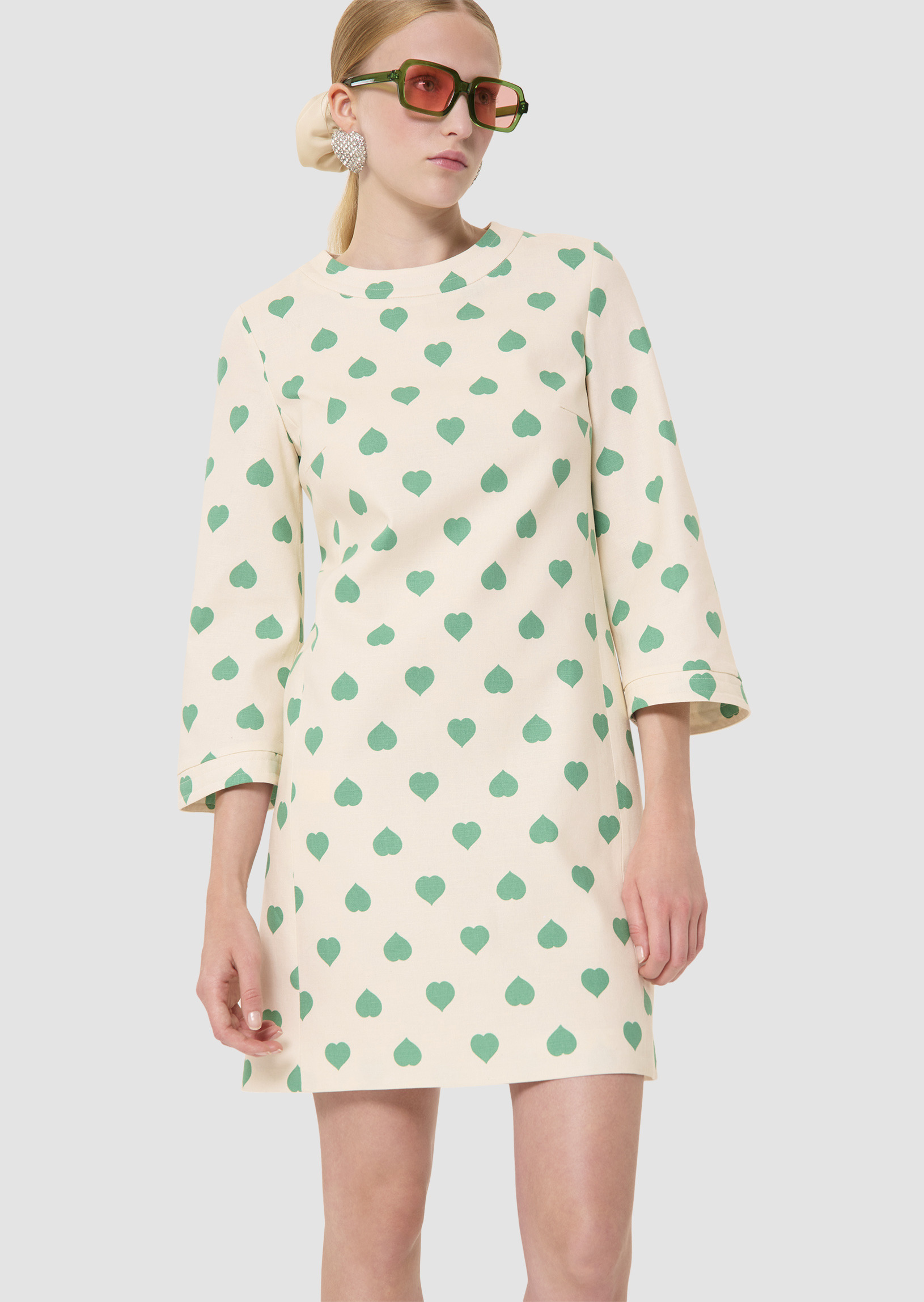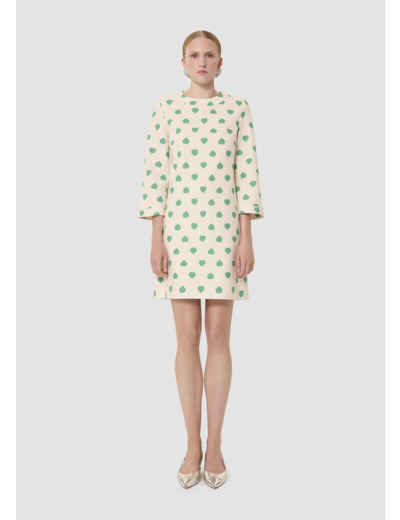 Cette robe courte en lin et coton reprend notre imprimé coeur couleur vert pistache sur fond écru. Elle possède une coupe droite légèrement cintrée à la taille, une encolure ronde et des manches 3/4 évasées.