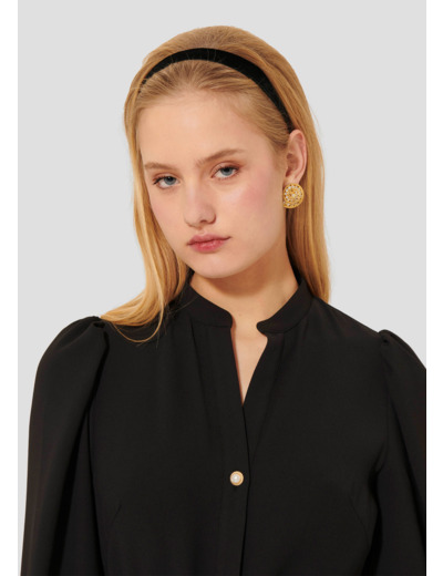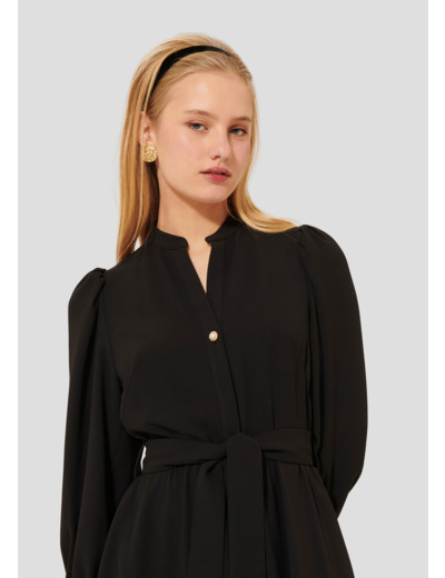 Cette longue robe noire en crêpe possède un col V et des manches longues boutonnées aux poignets. Elle est ajustable à la taille grâce à sa ceinture ton sur ton amovible. Elle se ferme au-devant par un bouton noir dissimulé ainsi qu'un joli bouton perle nacré que l'on retrouve également aux poignets.