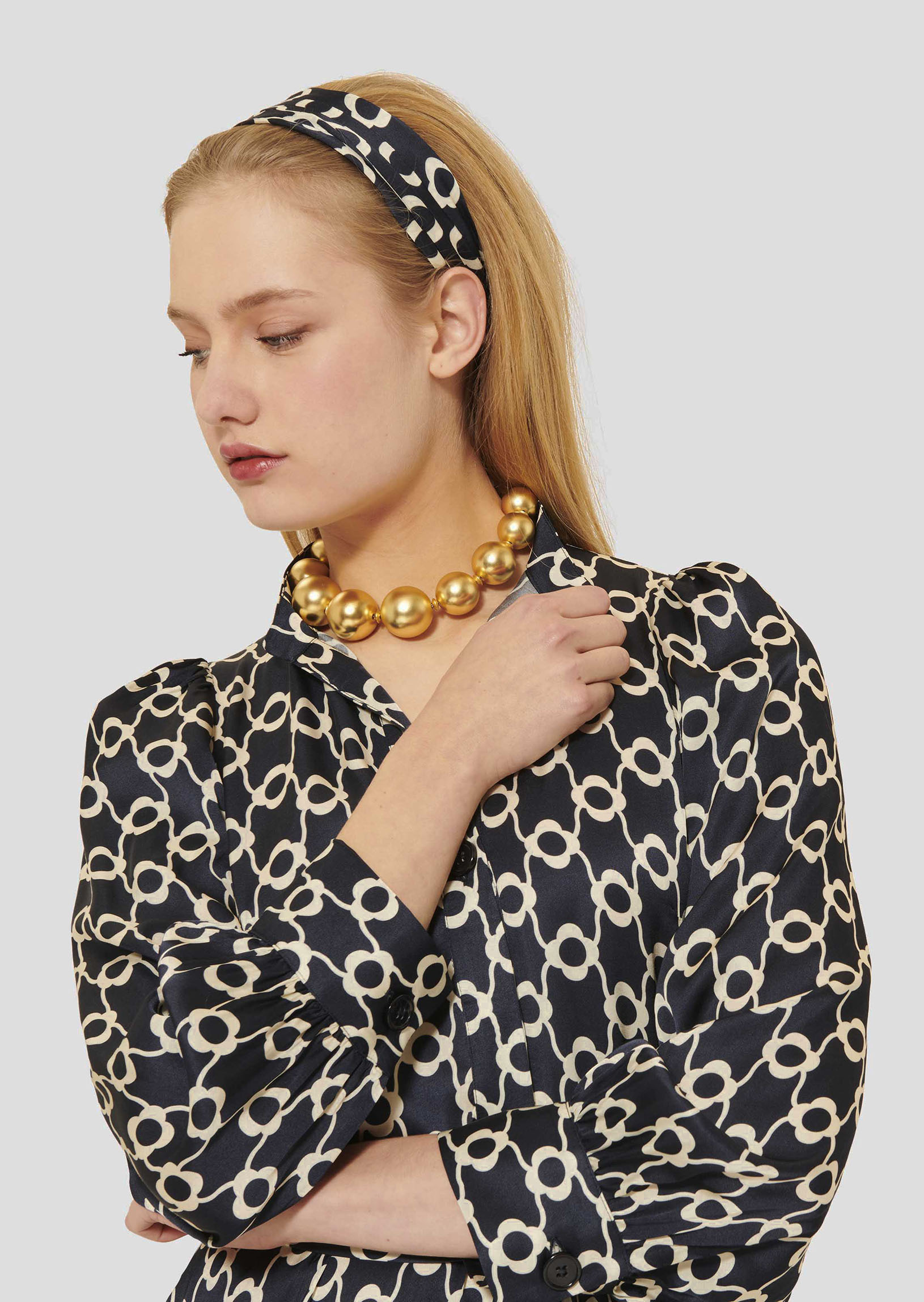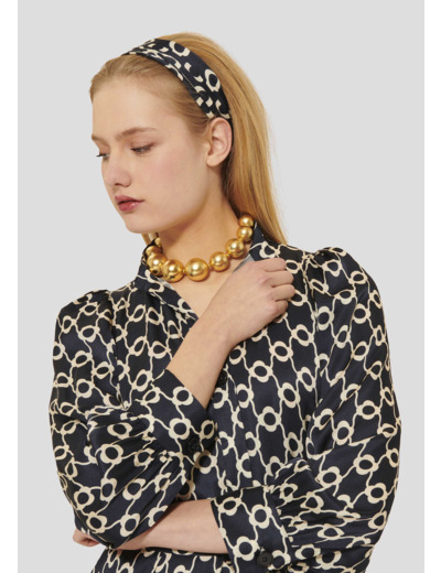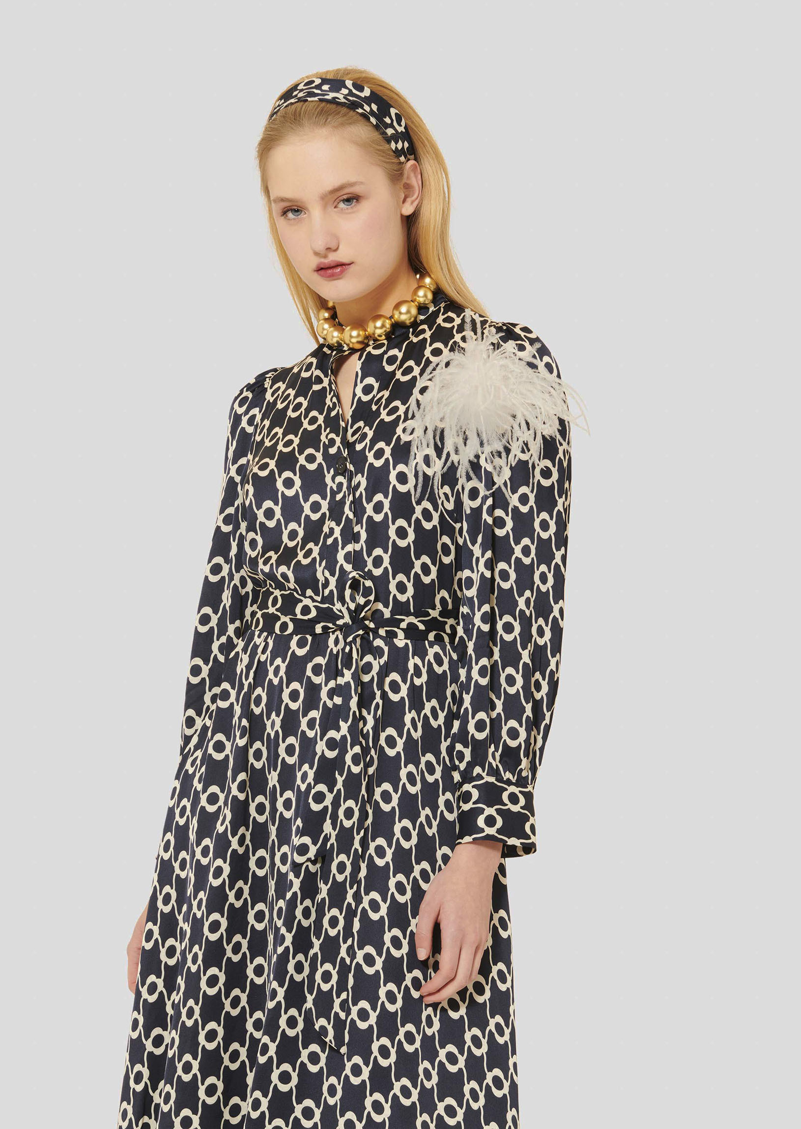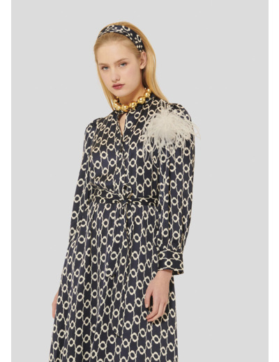 Cette longue robe coloris bleu nuit imprimée à fleurs écrues est confectionnée en crêpe et possède un col V et des manches longues boutonnées aux poignets. Elle est ajustable à la taille grâce à sa ceinture ton sur ton amovible. Elle se ferme au-devant par un bouton noir dissimulé ainsi qu'un joli bouton perle nacré que l'on retrouve également aux poignets.