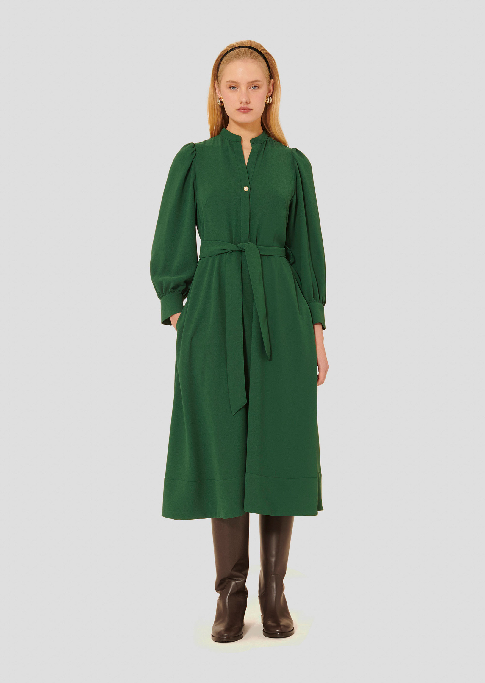 Cette longue robe verte en crêpe possède un col V et des manches longues boutonnées aux poignets. Elle est ajustable à la taille grâce à sa ceinture ton sur ton amovible. Elle se ferme au-devant par un bouton noir dissimulé ainsi qu'un joli bouton perle nacré que l'on retrouve également aux poignets.