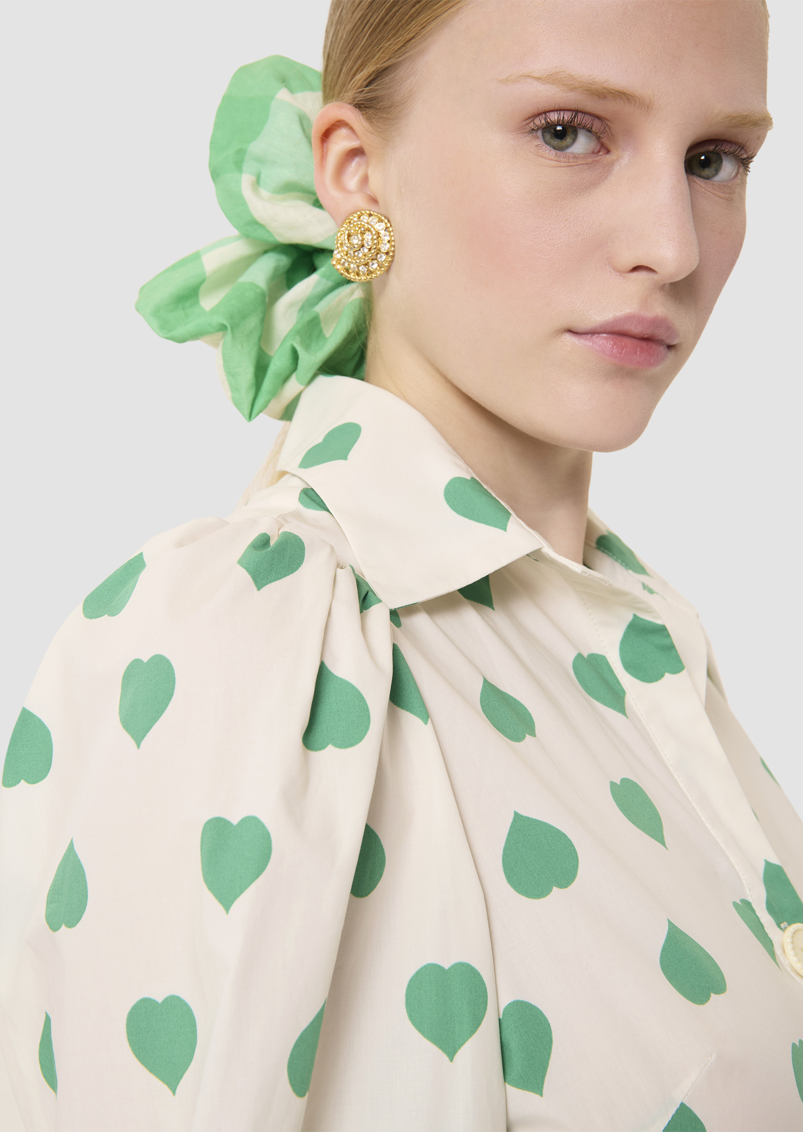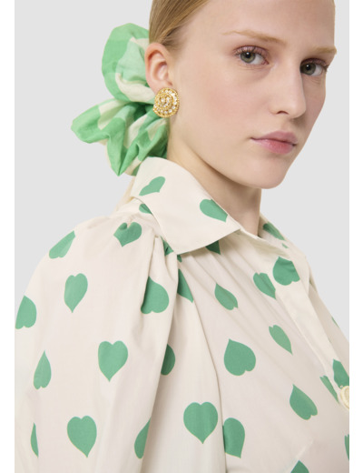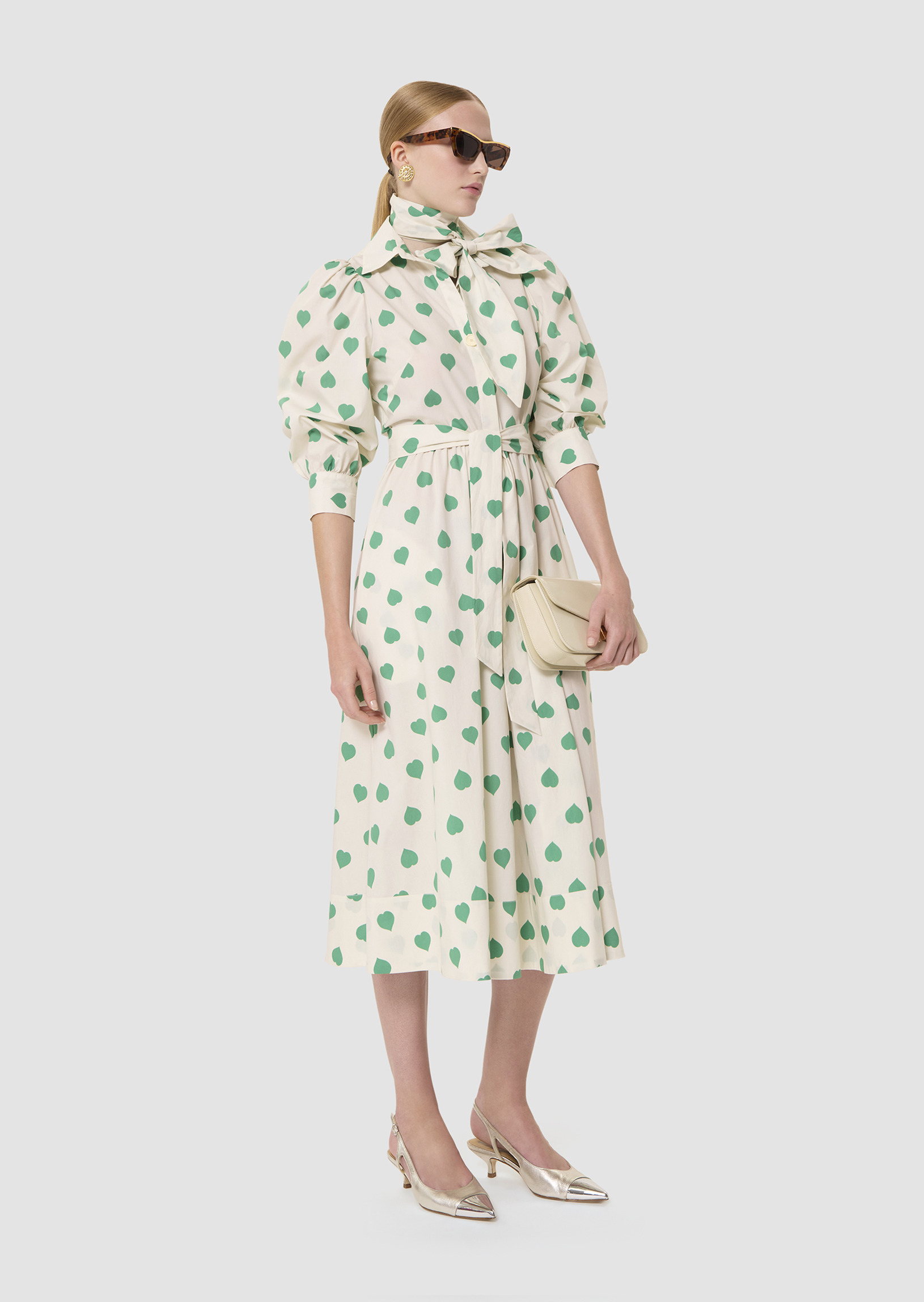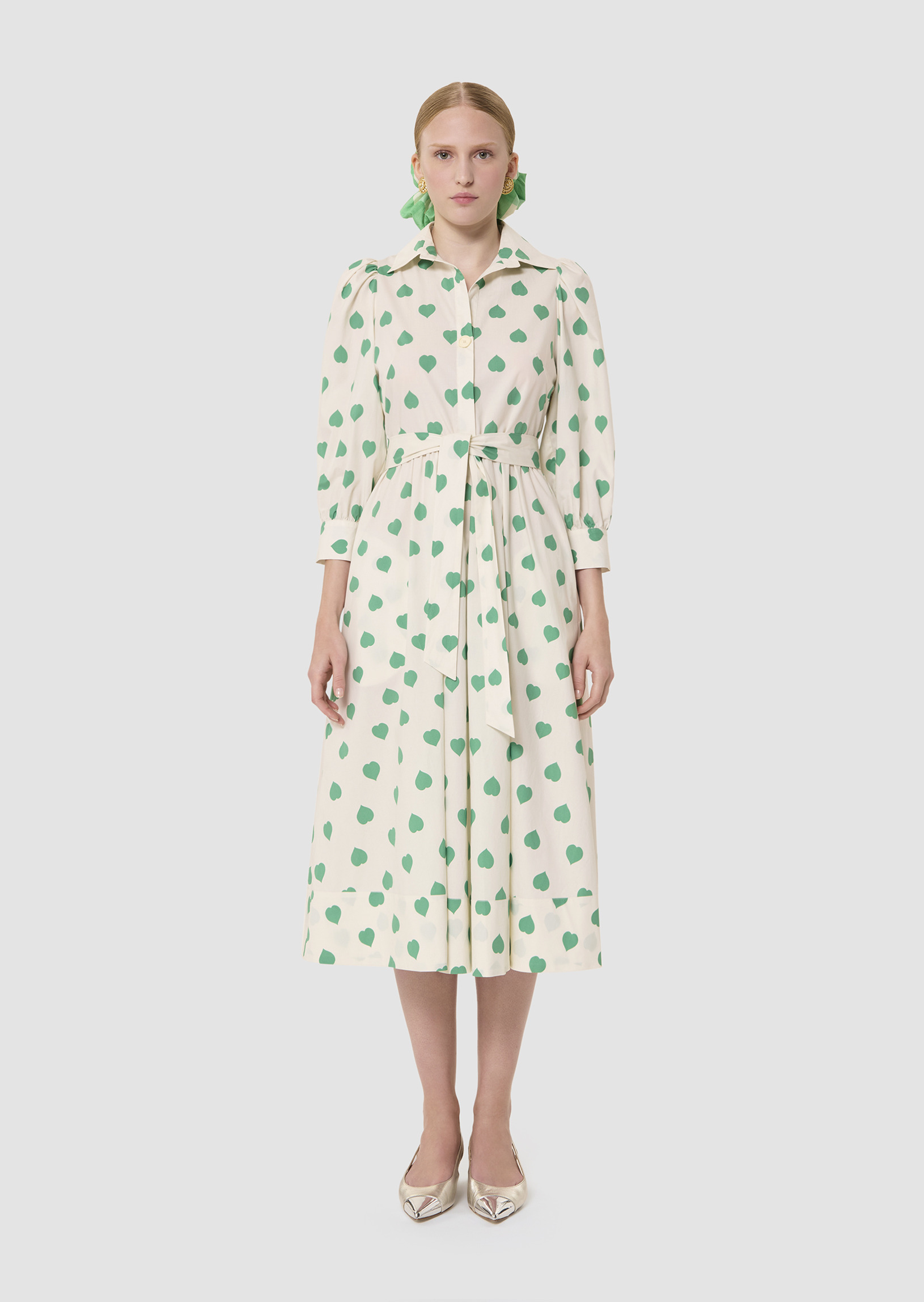 Cette longue robe reprend notre imprimé coeur couleur vert pistache sur fond écru. Confectionnée en popeline, elle possède un col chemise et des manches ballons 3/4 aux poignets boutonnés. Sa taille est marquée grâce à une ceinture ton sur ton amovible et elle se ferme entièrement au devant par de petits boutons ton sur ton. Ultra romantique, sa jupe et volantée et elle possède des poches aux côtés.