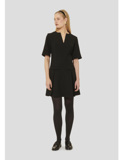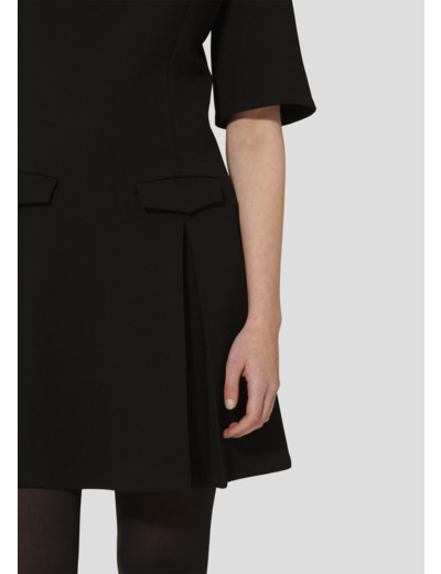 Cette robe courte noire en crêpe est légèrement évasée et possède une encolure ronde fendue ainsi que des manches courtes. Sa jupe est plissée et deux fausses poches à rabats se situent aux côtés. Elle se ferme par un zip invisible au dos.