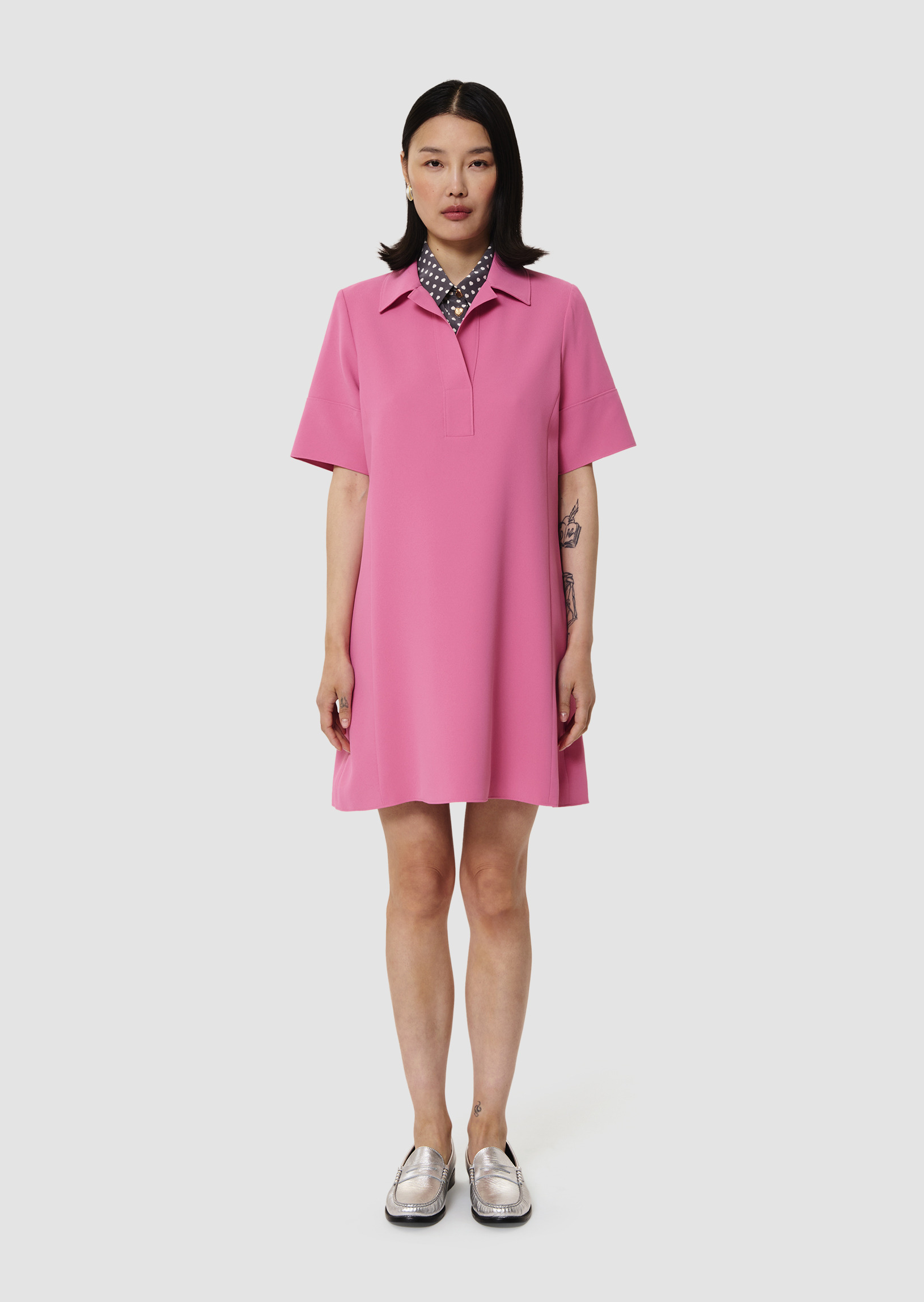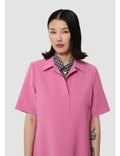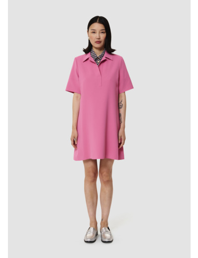 Cette robe courte rose en crêpe possède une coupe légèrement évasée, des manches courtes ainsi qu'un col chemise décolleté. Elle a de petites épaules et sa coupe droite est légèrement cintrée.