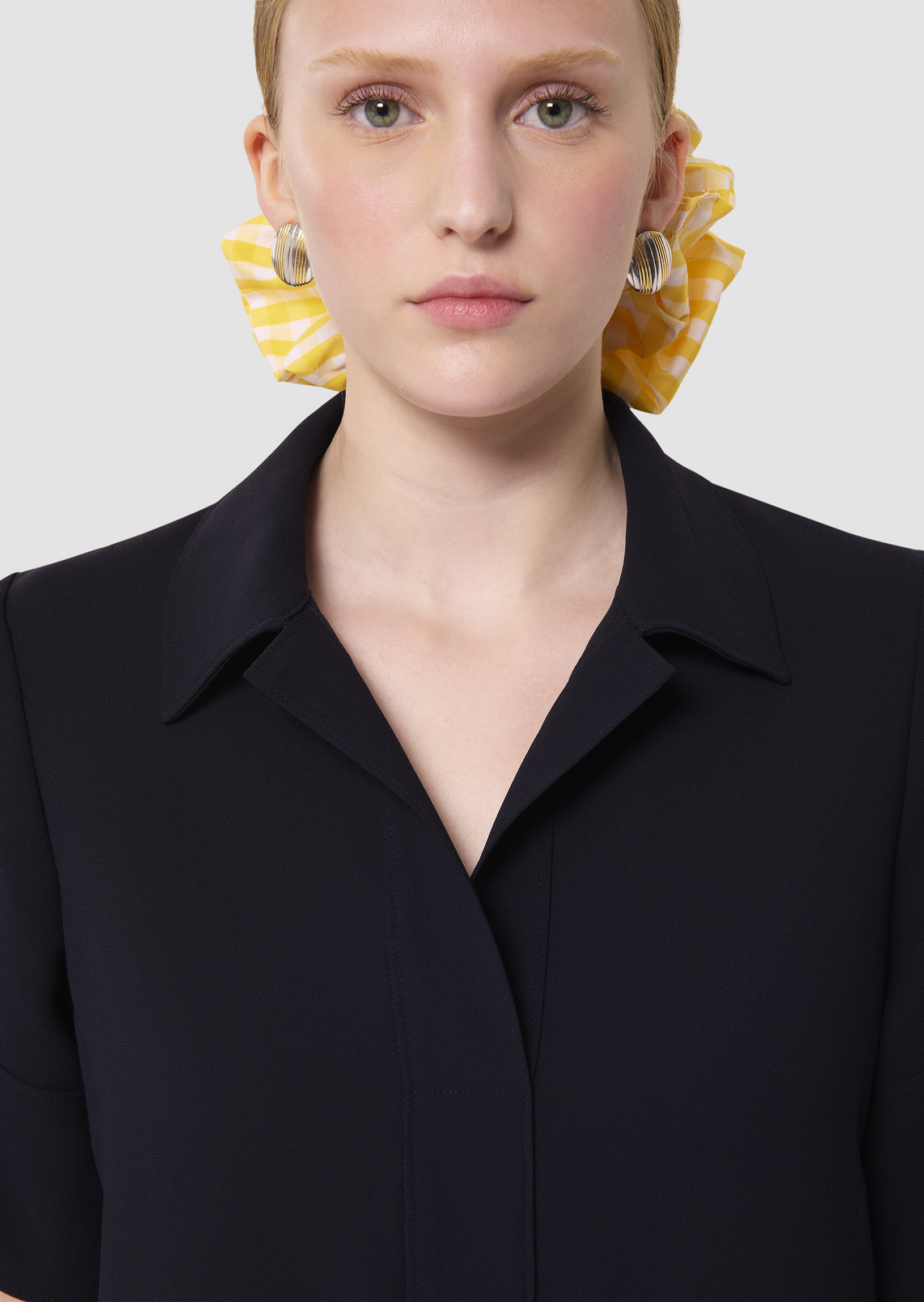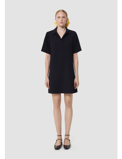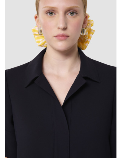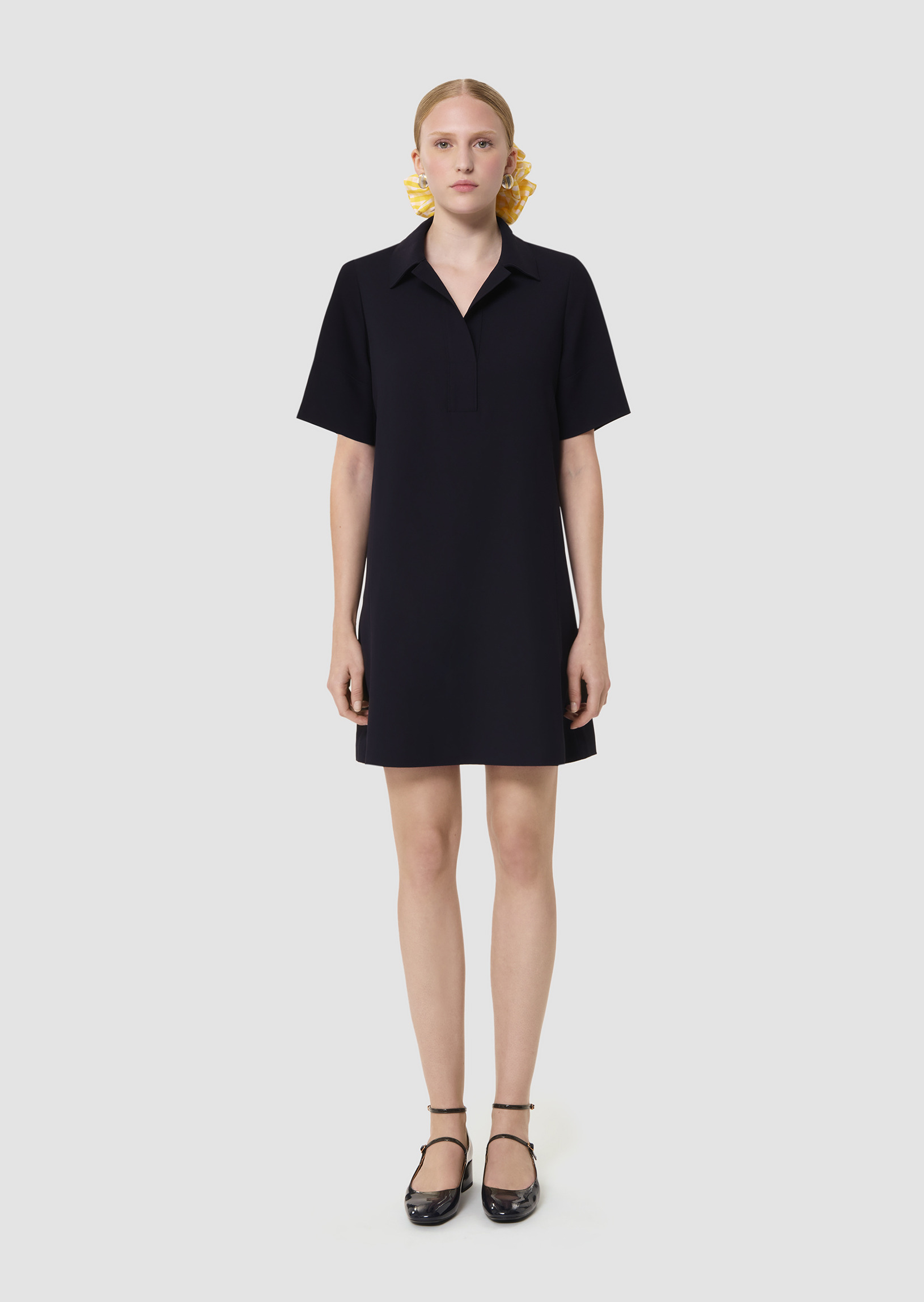 Cette robe courte bleu nuit en crêpe possède une coupe légèrement évasée, des manches courtes ainsi qu'un col chemise décolleté. Elle a de petites épaules et sa coupe droite est légèrement cintrée.