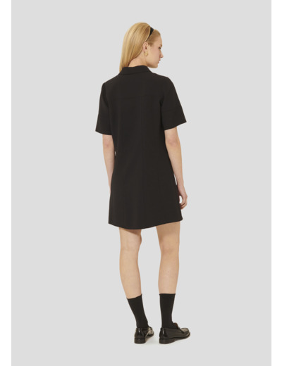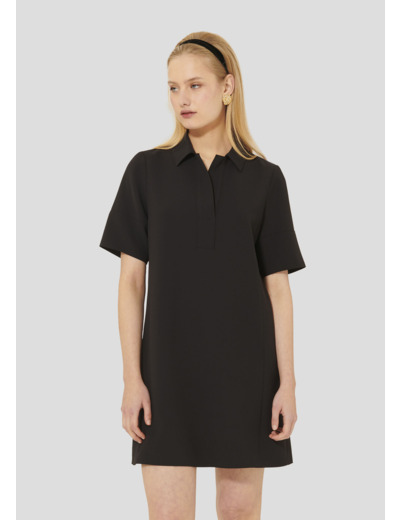 Cette courte robe noire en crêpe possède une coupe légèrement évasée, des manches courtes ainsi qu'un col chemise et une encolure en V.