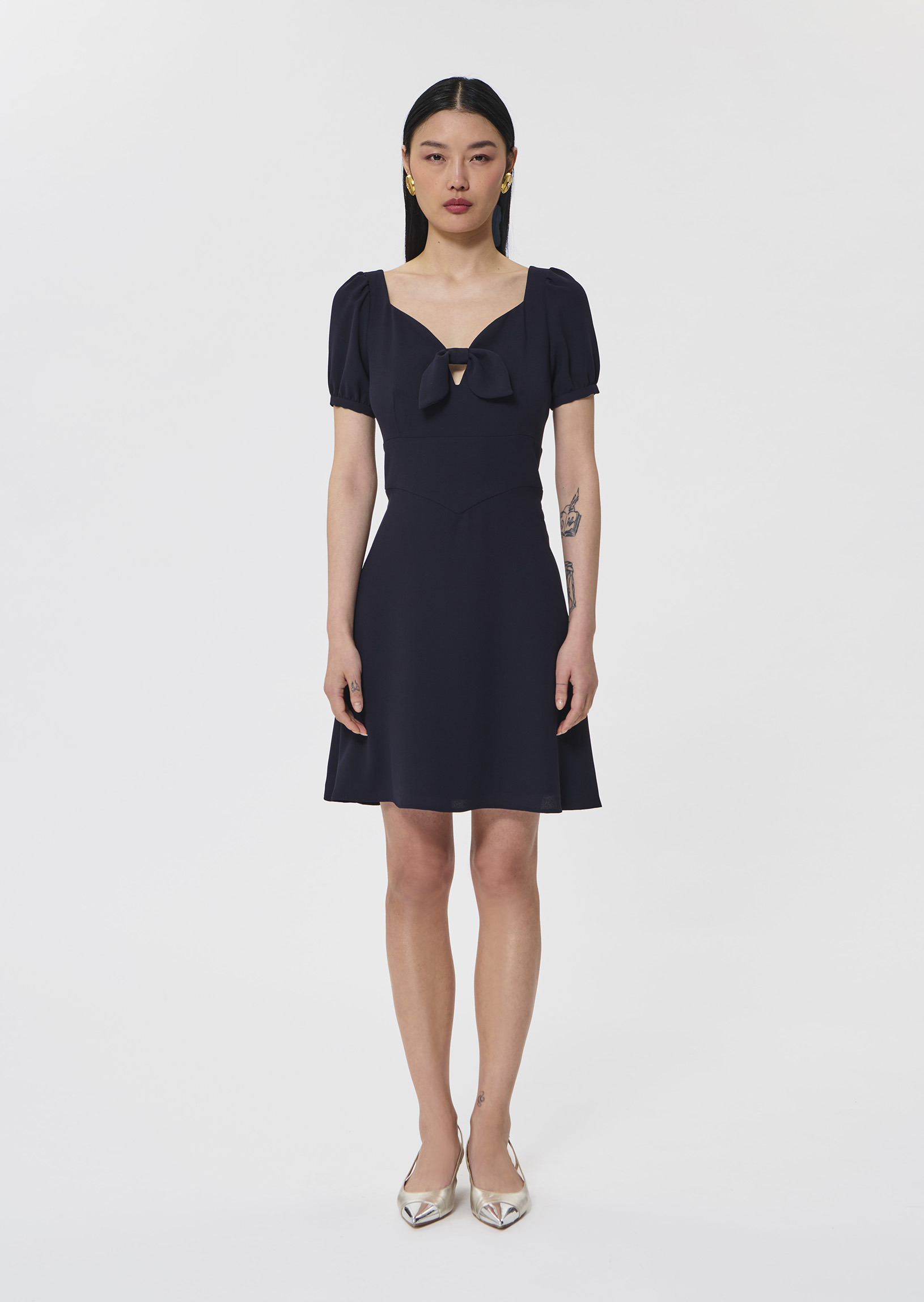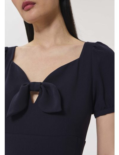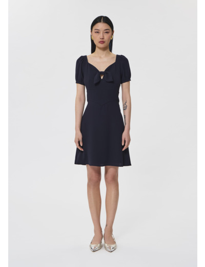 Cette robe courte bleu nuit en crêpe fluide possède une encolure coeur ornée d’un nœud ton sur ton et des manches courtes ballons décorées de boutons bijoux. Elle est marquée à la taille par un empiècement ton sur ton et est légèrement évasée au bas pour un look preppy. Fermeture par un zip invisible au dos.