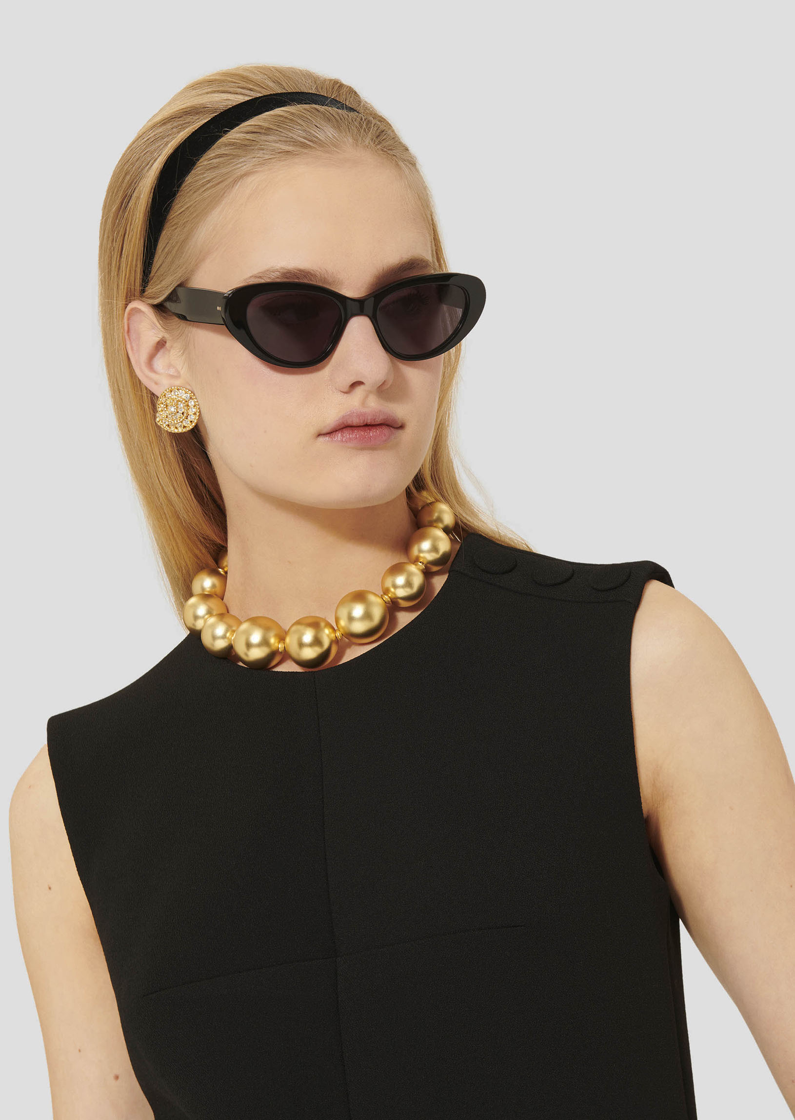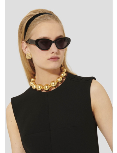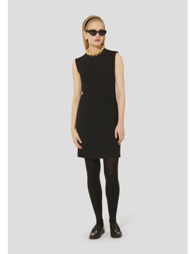 Cette robe noire en crêpe est légèrement ajustée à la taille, elle est sans manches et possède une encolure ronde. Son épaule gauche est décorée de trois boutons recouverts noirs. Elle se ferme par un zip invisible au dos.