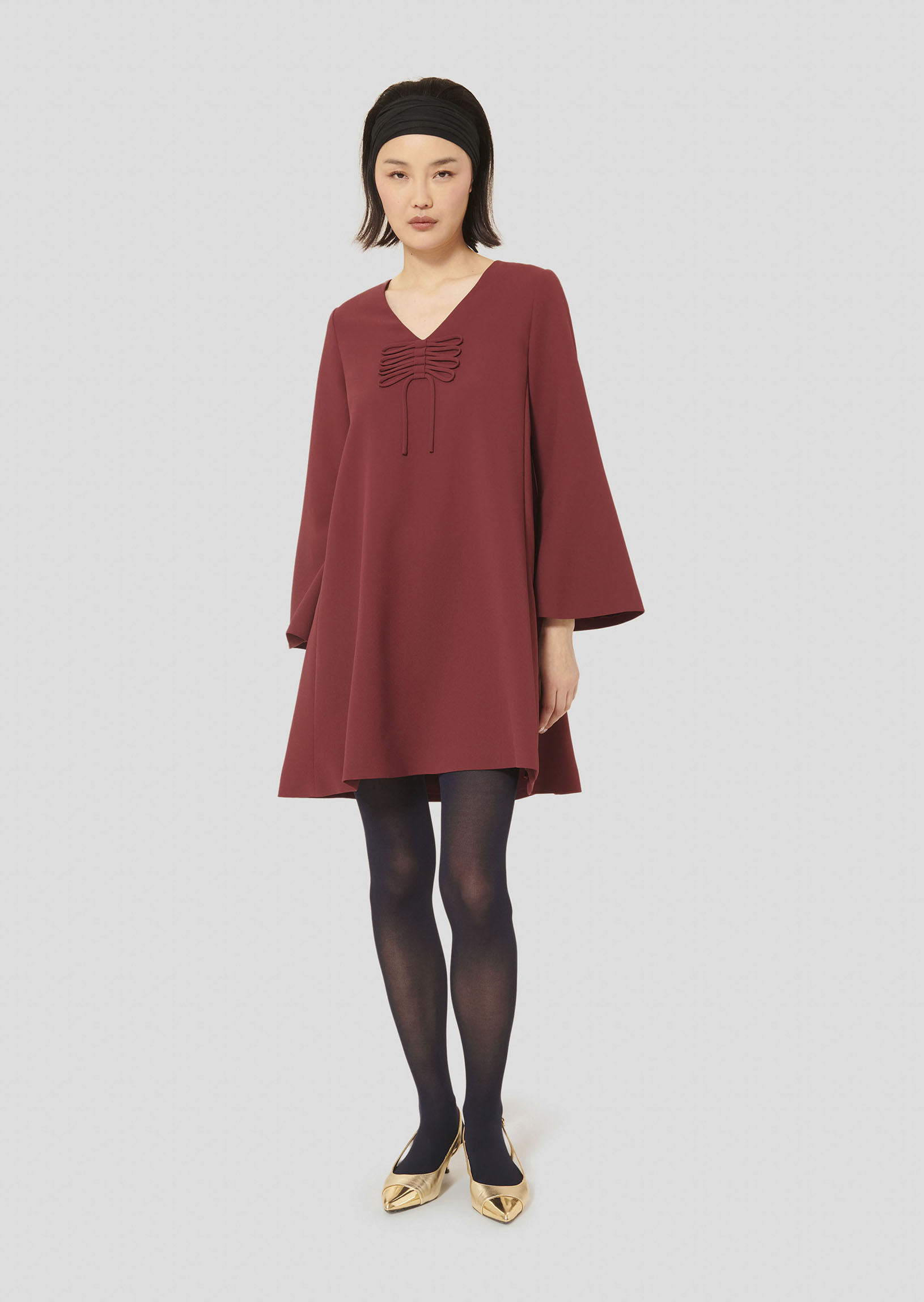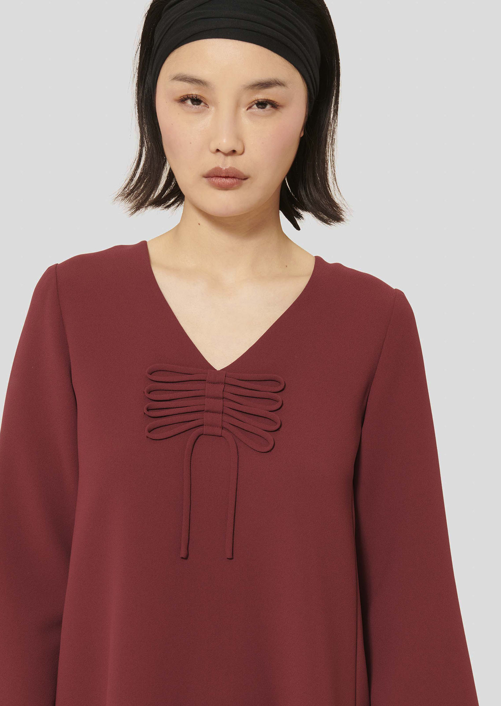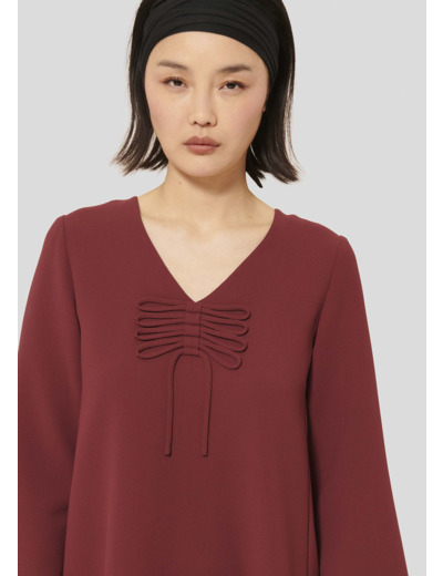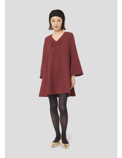 Cette robe bordeaux en crêpe possède une coupe droite, un col V et des manches longues et larges. Son twist so Tara réside dans le fin lien ton sur ton noué au-devant et décorant l'encolure. Elle se ferme par un zip invisible au dos.