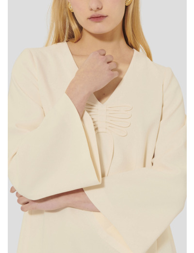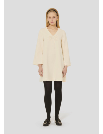 Cette robe écrue en crêpe possède une coupe droite, un col V et des manches longues et larges. Son twist so Tara réside dans le fin lien ton sur ton noué au-devant et décorant l'encolure. Elle se ferme par un zip invisible au dos.
