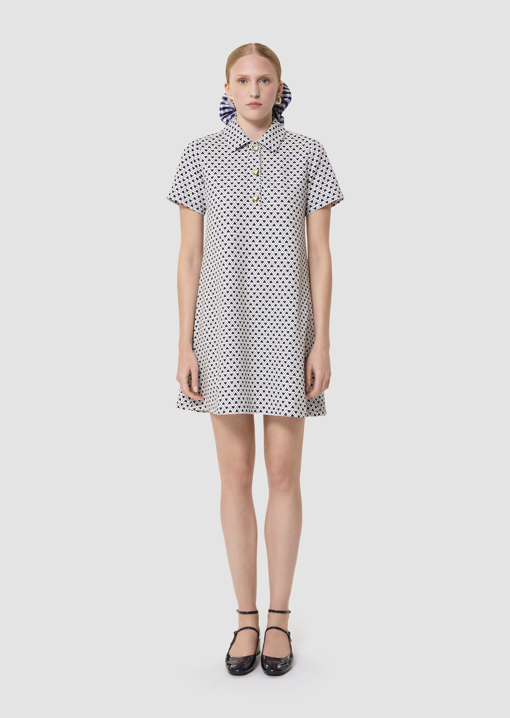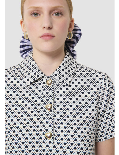 Cette robe courte écrue possède un col chemise et des manches courtes. Sa coupe trapèze et son motif mini cœurs bleu nuit sur fond craie lui donnent un esprit résolument preppy. Elle se ferme au col par trois jolis boutons dorés en forme de cœur.