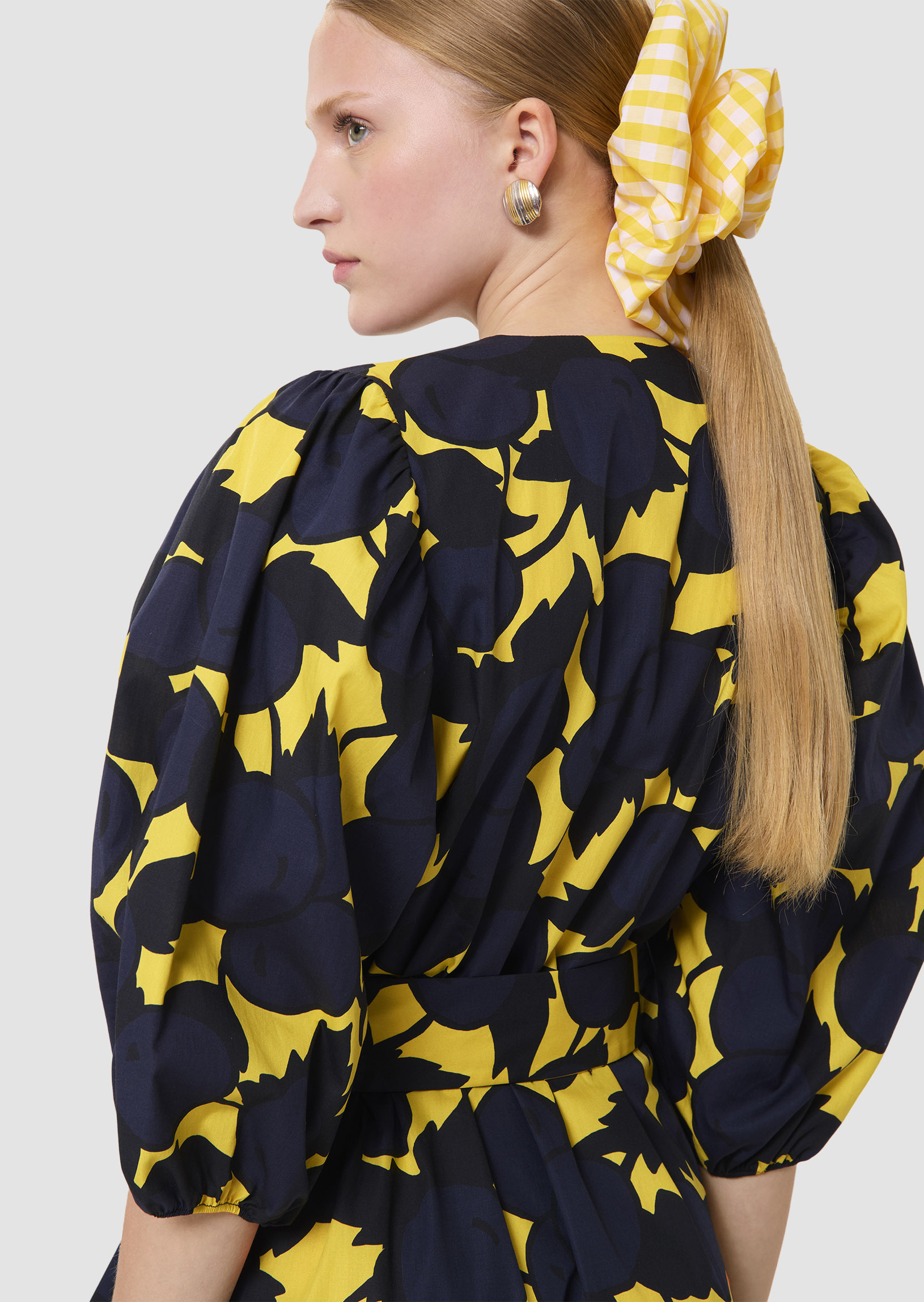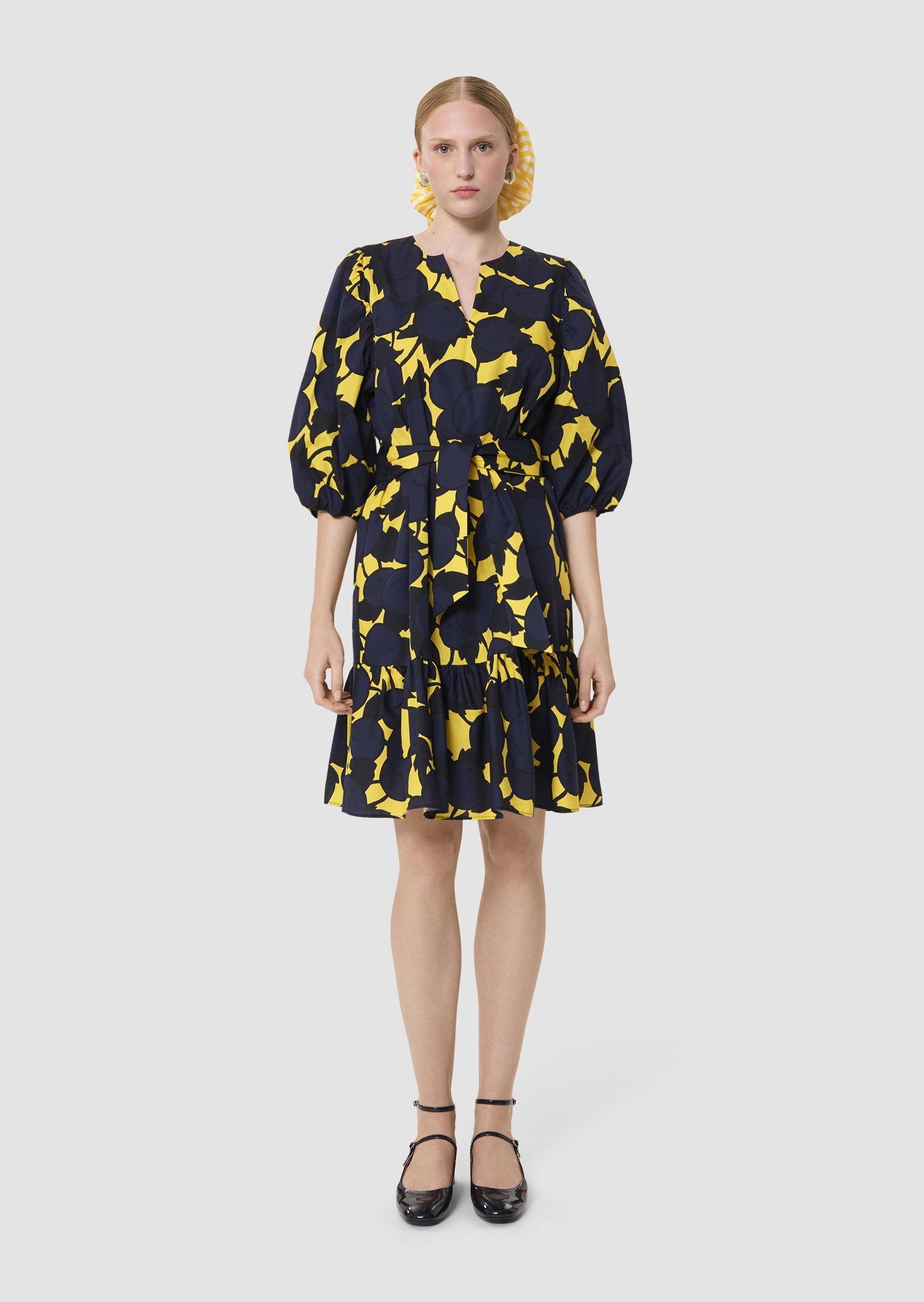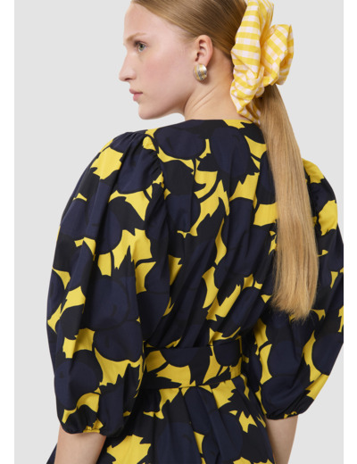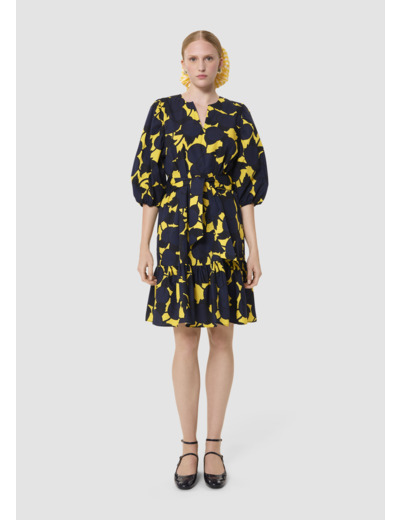 Cette robe courte possède un col rond fendu, des manches 3/4 bouffantes. Elle est ceinturée par un lien ton sur ton à nouer à la taille. Ultra romantique, elle est volantée au bas et entièrement imprimée de notre motif “big cherry” bleu nuit sur fond couleur jaune mimosa.