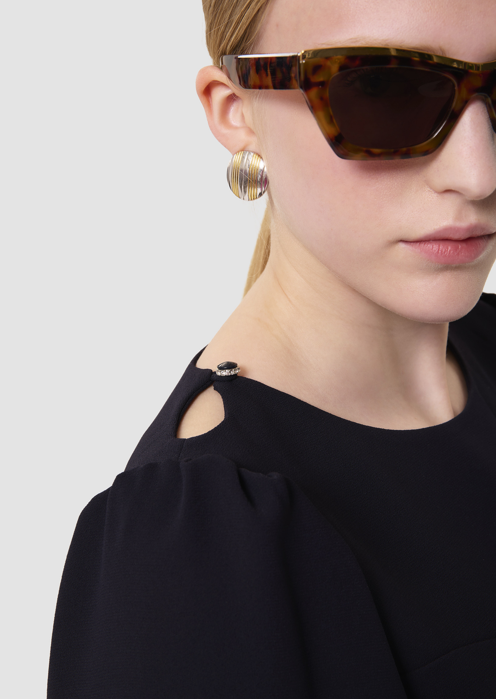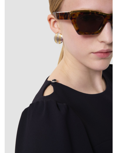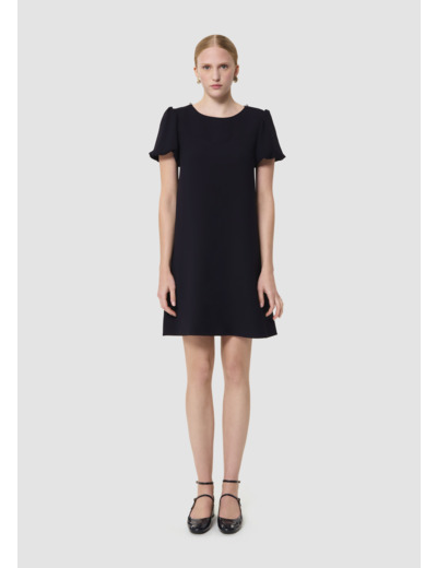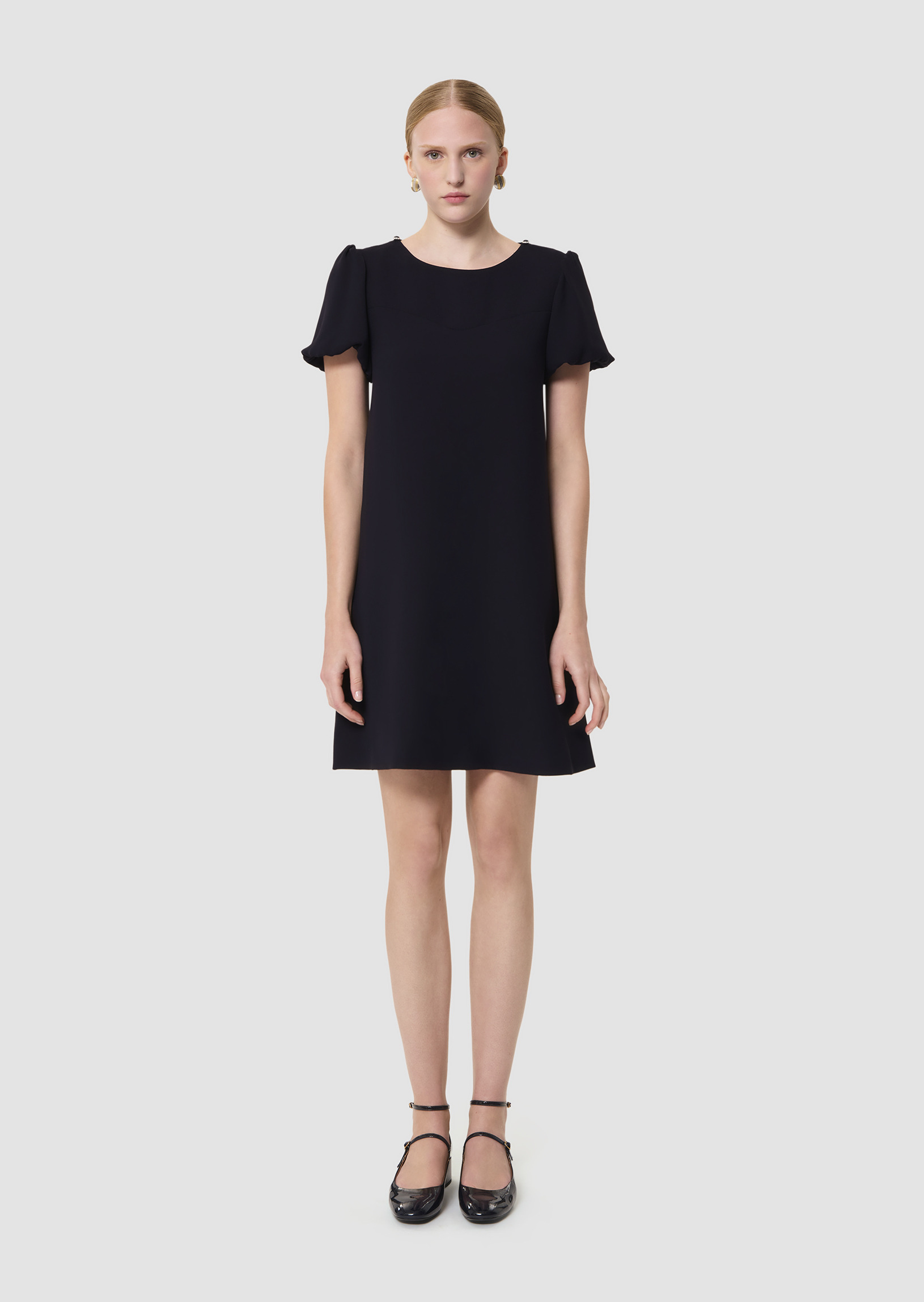 Cette robe courte bleu nuit en crêpe fluide arbore une coupe droite, un col rond et des manches ballon bouffantes. Le petit détail so chic, les épaules ajourées et ornées de boutons bijoux.