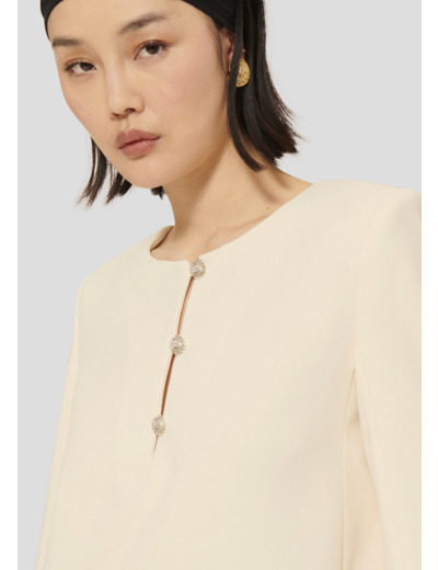 Cette robe courte écrue en crêpe possède des manches longues boutonnées aux poignets et une encolure ronde. Sa coupe droite est structurée par des épaulettes. Elle se ferme par trois jolis boutons bijous so Tara situés sous le col ainsi que par un zip invisible dans le dos.